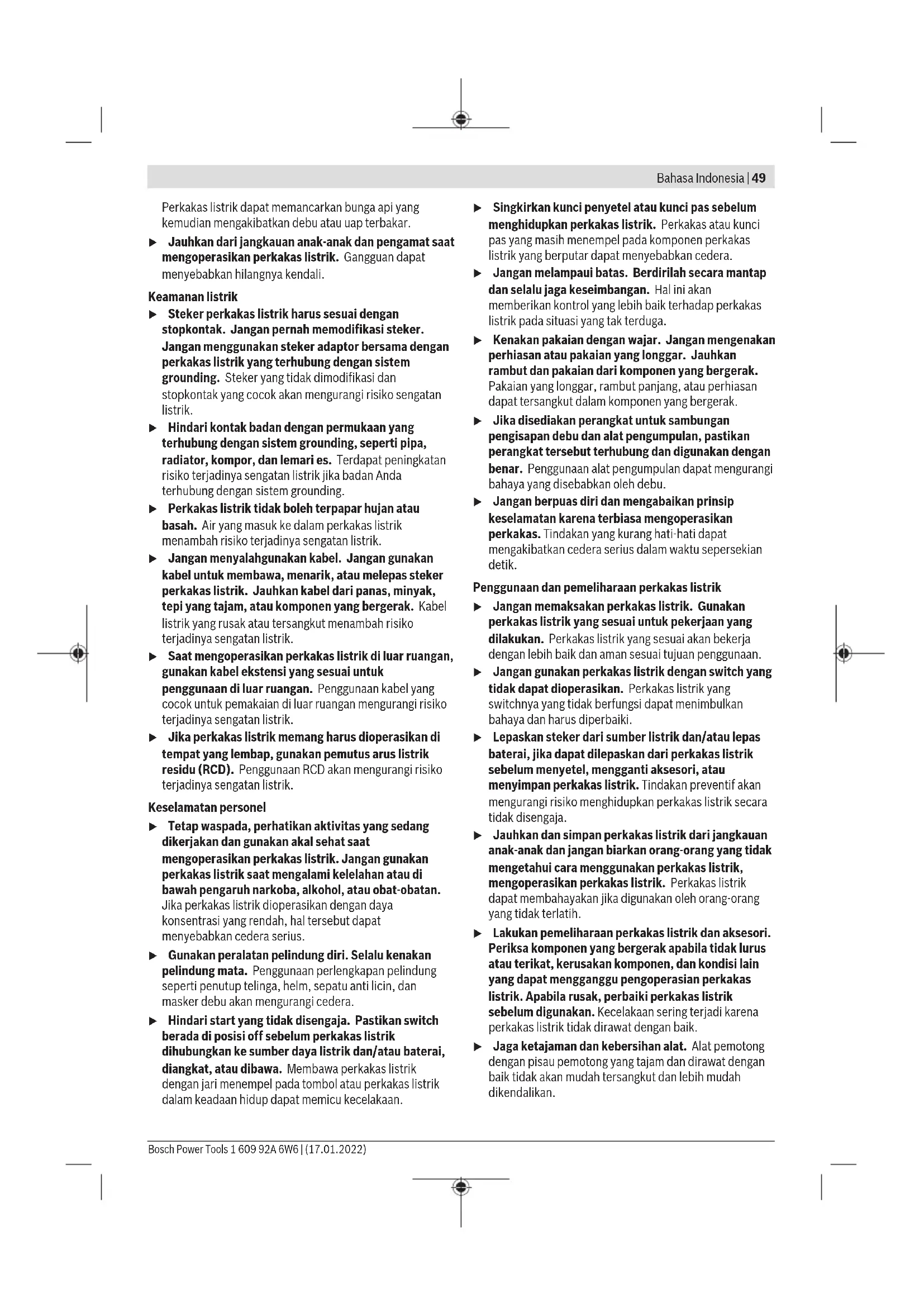 แบตเตอรี่แพ็ค/แบตเตอรี่: ลิเธียม ไอออน: กรุณาปฏิบัติตามคำแนะนำในบทการขนส่ง (ดู "การขนส่ง", หน้า48) Bahasa Indonesia Petunjuk Keselamatan Petunjuk keselamatan umum untuk perkakas listrik PERINGATAN Baca semua peringatan, petunjuk, ilustrasi, dan spesifikasi keselamatan yang diberikan bersama perkakas listrik ini. Kesalahan dalam menjalankan petunjuk di bawah ini dapat mengakibatkan sengatan listrik, kebakaran, dan/atau cedera serius. Simpanlah semua peringatan dan petunjuk untuk penggunaan di masa mendatang. Istilah "perkakas listrik" dalam peringatan mengacu pada perkakas listrik yang dioperasikan dengan listrik (menggunakan kabel) atau perkakas listrik yang dioperasikan dengan baterai (tanpa kabel). Keamanan tempat kerja u Jaga kebersihan dan pencahayaan area kerja. Area yang berantakan atau gelap dapat memicu kecelakaan. u Jangan mengoperasikan perkakas listrik di lingkungan yang dapat memicu ledakan, seperti adanya cairan, gas, atau debu yang mudah terbakar. 1 609 92A 6W6 | (17.01.2022) Bosch Power ToolsBahasa Indonesia | 49 Perkakas listrik dapat memancarkan bunga api yang kemudian mengakibatkan debu atau uap terbakar. u Jauhkan dari jangkauan anak-anak dan pengamat saat mengoperasikan perkakas listrik. Gangguan dapat menyebabkan hilangnya kendali. Keamanan listrik u Steker perkakas listrik harus sesuai dengan stopkontak. Jangan pernah memodifikasi steker. Jangan menggunakan steker adaptor bersama dengan perkakas listrik yang terhubung dengan sistem grounding. Steker yang tidak dimodifikasi dan stopkontak yang cocok akan mengurangi risiko sengatan listrik. u Hindari kontak badan dengan permukaan yang terhubung dengan sistem grounding, seperti pipa, radiator, kompor, dan lemari es. Terdapat peningkatan risiko terjadinya sengatan listrik jika badan Anda terhubung dengan sistem grounding. u Perkakas listrik tidak boleh terpapar hujan atau basah. Air yang masuk ke dalam perkakas listrik menambah risiko terjadinya sengatan listrik. u Jangan menyalahgunakan kabel. Jangan gunakan kabel untuk membawa, menarik, atau melepas steker perkakas listrik. Jauhkan kabel dari panas, minyak, tepi yang tajam, atau komponen yang bergerak. Kabel listrik yang rusak atau tersangkut menambah risiko terjadinya sengatan listrik. u Saat mengoperasikan perkakas listrik di luar ruangan, gunakan kabel ekstensi yang sesuai untuk penggunaan di luar ruangan. Penggunaan kabel yang cocok untuk pemakaian di luar ruangan mengurangi risiko terjadinya sengatan listrik. u Jika perkakas listrik memang harus dioperasikan di tempat yang lembap, gunakan pemutus arus listrik residu (RCD). Penggunaan RCD akan mengurangi risiko terjadinya sengatan listrik. Keselamatan personel u Tetap waspada, perhatikan aktivitas yang sedang dikerjakan dan gunakan akal sehat saat mengoperasikan perkakas listrik. Jangan gunakan perkakas listrik saat mengalami kelelahan atau di bawah pengaruh narkoba, alkohol, atau obat-obatan. Jika perkakas listrik dioperasikan dengan daya konsentrasi yang rendah, hal tersebut dapat menyebabkan cedera serius. u Gunakan peralatan pelindung diri. Selalu kenakan pelindung mata. Penggunaan perlengkapan pelindung seperti penutup telinga, helm, sepatu anti licin, dan masker debu akan mengurangi cedera. u Hindari start yang tidak disengaja. Pastikan switch berada di posisi off sebelum perkakas listrik dihubungkan ke sumber daya listrik dan/atau baterai, diangkat, atau dibawa. Membawa perkakas listrik dengan jari menempel pada tombol atau perkakas listrik dalam keadaan hidup dapat memicu kecelakaan. u Singkirkan kunci penyetel atau kunci pas sebelum menghidupkan perkakas listrik. Perkakas atau kunci pas yang masih menempel pada komponen perkakas listrik yang berputar dapat menyebabkan cedera. u Jangan melampaui batas. Berdirilah secara mantap dan selalu jaga keseimbangan. Hal ini akan memberikan kontrol yang lebih baik terhadap perkakas listrik pada situasi yang tak terduga. u Kenakan pakaian dengan wajar. Jangan mengenakan perhiasan atau pakaian yang longgar. Jauhkan rambut dan pakaian dari komponen yang bergerak. Pakaian yang longgar, rambut panjang, atau perhiasan dapat tersangkut dalam komponen yang bergerak. u Jika disediakan perangkat untuk sambungan pengisapan debu dan alat pengumpulan, pastikan perangkat tersebut terhubung dan digunakan dengan benar. Penggunaan alat pengumpulan dapat mengurangi bahaya yang disebabkan oleh debu. u Jangan berpuas diri dan mengabaikan prinsip keselamatan karena terbiasa mengoperasikan perkakas. Tindakan yang kurang hati-hati dapat mengakibatkan cedera serius dalam waktu sepersekian detik. Penggunaan dan pemeliharaan perkakas listrik u Jangan memaksakan perkakas listrik. Gunakan perkakas listrik yang sesuai untuk pekerjaan yang dilakukan. Perkakas listrik yang sesuai akan bekerja dengan lebih baik dan aman sesuai tujuan penggunaan. u Jangan gunakan perkakas listrik dengan switch yang tidak dapat dioperasikan. Perkakas listrik yang switchnya yang tidak berfungsi dapat menimbulkan bahaya dan harus diperbaiki. u Lepaskan steker dari sumber listrik dan/atau lepas baterai, jika dapat dilepaskan dari perkakas listrik sebelum menyetel, mengganti aksesori, atau menyimpan perkakas listrik. Tindakan preventif akan mengurangi risiko menghidupkan perkakas listrik secara tidak disengaja. u Jauhkan dan simpan perkakas listrik dari jangkauan anak-anak dan jangan biarkan orang-orang yang tidak mengetahui cara menggunakan perkakas listrik, mengoperasikan perkakas listrik. Perkakas listrik dapat membahayakan jika digunakan oleh orang-orang yang tidak terlatih. u Lakukan pemeliharaan perkakas listrik dan aksesori. Periksa komponen yang bergerak apabila tidak lurus atau terikat, kerusakan komponen, dan kondisi lain yang dapat mengganggu pengoperasian perkakas listrik. Apabila rusak, perbaiki perkakas listrik sebelum digunakan. Kecelakaan serin