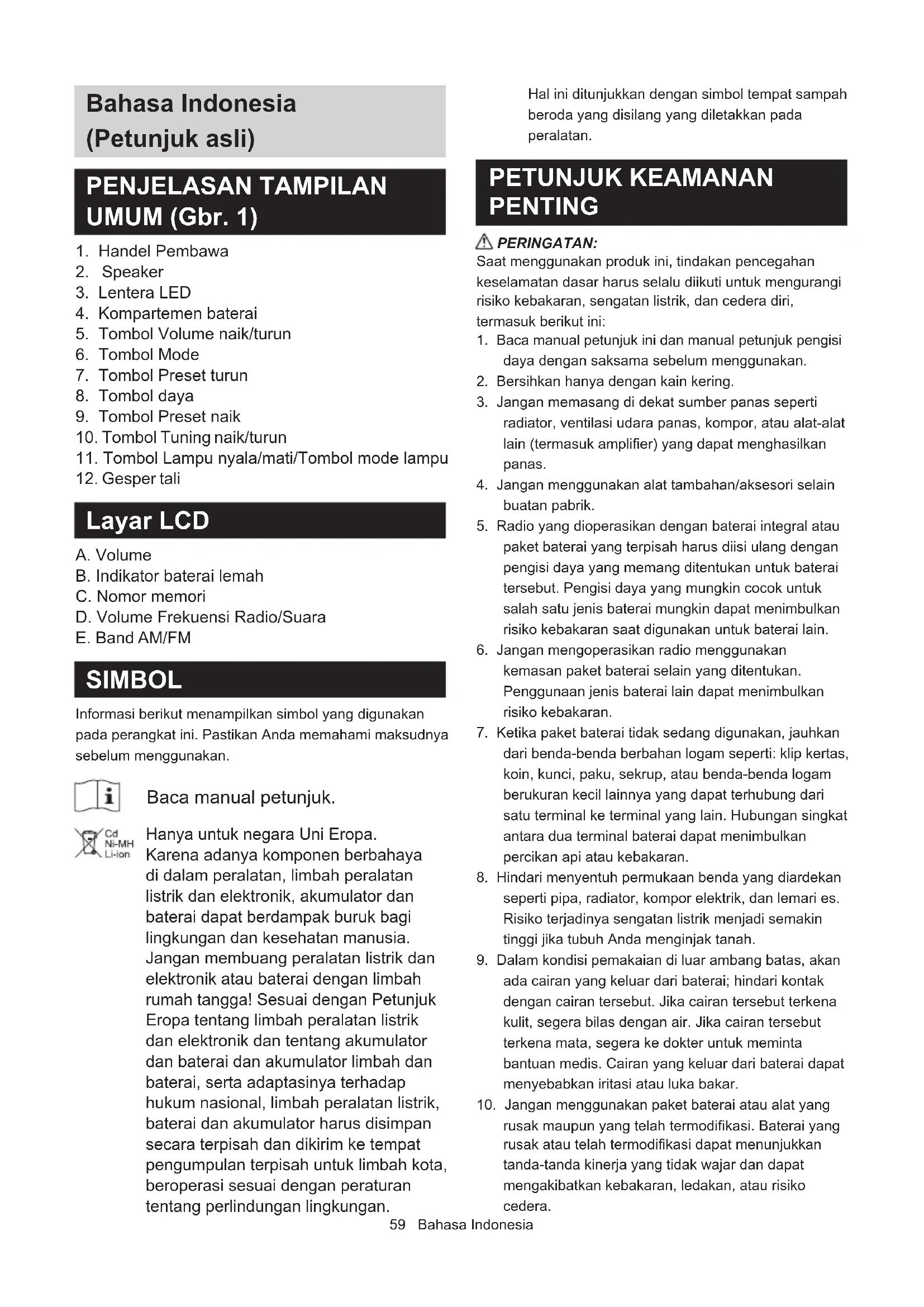 Layar LCD A. Volume B. Indikator baterai lemah C. Nomor memori D. Volume Frekuensi Radio/Suara E. Band AM/FM SIMBOL Informasi berikut menampilkan simbol yang digunakan pada perangkat ini. Pastikan Anda memahami maksudnya sebelum menggunakan. Baca manual petunjuk. Hanya untuk negara Uni Eropa. Karena adanya komponen berbahaya di dalam peralatan, limbah peralatan listrik dan elektronik, akumulator dan baterai dapat berdampak buruk bagi lingkungan dan kesehatan manusia. Jangan membuang peralatan listrik dan elektronik atau baterai dengan limbah rumah tangga! Sesuai dengan Petunjuk Eropa tentang limbah peralatan listrik dan elektronik dan tentang akumulator dan baterai dan akumulator limbah dan baterai, serta adaptasinya terhadap hukum nasional, limbah peralatan listrik, baterai dan akumulator harus disimpan secara terpisah dan dikirim ke tempat pengumpulan terpisah untuk limbah kota, beroperasi sesuai dengan peraturan tentang perlindungan lingkungan. Hal ini ditunjukkan dengan simbol tempat sampah beroda yang disilang yang diletakkan pada peralatan. PETUNJUK KEAMANAN PENTING PERINGATAN: Saat menggunakan produk ini, tindakan pencegahan keselamatan dasar harus selalu diikuti untuk mengurangi risiko kebakaran, sengatan listrik, dan cedera diri, termasuk berikut ini: