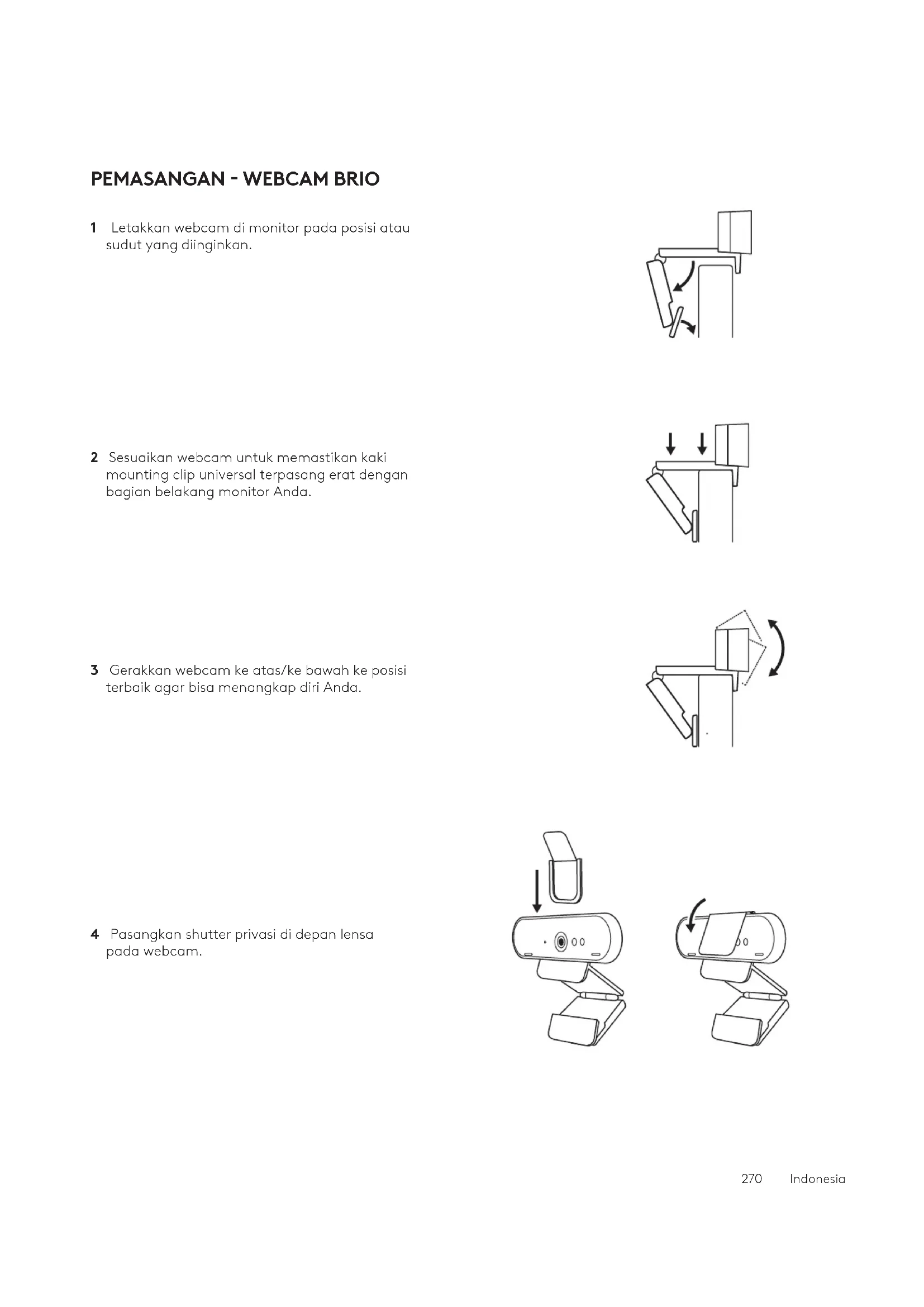 FITUR LOGI DOCK WEBCAM BRIO 1 Satu sentuhan untuk bergabung 2 Mikrofon beamforming 3 LED Status 4 Cahaya sekitar 5 Kensington security slot 6 USB-C 1 LED Status 2 Sensor IR (Infra Merah) 3 LED IR (Infra Merah) 268 IndonesiaUSB-A USB-C Ethernet HDMI/DisplayPort IKHTISAR KONEKSI 269 IndonesiaPEMASANGAN - WEBCAM BRIO 1 Letakkan webcam di monitor pada posisi atau sudut yang diinginkan. 2 Sesuaikan webcam untuk memastikan kaki mounting clip universal terpasang erat dengan bagian belakang monitor Anda. 3 Gerakkan webcam ke atas/ke bawah ke posisi terbaik agar bisa menangkap diri Anda. 4 Pasangkan shutter privasi di depan lensa padawebcam. 270IndonesiaPEMASANGAN - KIT MERAPIKAN KABEL USB-C 1 Bersihkan permukaan. Buka selotip. 2 Tekan loop ke meja dengan kuat selama beberapa detik. 271IndonesiaPEMASANGAN - OPSI MOUNTING BRACKET Opsi 1 Pasang Logi Dock ke meja menggunakan 2 sekrup yang disertakan. Opsi 2 Pasang Logi Dock ke meja menggunakan selotip VHB dengan menempelkan selotip ke bagian bawah bracket. Opsi 3 Pasangkan Logi Dock ke meja dengan Kensington Lock.* *Kunci tidak disertakan 272IndonesiaPEMASANGAN - MANAJEMEN KABEL 1 Lepaskan penjepit dengan kunci hex yang disediakan. Kemudian angkat sisir atas dan tengah. 2 Pasang semua kabel ke sisir atas atau bawah berdasarkan penempatan konektor. 3 Ganti jepitan. Kencangkan sekrup untuk menahan kabel. 273IndonesiaVERSI UC 1x 1x2 dtk. 2 dtk.