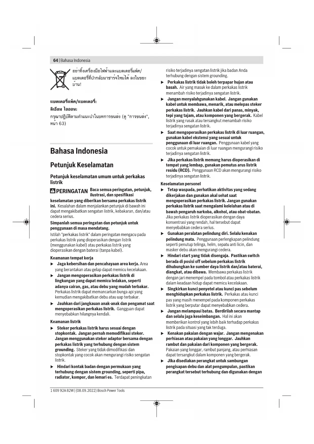แบตเตอรี่แพ็ค/แบตเตอรี่: ลิเธียม ไอออน: กรุณาปฏิบัติตามคำแนะนำในบทการขนส่ง (ดู "การขนส่ง", หน้า63) Bahasa Indonesia Petunjuk Keselamatan Petunjuk keselamatan umum untuk perkakas listrik PERINGATAN Baca semua peringatan, petunjuk, ilustrasi, dan spesifikasi keselamatan yang diberikan bersama perkakas listrik ini. Kesalahan dalam menjalankan petunjuk di bawah ini dapat mengakibatkan sengatan listrik, kebakaran, dan/atau cedera serius. Simpanlah semua peringatan dan petunjuk untuk penggunaan di masa mendatang. Istilah "perkakas listrik" dalam peringatan mengacu pada perkakas listrik yang dioperasikan dengan listrik (menggunakan kabel) atau perkakas listrik yang dioperasikan dengan baterai (tanpa kabel). Keamanan tempat kerja u Jaga kebersihan dan pencahayaan area kerja. Area yang berantakan atau gelap dapat memicu kecelakaan. u Jangan mengoperasikan perkakas listrik di lingkungan yang dapat memicu ledakan, seperti adanya cairan, gas, atau debu yang mudah terbakar. Perkakas listrik dapat memancarkan bunga api yang kemudian mengakibatkan debu atau uap terbakar. u Jauhkan dari jangkauan anak-anak dan pengamat saat mengoperasikan perkakas listrik. Gangguan dapat menyebabkan hilangnya kendali. Keamanan listrik u Steker perkakas listrik harus sesuai dengan stopkontak. Jangan pernah memodifikasi steker. Jangan menggunakan steker adaptor bersama dengan perkakas listrik yang terhubung dengan sistem grounding. Steker yang tidak dimodifikasi dan stopkontak yang cocok akan mengurangi risiko sengatan listrik. u Hindari kontak badan dengan permukaan yang terhubung dengan sistem grounding, seperti pipa, radiator, kompor, dan lemari es. Terdapat peningkatan risiko terjadinya sengatan listrik jika badan Anda terhubung dengan sistem grounding. u Perkakas listrik tidak boleh terpapar hujan atau basah. Air yang masuk ke dalam perkakas listrik menambah risiko terjadinya sengatan listrik. u Jangan menyalahgunakan kabel. Jangan gunakan kabel untuk membawa, menarik, atau melepas steker perkakas listrik. Jauhkan kabel dari panas, minyak, tepi yang tajam, atau komponen yang bergerak. Kabel listrik yang rusak atau tersangkut menambah risiko terjadinya sengatan listrik. u Saat mengoperasikan perkakas listrik di luar ruangan, gunakan kabel ekstensi yang sesuai untuk penggunaan di luar ruangan. Penggunaan kabel yang cocok untuk pemakaian di luar ruangan mengurangi risiko terjadinya sengatan listrik. u Jika perkakas listrik memang harus dioperasikan di tempat yang lembap, gunakan pemutus arus listrik residu (RCD). Penggunaan RCD akan mengurangi risiko terjadinya sengatan listrik. Keselamatan personel u Tetap waspada, perhatikan aktivitas yang sedang dikerjakan dan gunakan akal sehat saat mengoperasikan perkakas listrik. Jangan gunakan perkakas listrik saat mengalami kelelahan atau di bawah pengaruh narkoba, alkohol, atau obat-obatan. Jika perkakas listrik dioperasikan dengan daya konsentrasi yang rendah, hal tersebut dapat menyebabkan cedera serius. u Gunakan peralatan pelindung diri. Selalu kenakan pelindung mata. Penggunaan perlengkapan pelindung seperti penutup telinga, helm, sepatu anti licin, dan masker debu akan mengurangi cedera. u Hindari start yang tidak disengaja. Pastikan switch berada di posisi off sebelum perkakas listrik dihubungkan ke sumber daya listrik dan/atau baterai, diangkat, atau dibawa. Membawa perkakas listrik dengan jari menempel pada tombol atau perkakas listrik dalam keadaan hidup dapat memicu kecelakaan. u Singkirkan kunci penyetel atau kunci pas sebelum menghidupkan perkakas listrik. Perkakas atau kunci pas yang masih menempel pada komponen perkakas listrik yang berputar dapat menyebabkan cedera. u Jangan melampaui batas. Berdirilah secara mantap dan selalu jaga keseimbangan. Hal ini akan memberikan kontrol yang lebih baik terhadap perkakas listrik pada situasi yang tak terduga. u Kenakan pakaian dengan wajar. Jangan mengenakan perhiasan atau pakaian yang longgar. Jauhkan rambut dan pakaian dari komponen yang bergerak. Pakaian yang longgar, rambut panjang, atau perhiasan dapat tersangkut dalam komponen yang bergerak. u Jika disediakan perangkat untuk sambungan pengisapan debu dan alat pengumpulan, pastikan perangkat tersebut terhubung dan digunakan dengan 1 609 92A 82W | (08.09.2022) Bosch Power ToolsBahasa Indonesia | 65 benar. Penggunaan alat pengumpulan dapat mengurangi bahaya yang disebabkan oleh debu. u Jangan berpuas diri dan mengabaikan prinsip keselamatan karena terbiasa mengoperasikan perkakas. Tindakan yang kurang hati-hati dapat mengakibatkan cedera serius dalam waktu sepersekian detik. Penggunaan dan pemeliharaan perkakas listrik u Jangan memaksakan perkakas listrik. Gunakan perkakas listrik yang sesuai untuk pekerjaan yang dilakukan. Perkakas listrik yang sesuai akan bekerja dengan lebih baik dan aman sesuai tujuan penggunaan. u Jangan gunakan perkakas listrik dengan switch yang tidak dapat dioperasikan. Perkakas listrik yang switchnya yang tidak berfungsi dapat menimbulkan bahaya dan harus diperbaiki. u Lepaskan steker dari sumber listrik dan/atau lepas baterai, jika dapat dilepaskan dari perkakas listrik sebelum menyetel, mengganti aksesori, atau menyimpan perkakas listrik. Tindakan preventif akan mengurangi risiko menghidupkan perkakas listrik secara tidak disengaja. u Jauhkan dan simpan perkakas listrik dari jangkauan anak-anak dan jangan biarkan orang-orang yang tidak mengetahui cara menggunakan perkakas listrik, mengoperasikan perkakas listrik. Perkakas listrik dapat membahayakan jika digunakan oleh orang-orang yang tidak terlatih. u Lakukan pemeliharaan perkakas listrik dan aksesori. Periksa komponen yang bergerak apabila tidak lurus atau terikat, kerusakan komponen, dan kondisi lain yang dapat mengganggu pengoperasian perkakas listrik. Apabila rusak, perbaiki perkakas listrik sebelum digunakan. Kecelakaan serin