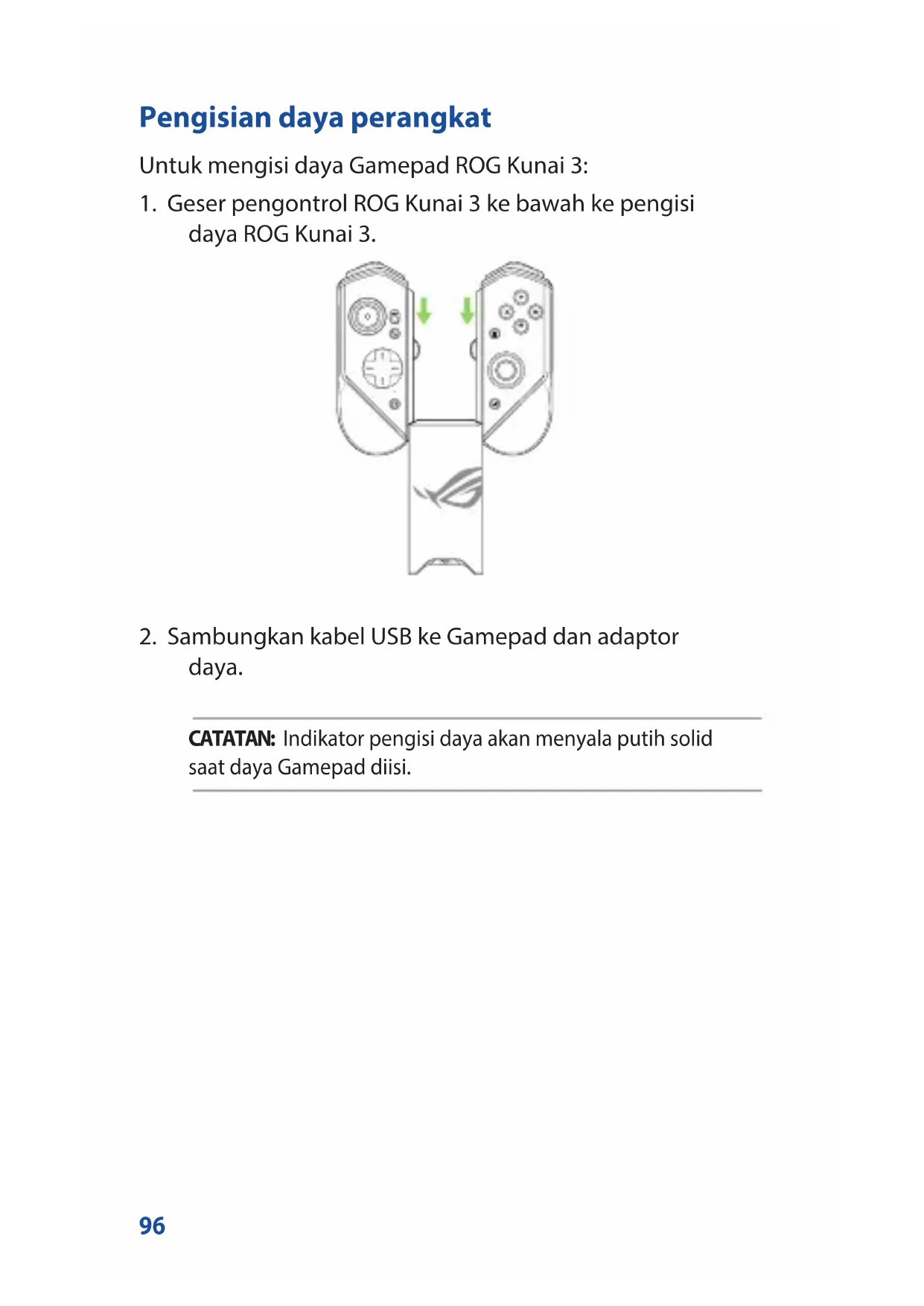 pegangan ROG Kunai 3, lalu dorong pengisi daya secara perlahan hingga terdengar bunyi klik. CATATAN: Lihat bagian Tanya Jawab untuk informasi tentang pemasangan Bluetooth.100 LED untuk Indikator pengisian daya Status LED Indikasi Putih solid Mengisi daya Mati Tidak mengisi daya Indikator status (Mode USB/Mode Bluetooth) Status LED Indikasi Status pengontrol Keterangan Berkedip biru secara cepat Menunggu dipasangkan T/A Berkedip biru secara lambat Menunggu dipasangkan secara otomatis T/A Merah solid Tersambung/ Dipasangkan Tingkat baterai: 0% - 25% Kuning solid Tersambung/ Dipasangkan Tingkat baterai: 25% - 90% Hijau solid Tersambung/ Dipasangkan Tingkat baterai: 90% -100% Mati Mati T/A101 Tanya Jawab T1: Bagaimana cara memasangkan ROG Kunai 3 Gamepad dengan Ponsel ROG untuk pertama kalinya? A1: 1. Pindahkan sakelar sambungan pada pengontrol kiri ke Bluetooth.