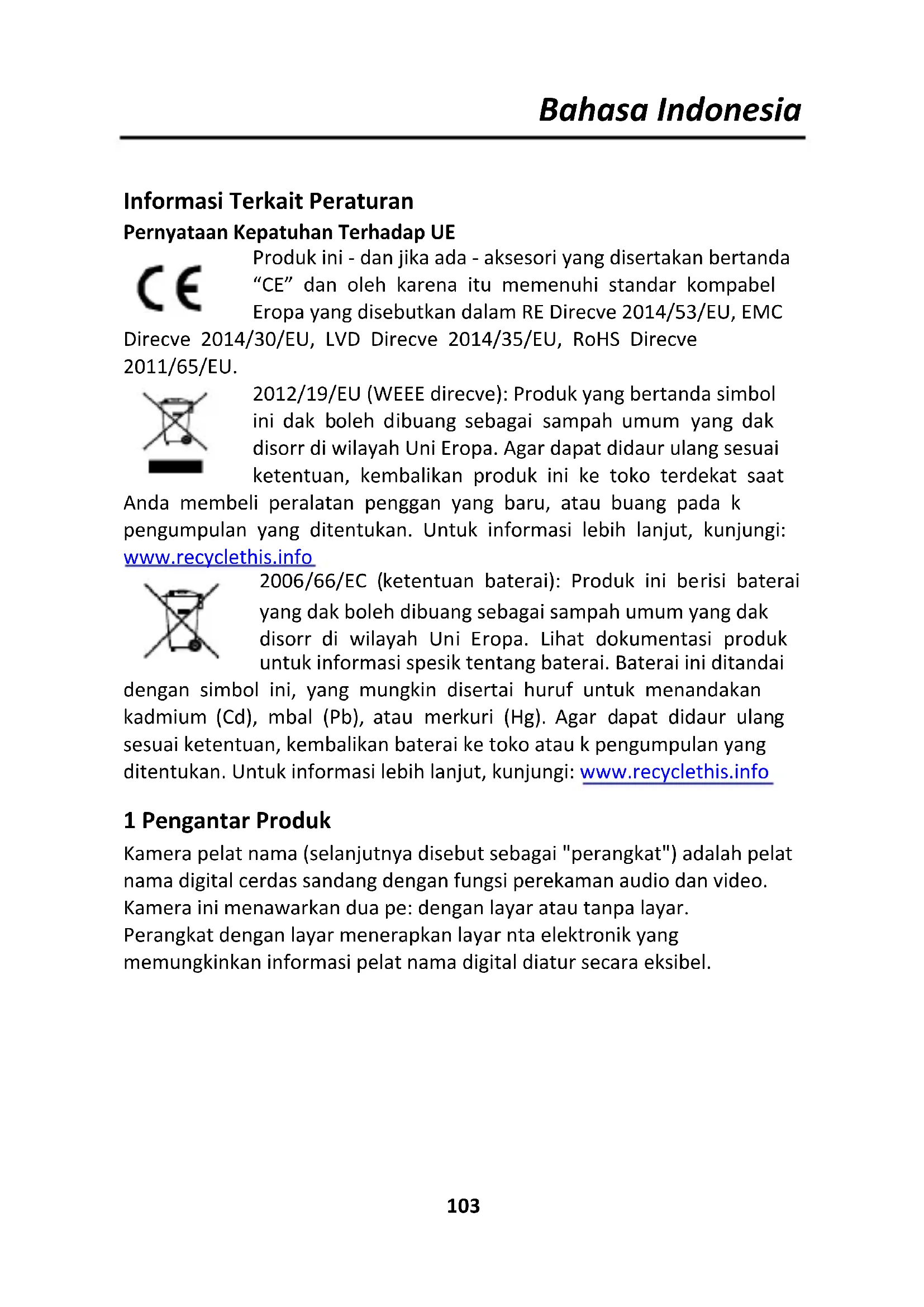 Informasi Terkait Peraturan Pernyataan Kepatuhan Terhadap UE Produk ini - dan jika ada - aksesori yang disertakan bertanda “CE” dan oleh karena itu memenuhi standar kompatibel Eropa yang disebutkan dalam RE Directive 2014/53/EU, EMC Directive 2014/30/EU, LVD Directive 2014/35/EU, RoHS Directive 2011/65/EU. 2012/19/EU (WEEE directive): Produk yang bertanda simbol ini tidak boleh dibuang sebagai sampah umum yang tidak disortir di wilayah Uni Eropa. Agar dapat didaur ulang sesuai ketentuan, kembalikan produk ini ke toko terdekat saat Anda membeli peralatan pengganti yang baru, atau buang pada titik pengumpulan yang ditentukan. Untuk informasi lebih lanjut, kunjungi: www.recyclethis.info 2006/66/EC (ketentuan baterai): Produk ini berisi baterai yang tidak boleh dibuang sebagai sampah umum yang tidak disortir di wilayah Uni Eropa. Lihat dokumentasi produk untuk informasi spesifik tentang baterai. Baterai ini ditandai dengan simbol ini, yang mungkin disertai huruf untuk menandakan kadmium (Cd), timbal (Pb), atau merkuri (Hg). Agar dapat didaur ulang sesuai ketentuan, kembalikan baterai ke toko atau titik pengumpulan yang ditentukan. Untuk informasi lebih lanjut, kunjungi: www.recyclethis.info 1 Pengantar Produk Kamera pelat nama (selanjutnya disebut sebagai "perangkat") adalah pelat nama digital cerdas sandang dengan fungsi perekaman audio dan video. Kamera ini menawarkan dua tipe: dengan layar atau tanpa layar. Perangkat dengan layar menerapkan layar tinta elektronik yang memungkinkan informasi pelat nama digital diatur secara fleksibel.Bahasa Indonesia