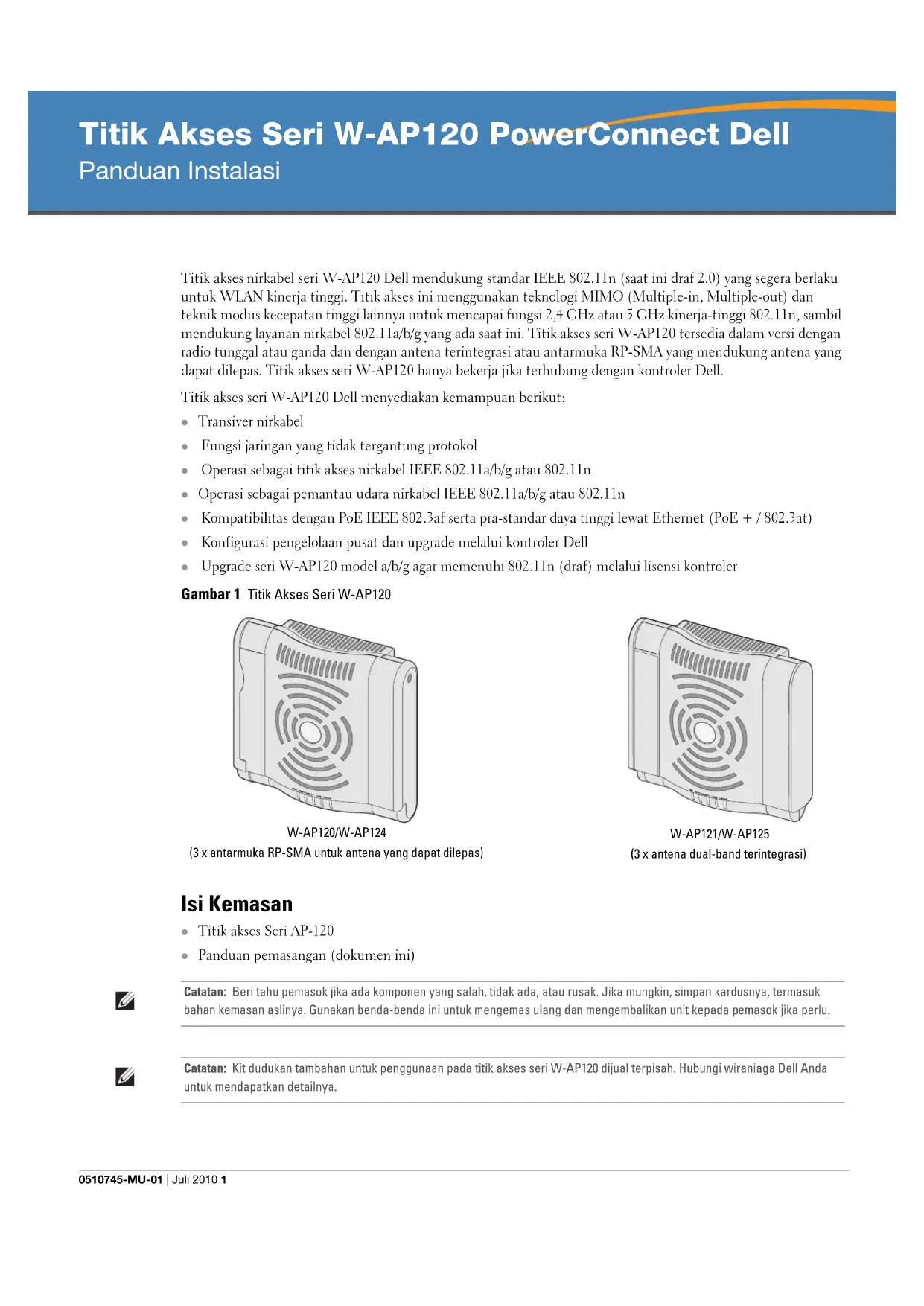 Catatan: Penting bagi Anda untuk memverifikasi item yang tercantum di bawah Daftar Periksa Pra-Instalasi sebelum berusaha melakukan setup dan pemasangan Titik Akses seri W-AP120.Titik Akses Seri W-AP120 PowerConnect Dell | Panduan Instalasi 3