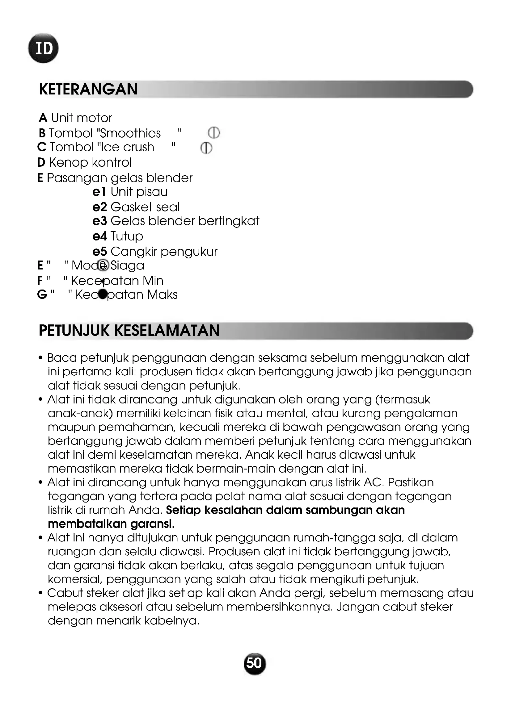 - Alat ini hanya ditujukan untuk penggunaan rumah-tangga saja, di dalam ruangan dan selalu diawasi. Produsen alat ini tidak bertanggung jawab, dan garansi tidak akan berlaku, atas segala penggunaan untuk tujuan komersial, penggunaan yang salah atau tidak mengikuti petunjuk.