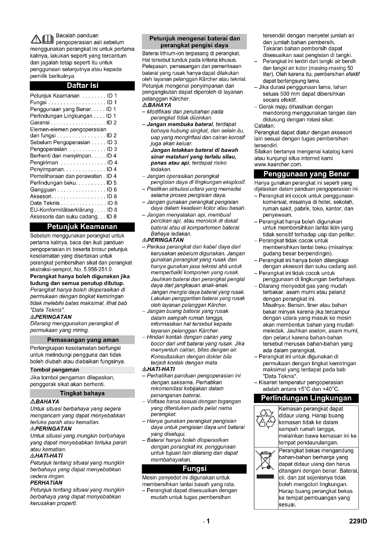 Chairman of the Board of Management Director Regulatory Affairs & Certification Приладдя й запасні деталі 228 UK- 1 Bacalah panduan pengoperasian asli sebelum menggunakan perangkat ini untuk pertama kalinya, lakukan seperti yang tercantum dan jagalah tetap seperti itu untuk penggunaan selanjutnya atau kepada pemilik berikutnya. Sebelum menggunakan perangkat untuk pertama kalinya, baca dan ikuti panduan pengoperasian ini beserta brosur petunjuk keselamatan yang disertakan untuk perangkat pembersihan sikat dan perangkat ekstraksi-semprot, No. 5.956-251.0. Perangkat hanya boleh digunakan jika tudung dan semua penutup ditutup. Perangkat hanya boleh dioperasikan di permukaan dengan tingkat kemiringan tidak melebihi batas maksimal, lihat bab "Data Teknis". 몇 PERINGATAN Dilarang menggunakan perangkat di permukaan yang miring. Perlengkapan keselamatan berfungsi untuk melindungi pengguna dan tidak boleh diubah atau diabaikan fungsinya. Jika tombol pengaman dilepaskan, penggerak sikat akan berhenti. BAHAYA Untuk situasi berbahaya yang segera mengancam yang dapat menyebabkan terluka parah atau kematian. 몇 PERINGATAN Untuk situasi yang mungkin berbahaya yang dapat menyebabkan terluka parah atau kematian. 몇 HATI-HATI Petunjuk tentang situasi yang mungkin berbahaya yang dapat menyebabkan cedera ringan. PERHATIAN Petunjuk tentang situasi yang mungkin berbahaya yang dapat menyebabkan kerusakan properti. Baterai lithium-ion terpasang di perangkat. Hal tersebut tunduk pada kriteria khusus. Pelepasan, pemasangan dan pemeriksaan baterai yang rusak hanya dapat dilakukan oleh layanan pelanggan Kärcher atau teknisi. Petunjuk mengenai penyimpanan dan pengangkutan dapat diperoleh di layanan pelanggan Kärcher. BAHAYA – Modifikasi dan perubahan pada perangkat tidak diizinkan. – Jangan membuka baterai, terdapat bahaya hubung singkat, dan selain itu, uap yang mengiritasi dan cairan korosif juga akan keluar. Jangan letakkan baterai di bawah sinar matahari yang terlalu silau, panas atau api, terdapat risiko ledakan. – Jangan operasikan perangkat pengisian daya di lingkungan eksplosif. – Pastikan sirkulasi udara yang memadai selama proses pengisian daya. – Jangan gunakan perangkat pengisian daya dalam keadaan kotor atau basah. – Jangan menyalakan api, membuat percikan api, atau merokok di dekat baterai atau di kompartemen baterai. Bahaya ledakan. 몇 PERINGATAN – Periksa perangkat dan kabel daya dari kerusakan sebelum digunakan. Jangan gunakan perangkat yang rusak dan hanya gunakan jasa teknisi ahli untuk memperbaiki komponen yang rusak. Jauhkan baterai dan perangkat pengisi daya dari jangkauan anak-anak. Jangan mengisi daya baterai yang rusak. Lakukan penggantian baterai yang rusak oleh layanan pelanggan Kärcher. – Jangan buang baterai yang rusak dalam sampah rumah tangga, informasikan hal tersebut kepada layanan pelanggan Kärcher. – Hindari kontak dengan cairan yang bocor dari unit baterai yang rusak. Jika menyentuh cairan, bilas dengan air. Konsultasikan dengan dokter bila terjadi kontak dengan mata. 몇 HATI-HATI – Perhatikan panduan pengoperasian ini dengan saksama. Perhatikan rekomendasi kebijakan dalam penanganan baterai. – Voltase harus sesuai dengan tegangan yang ditentukan pada pelat nama perangkat. – Hanya gunakan perangkat pengisian daya untuk pengisian daya unit baterai yang disetujui. – Baterai hanya boleh dioperasikan dengan perangkat ini, penggunaan untuk tujuan lain dilarang dan dapat membahayakan. Mesin penyedot ini digunakan untuk membersihkan lantai basah yang rata. – Perangkat dapat disesuaikan dengan mudah untuk tugas pembersihan tersendiri dengan menyetel jumlah air dan jumlah bahan pembersih. Takaran bahan pembersih dapat disesuaikan saat pengisian di tangki.
