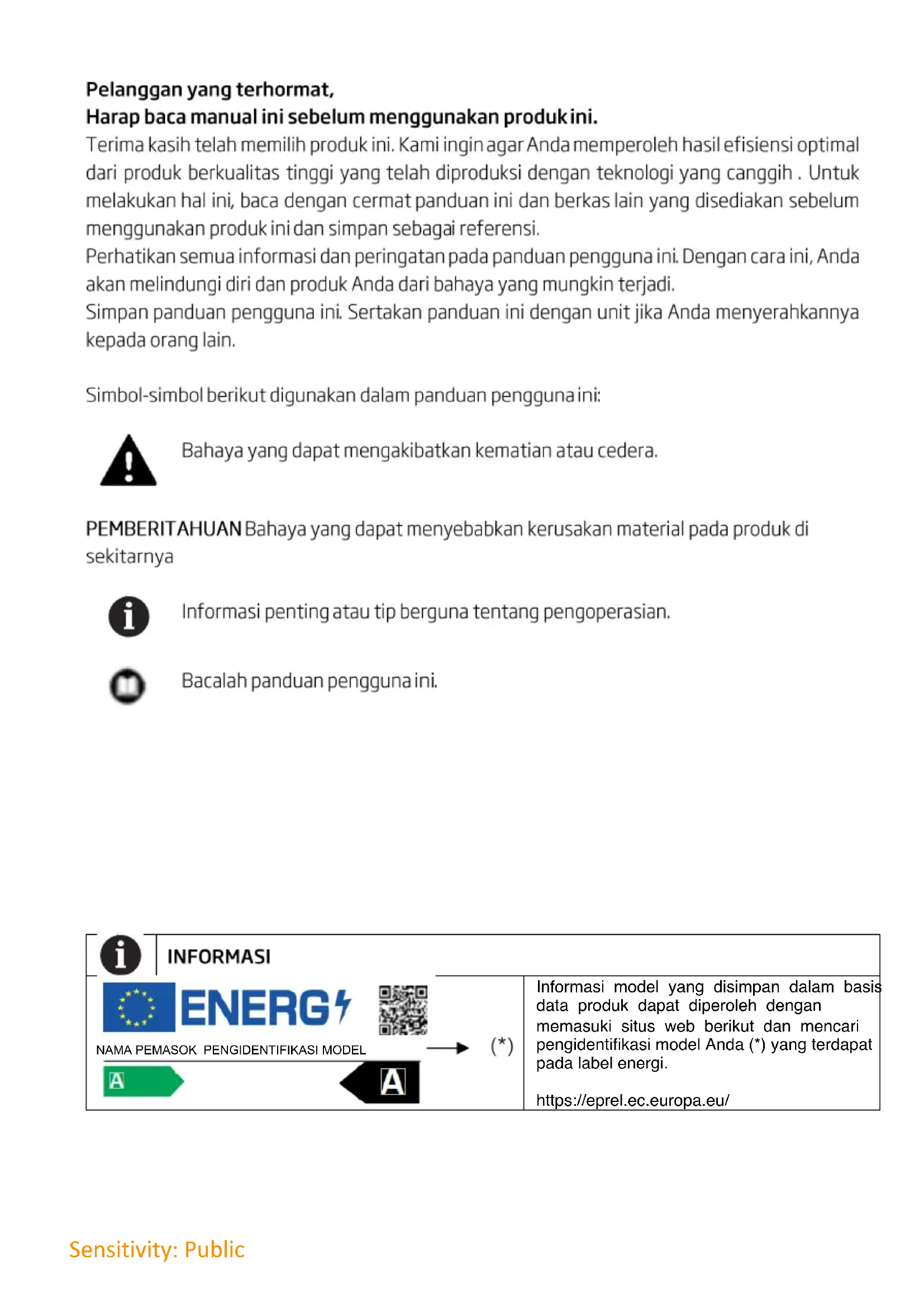 Informasi model yang disimpan dalam basis data produk dapat diperoleh dengan memasuki situs web berikut dan mencari pengidentifikasi model Anda (*) yang terdapat pada label energi. https://eprel.ec.europa.eu/Sensitivity: Public