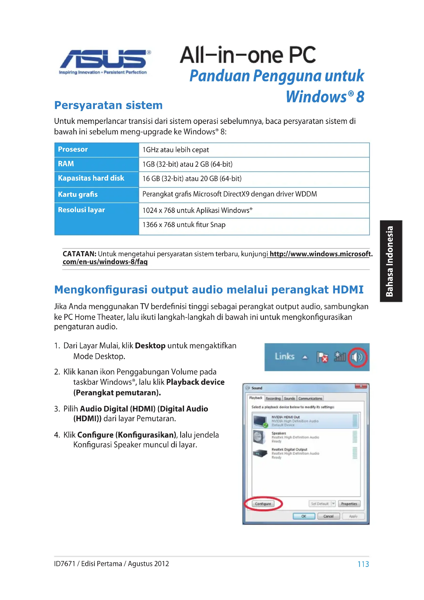 Kongurasi Speaker muncul di layar. CATATAN: Untuk mengetahui persyaratan sistem terbaru, kunjungi http://www.windows.microsoft. com/en-us/windows-8/faq Prosesor 1GHz atau lebih cepat RAM 1GB (32-bit) atau 2 GB (64-bit) Kapasitas hard disk 16 GB (32-bit) atau 20 GB (64-bit) Kartu gras Perangkat gras Microsoft DirectX9 dengan driver WDDM Resolusi layar 1024 x 768 untuk Aplikasi Windows® 1366 x 768 untuk tur Snap Persyaratan sistem Untuk memperlancar transisi dari sistem operasi sebelumnya, baca persyaratan sistem di bawah ini sebelum meng-upgrade ke Windows® 8: Bahasa Indonesia Bahasa Indonesia ID7671 / Edisi Pertama / Agustus 2012114 Bahasa Indonesia Bahasa Indonesia Bahasa Indonesia Bahasa Indonesia
