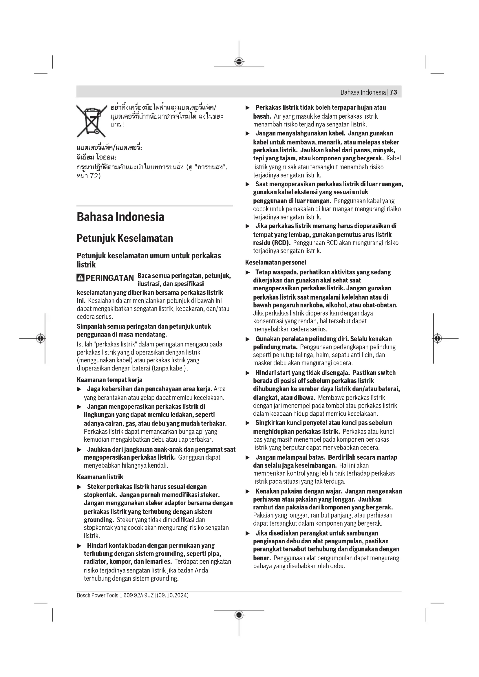 แบตเตอรี่แพ็ค/แบตเตอรี่: ลิเธียม ไอออน: กรุณาปฏิบัติตามคำแนะนำในบทการขนส่ง (ดู "การขนส่ง", หน้า72) Bahasa Indonesia Petunjuk Keselamatan Petunjuk keselamatan umum untuk perkakas listrik PERINGATAN Baca semua peringatan, petunjuk, ilustrasi, dan spesifikasi keselamatan yang diberikan bersama perkakas listrik ini. Kesalahan dalam menjalankan petunjuk di bawah ini dapat mengakibatkan sengatan listrik, kebakaran, dan/atau cedera serius. Simpanlah semua peringatan dan petunjuk untuk penggunaan di masa mendatang. Istilah "perkakas listrik" dalam peringatan mengacu pada perkakas listrik yang dioperasikan dengan listrik (menggunakan kabel) atau perkakas listrik yang dioperasikan dengan baterai (tanpa kabel). Keamanan tempat kerja u Jaga kebersihan dan pencahayaan area kerja. Area yang berantakan atau gelap dapat memicu kecelakaan. u Jangan mengoperasikan perkakas listrik di lingkungan yang dapat memicu ledakan, seperti adanya cairan, gas, atau debu yang mudah terbakar. Perkakas listrik dapat memancarkan bunga api yang kemudian mengakibatkan debu atau uap terbakar. u Jauhkan dari jangkauan anak-anak dan pengamat saat mengoperasikan perkakas listrik. Gangguan dapat menyebabkan hilangnya kendali. Keamanan listrik u Steker perkakas listrik harus sesuai dengan stopkontak. Jangan pernah memodifikasi steker. Jangan menggunakan steker adaptor bersama dengan perkakas listrik yang terhubung dengan sistem grounding. Steker yang tidak dimodifikasi dan stopkontak yang cocok akan mengurangi risiko sengatan listrik. u Hindari kontak badan dengan permukaan yang terhubung dengan sistem grounding, seperti pipa, radiator, kompor, dan lemari es. Terdapat peningkatan risiko terjadinya sengatan listrik jika badan Anda terhubung dengan sistem grounding. u Perkakas listrik tidak boleh terpapar hujan atau basah. Air yang masuk ke dalam perkakas listrik menambah risiko terjadinya sengatan listrik. u Jangan menyalahgunakan kabel. Jangan gunakan kabel untuk membawa, menarik, atau melepas steker perkakas listrik. Jauhkan kabel dari panas, minyak, tepi yang tajam, atau komponen yang bergerak. Kabel listrik yang rusak atau tersangkut menambah risiko terjadinya sengatan listrik. u Saat mengoperasikan perkakas listrik di luar ruangan, gunakan kabel ekstensi yang sesuai untuk penggunaan di luar ruangan. Penggunaan kabel yang cocok untuk pemakaian di luar ruangan mengurangi risiko terjadinya sengatan listrik. u Jika perkakas listrik memang harus dioperasikan di tempat yang lembap, gunakan pemutus arus listrik residu (RCD). Penggunaan RCD akan mengurangi risiko terjadinya sengatan listrik. Keselamatan personel u Tetap waspada, perhatikan aktivitas yang sedang dikerjakan dan gunakan akal sehat saat mengoperasikan perkakas listrik. Jangan gunakan perkakas listrik saat mengalami kelelahan atau di bawah pengaruh narkoba, alkohol, atau obat-obatan. Jika perkakas listrik dioperasikan dengan daya konsentrasi yang rendah, hal tersebut dapat menyebabkan cedera serius. u Gunakan peralatan pelindung diri. Selalu kenakan pelindung mata. Penggunaan perlengkapan pelindung seperti penutup telinga, helm, sepatu anti licin, dan masker debu akan mengurangi cedera. u Hindari start yang tidak disengaja. Pastikan switch berada di posisi off sebelum perkakas listrik dihubungkan ke sumber daya listrik dan/atau baterai, diangkat, atau dibawa. Membawa perkakas listrik dengan jari menempel pada tombol atau perkakas listrik dalam keadaan hidup dapat memicu kecelakaan. u Singkirkan kunci penyetel atau kunci pas sebelum menghidupkan perkakas listrik. Perkakas atau kunci pas yang masih menempel pada komponen perkakas listrik yang berputar dapat menyebabkan cedera. u Jangan melampaui batas. Berdirilah secara mantap dan selalu jaga keseimbangan. Hal ini akan memberikan kontrol yang lebih baik terhadap perkakas listrik pada situasi yang tak terduga. u Kenakan pakaian dengan wajar. Jangan mengenakan perhiasan atau pakaian yang longgar. Jauhkan rambut dan pakaian dari komponen yang bergerak. Pakaian yang longgar, rambut panjang, atau perhiasan dapat tersangkut dalam komponen yang bergerak. u Jika disediakan perangkat untuk sambungan pengisapan debu dan alat pengumpulan, pastikan perangkat tersebut terhubung dan digunakan dengan benar. Penggunaan alat pengumpulan dapat mengurangi bahaya yang disebabkan oleh debu. Bosch Power Tools 1 609 92A 9UZ | (09.10.2024)74 | Bahasa Indonesia u Jangan berpuas diri dan mengabaikan prinsip keselamatan karena terbiasa mengoperasikan perkakas. Tindakan yang kurang hati-hati dapat mengakibatkan cedera serius dalam waktu sepersekian detik. Penggunaan dan pemeliharaan perkakas listrik u Jangan memaksakan perkakas listrik. Gunakan perkakas listrik yang sesuai untuk pekerjaan yang dilakukan. Perkakas listrik yang sesuai akan bekerja dengan lebih baik dan aman sesuai tujuan penggunaan. u Jangan gunakan perkakas listrik dengan switch yang tidak dapat dioperasikan. Perkakas listrik yang switchnya yang tidak berfungsi dapat menimbulkan bahaya dan harus diperbaiki. u Lepaskan steker dari sumber listrik dan/atau lepas baterai, jika dapat dilepaskan dari perkakas listrik sebelum menyetel, mengganti aksesori, atau menyimpan perkakas listrik. Tindakan preventif akan mengurangi risiko menghidupkan perkakas listrik secara tidak disengaja. u Jauhkan dan simpan perkakas listrik dari jangkauan anak-anak dan jangan biarkan orang-orang yang tidak mengetahui cara menggunakan perkakas listrik, mengoperasikan perkakas listrik. Perkakas listrik dapat membahayakan jika digunakan oleh orang-orang yang tidak terlatih. u Lakukan pemeliharaan perkakas listrik dan aksesori. Periksa komponen yang bergerak apabila tidak lurus atau terikat, kerusakan komponen, dan kondisi lain yang dapat mengganggu pengoperasian perkakas listrik. Apabila rusak, perbaiki perkakas listrik sebelum digunakan. Kecelakaan serin