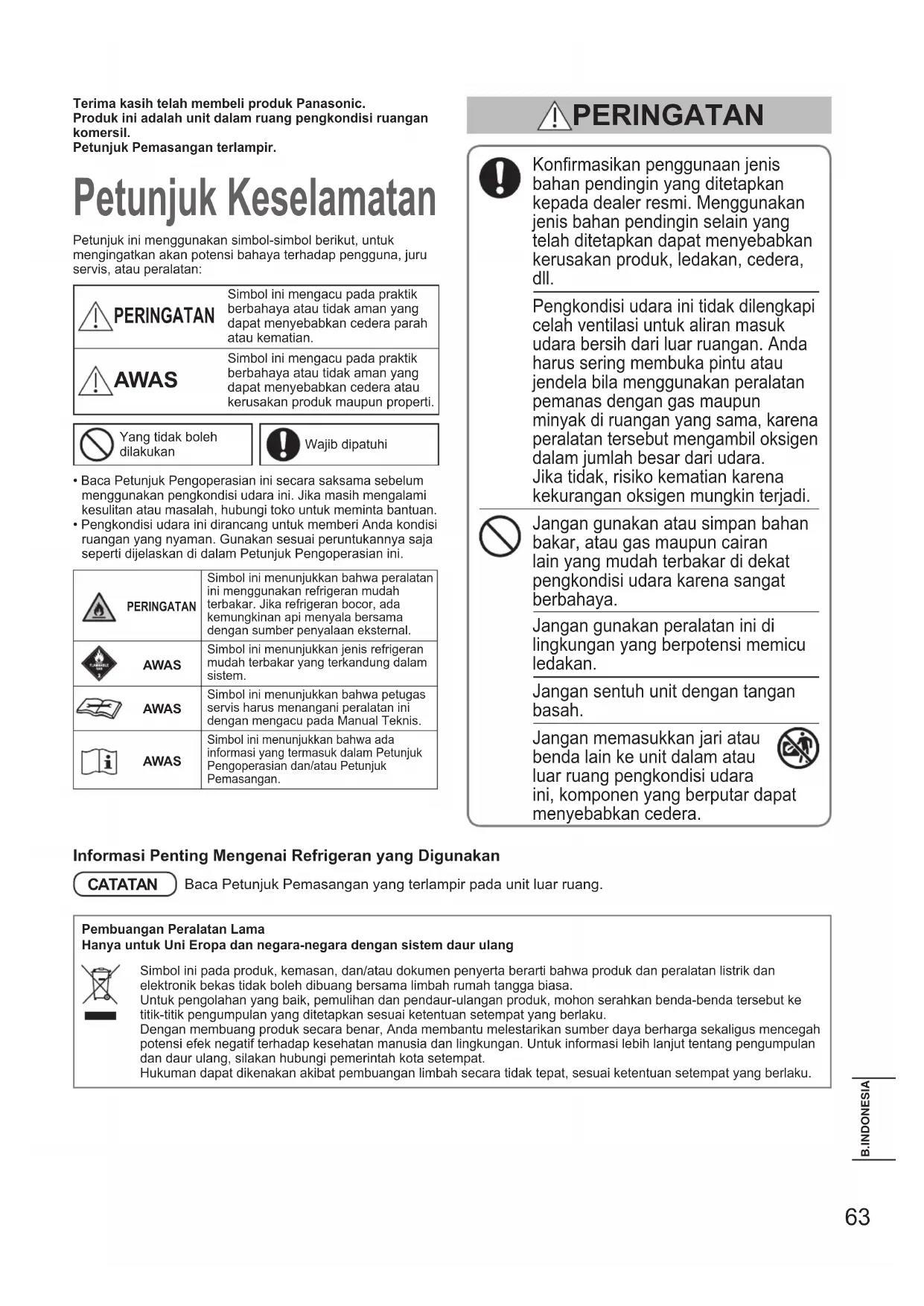 Блок автоматично відновить роботу. Будуть використовуватися робочі настройки, які діяли до збою живлення. Даний кондиціонер включає в себе біоцидний продукт.Вільні радикали, які утворюються пристроєм, вбудованим в кондиціонер, мають здатність придушувати утворення забруднюючих речовин, таких як деякі види бактерій, вірусів та плісняви.Активні речовини: вільні радикали, які утворюються на місці експлуатації з навколишнього повітря та водиВикористання: цю функцію пристрою можна ввімкнути/вимкнути кнопкою з піктограмою «nanoe X» або за допомогою налаштувань пульта дистанційного керування, якщо кнопки з піктограмою «nanoe X» немає. Будь ласка, докладніше див. у розділі «Як користуватися». Відскануйте двовимірний (2D) матричний штрих-код на першій сторінці та прочитайте детальні інструкції з використання. Механізм роботи 00_350051_all.indb 62 2022/12/1 13:15:0763 B.INDONESIATerima kasih telah membeli produk Panasonic.Produk ini adalah unit dalam ruang pengkondisi ruangan komersil.Petunjuk Pemasangan terlampir. Konrmasikan penggunaan jenis bahan pendingin yang ditetapkan kepada dealer resmi. Menggunakan jenis bahan pendingin selain yang telah ditetapkan dapat menyebabkan kerusakan produk, ledakan, cedera, dll. Pengkondisi udara ini tidak dilengkapi celah ventilasi untuk aliran masuk udara bersih dari luar ruangan. Anda harus sering membuka pintu atau jendela bila menggunakan peralatan pemanas dengan gas maupun minyak di ruangan yang sama, karena peralatan tersebut mengambil oksigen dalam jumlah besar dari udara. Jika tidak, risiko kematian karena kekurangan oksigen mungkin terjadi. Jangan gunakan atau simpan bahan bakar, atau gas maupun cairan lain yang mudah terbakar di dekat pengkondisi udara karena sangat berbahaya. Jangan gunakan peralatan ini di lingkungan yang berpotensi memicu ledakan. Jangan sentuh unit dengan tangan basah. Jangan memasukkan jari atau benda lain ke unit dalam atau luar ruang pengkondisi udara ini, komponen yang berputar dapat menyebabkan cedera. PERINGATAN Petunjuk Keselamatan Petunjuk ini menggunakan simbol-simbol berikut, untuk mengingatkan akan potensi bahaya terhadap pengguna, juru servis, atau peralatan: PERINGATAN Simbol ini mengacu pada praktik berbahaya atau tidak aman yang dapat menyebabkan cedera parah atau kematian. AWAS Simbol ini mengacu pada praktik berbahaya atau tidak aman yang dapat menyebabkan cedera atau kerusakan produk maupun properti.Yang tidak boleh dilakukanWajib dipatuhi• Baca Petunjuk Pengoperasian ini secara saksama sebelum menggunakan pengkondisi udara ini. Jika masih mengalami kesulitan atau masalah, hubungi toko untuk meminta bantuan.• Pengkondisi udara ini dirancang untuk memberi Anda kondisi ruangan yang nyaman. Gunakan sesuai peruntukannya saja seperti dijelaskan di dalam Petunjuk Pengoperasian ini.PERINGATANSimbol ini menunjukkan bahwa peralatan ini menggunakan refrigeran mudah terbakar. Jika refrigeran bocor, ada kemungkinan api menyala bersama dengan sumber penyalaan eksternal. AWAS Simbol ini menunjukkan jenis refrigeran mudah terbakar yang terkandung dalam sistem. AWAS Simbol ini menunjukkan bahwa petugas servis harus menangani peralatan ini dengan mengacu pada Manual Teknis. AWAS Simbol ini menunjukkan bahwa ada informasi yang termasuk dalam Petunjuk Pengoperasian dan/atau Petunjuk Pemasangan.Informasi Penting Mengenai Refrigeran yang DigunakanCATATAN Baca Petunjuk Pemasangan yang terlampir pada unit luar ruang.Pembuangan Peralatan Lama Hanya untuk Uni Eropa dan negara-negara dengan sistem daur ulangSimbol ini pada produk, kemasan, dan/atau dokumen penyerta berarti bahwa produk dan peralatan listrik dan elektronik bekas tidak boleh dibuang bersama limbah rumah tangga biasa.Untuk pengolahan yang baik, pemulihan dan pendaur-ulangan produk, mohon serahkan benda-benda tersebut ke titik-titik pengumpulan yang ditetapkan sesuai ketentuan setempat yang berlaku.Dengan membuang produk secara benar, Anda membantu melestarikan sumber daya berharga sekaligus mencegah potensi efek negatif terhadap kesehatan manusia dan lingkungan. Untuk informasi lebih lanjut tentang pengumpulan dan daur ulang, silakan hubungi pemerintah kota setempat.Hukuman dapat dikenakan akibat pembuangan limbah secara tidak tepat, sesuai ketentuan setempat yang berlaku. 00_350051_all.indb 63 2022/12/1 13:15:0864 Refrigeran akan menghasilkan gas beracun jika bersentuhan dengan api. Demi keselamatan, pastikan pengkondisi udara telah dimatikan dan dilepas dari catu daya sebelum dibersihkan atau diservis. Lepas konektor daya dari stopkontak, nonaktifkan pemutus arus, atau nonaktifkan alat pemutus daya untuk memisahkan pengkondisi udara dari catu daya utama bila terjadi keadaan darurat. Buang sesuai dengan peraturan nasional dan/atau lokal. Produk ini tidak boleh dimodikasi atau dibongkar dalam kondisi apa pun. Unit yang dimodikasi atau dibongkar dapat menyebabkan kebakaran, sengatan listrik, atau cedera. Jangan bersihkan sendiri bagian dalam unit dalam ruang dan unit luar ruang. Hubungi dealer atau teknisi resmi untuk melakukan pembersihan. Jika terjadi kerusakan fungsi pada peralatan, jangan perbaiki sendiri. Hubungi dealer penjualan atau servis untuk melakukan perbaikan dan pembuangan. Sediakan stopkontak untuk digunakan secara khusus oleh masing-masing unit, dan pemutus catu daya, Pemutus Sirk