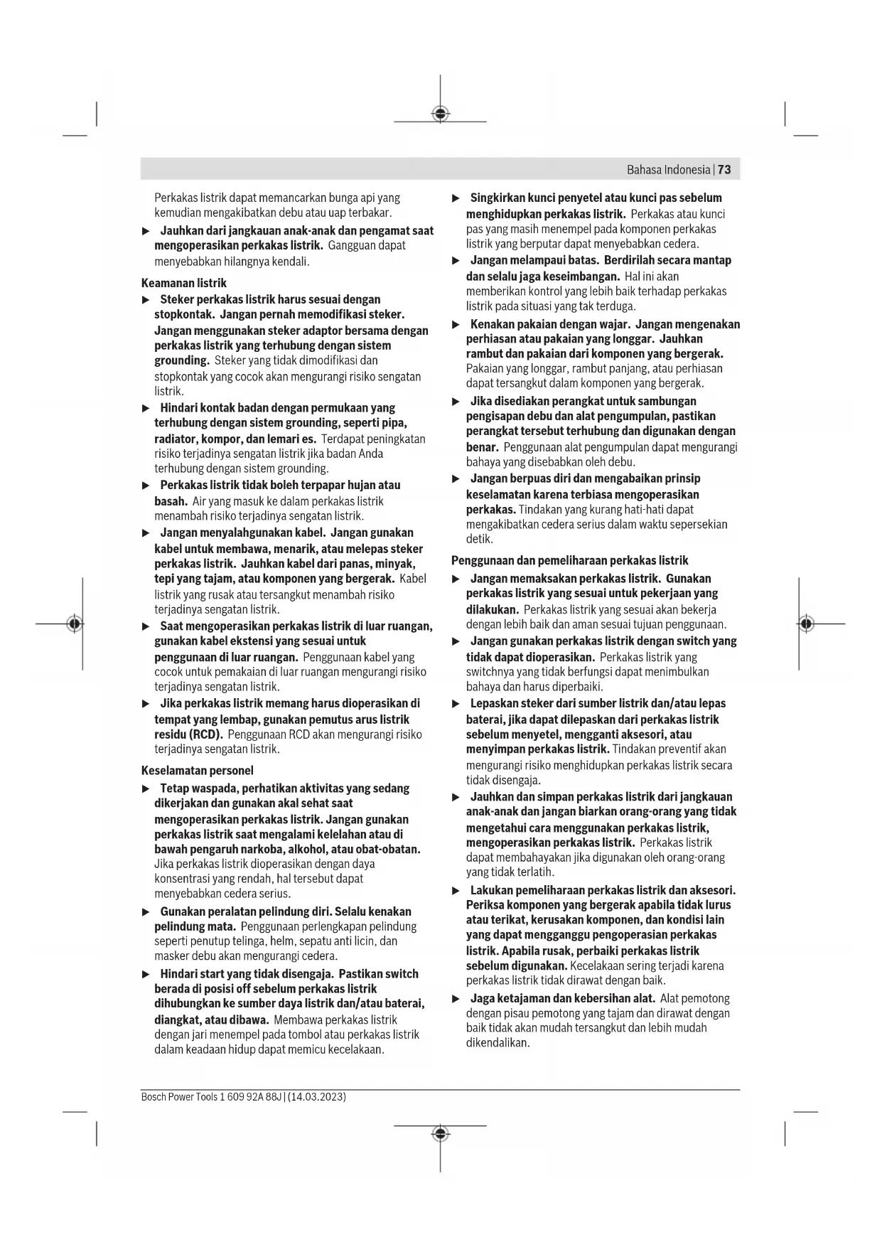 โทรศัพท์ 02 7587555 โทรสาร 02 7587525 สามารถดูที่อยู่ศูนย์บริการอื่นๆ ได้ที่: www.bosch-pt.com/serviceaddresses การกำจัดขยะ เครื่องมือไฟฟ้า อุปกรณ์ประกอบ และหีบห่อ ต้องนำ ไปแยกประเภทวัสดุเพื่อการรีไซเคิลที่เป็นมิตรต่อสิ่งแวดล้อม อย่าทิ้งเครื่องมือไฟฟ้าลงในขยะบ้าน! Bahasa Indonesia Petunjuk Keselamatan Petunjuk Keselamatan Umum Perkakas Listrik PERINGATAN Baca semua peringatan, petunjuk, ilustrasi, dan spesifikasi keselamatan yang diberikan bersama perkakas listrik ini. Kesalahan dalam menjalankan petunjuk di bawah ini dapat mengakibatkan sengatan listrik, kebakaran, dan/atau cedera serius. Simpanlah semua peringatan dan petunjuk untuk penggunaan di masa mendatang. Istilah "perkakas listrik" dalam peringatan mengacu pada perkakas listrik yang dioperasikan dengan listrik (menggunakan kabel) atau perkakas listrik yang dioperasikan dengan baterai (tanpa kabel). Keamanan tempat kerja u Jaga kebersihan dan pencahayaan area kerja. Area yang berantakan atau gelap dapat memicu kecelakaan. u Jangan mengoperasikan perkakas listrik di lingkungan yang dapat memicu ledakan, seperti adanya cairan, gas, atau debu yang mudah terbakar. 1 609 92A 88J | (14.03.2023) Bosch Power ToolsBahasa Indonesia | 73 Perkakas listrik dapat memancarkan bunga api yang kemudian mengakibatkan debu atau uap terbakar. u Jauhkan dari jangkauan anak-anak dan pengamat saat mengoperasikan perkakas listrik. Gangguan dapat menyebabkan hilangnya kendali. Keamanan listrik u Steker perkakas listrik harus sesuai dengan stopkontak. Jangan pernah memodifikasi steker. Jangan menggunakan steker adaptor bersama dengan perkakas listrik yang terhubung dengan sistem grounding. Steker yang tidak dimodifikasi dan stopkontak yang cocok akan mengurangi risiko sengatan listrik. u Hindari kontak badan dengan permukaan yang terhubung dengan sistem grounding, seperti pipa, radiator, kompor, dan lemari es. Terdapat peningkatan risiko terjadinya sengatan listrik jika badan Anda terhubung dengan sistem grounding. u Perkakas listrik tidak boleh terpapar hujan atau basah. Air yang masuk ke dalam perkakas listrik menambah risiko terjadinya sengatan listrik. u Jangan menyalahgunakan kabel. Jangan gunakan kabel untuk membawa, menarik, atau melepas steker perkakas listrik. Jauhkan kabel dari panas, minyak, tepi yang tajam, atau komponen yang bergerak. Kabel listrik yang rusak atau tersangkut menambah risiko terjadinya sengatan listrik. u Saat mengoperasikan perkakas listrik di luar ruangan, gunakan kabel ekstensi yang sesuai untuk penggunaan di luar ruangan. Penggunaan kabel yang cocok untuk pemakaian di luar ruangan mengurangi risiko terjadinya sengatan listrik. u Jika perkakas listrik memang harus dioperasikan di tempat yang lembap, gunakan pemutus arus listrik residu (RCD). Penggunaan RCD akan mengurangi risiko terjadinya sengatan listrik. Keselamatan personel u Tetap waspada, perhatikan aktivitas yang sedang dikerjakan dan gunakan akal sehat saat mengoperasikan perkakas listrik. Jangan gunakan perkakas listrik saat mengalami kelelahan atau di bawah pengaruh narkoba, alkohol, atau obat-obatan. Jika perkakas listrik dioperasikan dengan daya konsentrasi yang rendah, hal tersebut dapat menyebabkan cedera serius. u Gunakan peralatan pelindung diri. Selalu kenakan pelindung mata. Penggunaan perlengkapan pelindung seperti penutup telinga, helm, sepatu anti licin, dan masker debu akan mengurangi cedera. u Hindari start yang tidak disengaja. Pastikan switch berada di posisi off sebelum perkakas listrik dihubungkan ke sumber daya listrik dan/atau baterai, diangkat, atau dibawa. Membawa perkakas listrik dengan jari menempel pada tombol atau perkakas listrik dalam keadaan hidup dapat memicu kecelakaan. u Singkirkan kunci penyetel atau kunci pas sebelum menghidupkan perkakas listrik. Perkakas atau kunci pas yang masih menempel pada komponen perkakas listrik yang berputar dapat menyebabkan cedera. u Jangan melampaui batas. Berdirilah secara mantap dan selalu jaga keseimbangan. Hal ini akan memberikan kontrol yang lebih baik terhadap perkakas listrik pada situasi yang tak terduga. u Kenakan pakaian dengan wajar. Jangan mengenakan perhiasan atau pakaian yang longgar. Jauhkan rambut dan pakaian dari komponen yang bergerak. Pakaian yang longgar, rambut panjang, atau perhiasan dapat tersangkut dalam komponen yang bergerak. u Jika disediakan perangkat untuk sambungan pengisapan debu dan alat pengumpulan, pastikan perangkat tersebut terhubung dan digunakan dengan benar. Penggunaan alat pengumpulan dapat mengurangi bahaya yang disebabkan oleh debu. u Jangan berpuas diri dan mengabaikan prinsip keselamatan karena terbiasa mengoperasikan perkakas. Tindakan yang kurang hati-hati dapat mengakibatkan cedera serius dalam waktu sepersekian detik. Penggunaan dan pemeliharaan perkakas listrik u Jangan memaksakan perkakas listrik. Gunakan perkakas listrik yang sesuai untuk pekerjaan yang dilakukan. Perkakas listrik yang sesuai akan bekerja dengan lebih baik dan aman sesuai tujuan penggunaan. u Jangan gunakan perkakas listrik dengan switch yang tidak dapat dioperasikan. Perkakas listrik yang switchnya yang tidak berfungsi dapat menimbulkan bahaya dan harus diperbaiki. u Lepaskan steker dari sumber listrik dan/atau lepas baterai, jika dapat dilepaskan dari perkakas listrik sebelum menyetel, mengganti aksesori, atau menyimpan perkakas listrik. Tindakan preventif akan mengurangi risiko menghidupkan perkakas listrik secara tidak disengaja. u Jauhkan dan simpan perkakas listrik dari jangkauan anak-anak dan jangan biarkan orang-orang yang tidak mengetahui cara menggunakan perkakas listrik, mengoperasikan perka