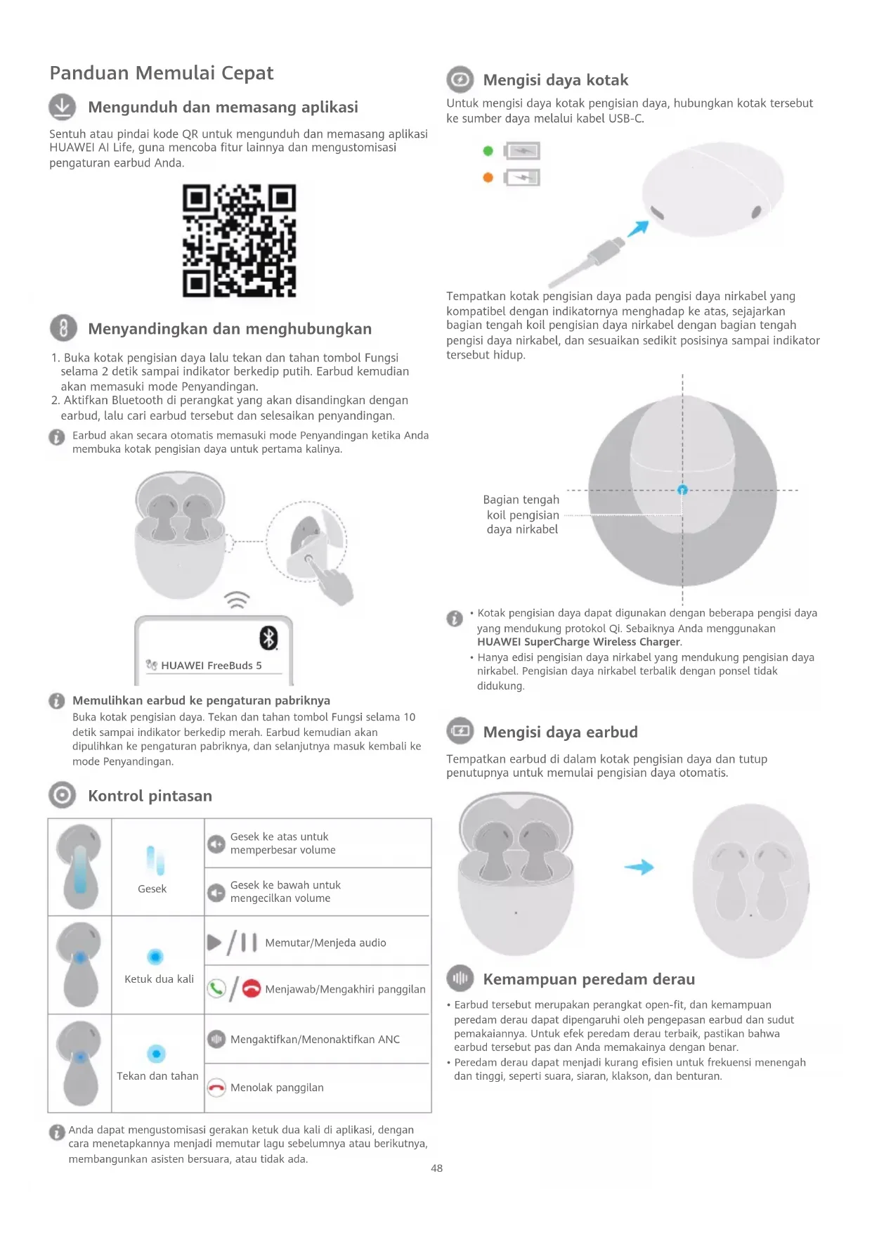 earbud, lalu cari earbud tersebut dan selesaikan penyandingan. Menyandingkan dan menghubungkan Earbud akan secara otomatis memasuki mode Penyandingan ketika Anda membuka kotak pengisian daya untuk pertama kalinya. Buka kotak pengisian daya. Tekan dan tahan tombol Fungsi selama 10 detik sampai indikator berkedip merah. Earbud kemudian akan dipulihkan ke pengaturan pabriknya, dan selanjutnya masuk kembali ke mode Penyandingan. Memulihkan earbud ke pengaturan pabriknya Sentuh atau pindai kode QR untuk mengunduh dan memasang aplikasi HUAWEI AI Life, guna mencoba fitur lainnya dan mengustomisasi pengaturan earbud Anda. Mengunduh dan memasang aplikasi Kontrol pintasan Anda dapat mengustomisasi gerakan ketuk dua kali di aplikasi, dengan cara menetapkannya menjadi memutar lagu sebelumnya atau berikutnya, membangunkan asisten bersuara, atau tidak ada. Untuk mengisi daya kotak pengisian daya, hubungkan kotak tersebut ke sumber daya melalui kabel USB-C. Tempatkan kotak pengisian daya pada pengisi daya nirkabel yang kompatibel dengan indikatornya menghadap ke atas, sejajarkan bagian tengah koil pengisian daya nirkabel dengan bagian tengah pengisi daya nirkabel, dan sesuaikan sedikit posisinya sampai indikator tersebut hidup. Mengisi daya kotak Kemampuan peredam derau