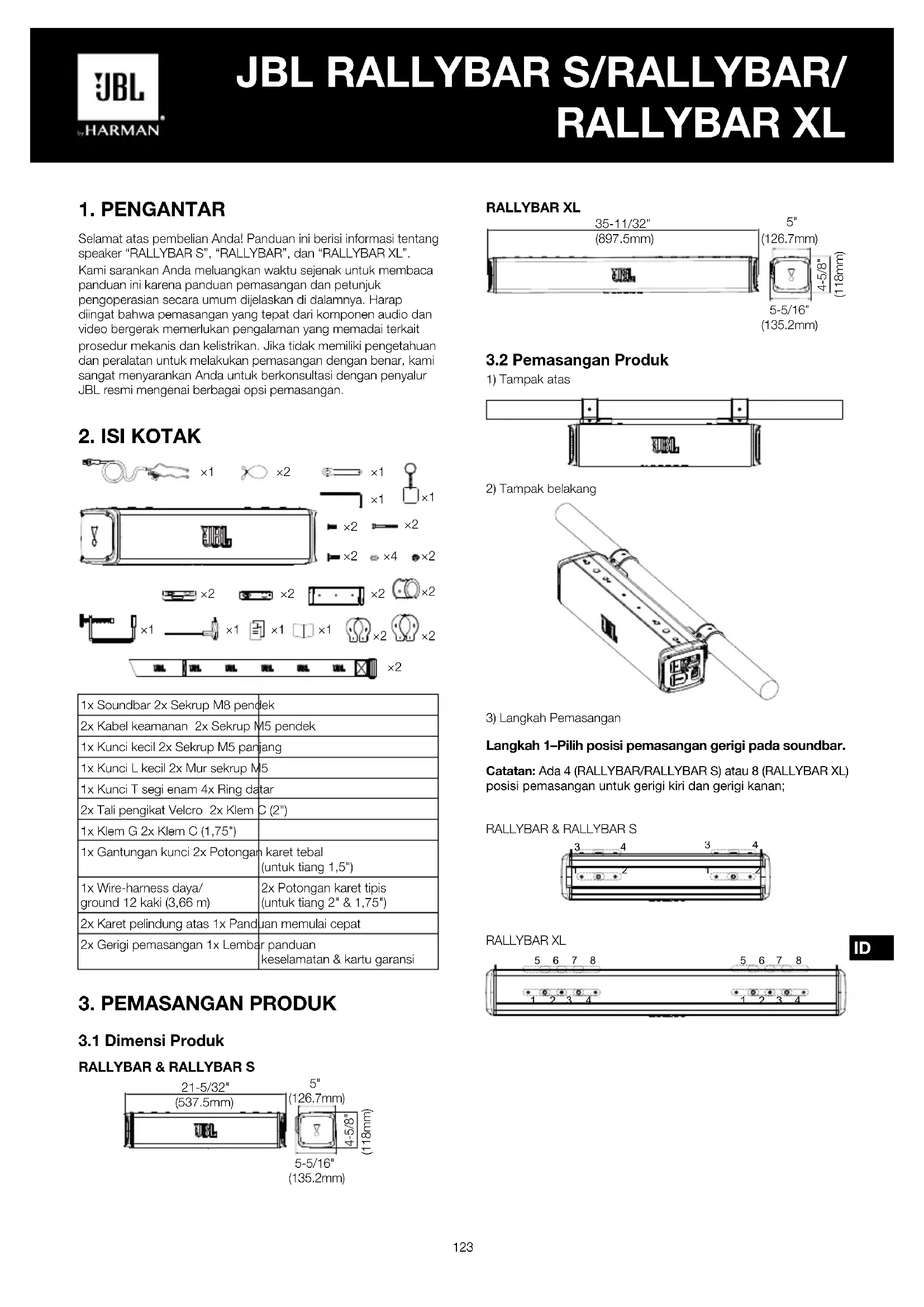 Selamat atas pembelian Anda! Panduan ini berisi informasi tentang speaker “RALLYBAR S”, “RALLYBAR”, dan “RALLYBAR XL”. Kami sarankan Anda meluangkan waktu sejenak untuk membaca panduan ini karena panduan pemasangan dan petunjuk pengoperasian secara umum dijelaskan di dalamnya. Harap diingat bahwa pemasangan yang tepat dari komponen audio dan video bergerak memerlukan pengalaman yang memadai terkait prosedur mekanis dan kelistrikan. Jika tidak memiliki pengetahuan dan peralatan untuk melakukan pemasangan dengan benar, kami sangat menyarankan Anda untuk berkonsultasi dengan penyalur JBL resmi mengenai berbagai opsi pemasangan.