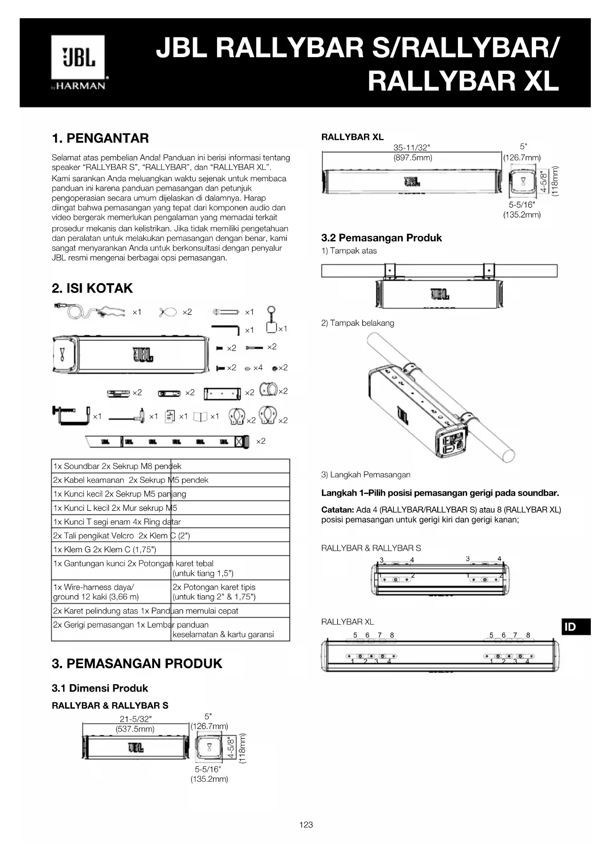 Selamat atas pembelian Anda! Panduan ini berisi informasi tentang speaker “RALLYBAR S”, “RALLYBAR”, dan “RALLYBAR XL”. Kami sarankan Anda meluangkan waktu sejenak untuk membaca panduan ini karena panduan pemasangan dan petunjuk pengoperasian secara umum dijelaskan di dalamnya. Harap diingat bahwa pemasangan yang tepat dari komponen audio dan video bergerak memerlukan pengalaman yang memadai terkait prosedur mekanis dan kelistrikan. Jika tidak memiliki pengetahuan dan peralatan untuk melakukan pemasangan dengan benar, kami sangat menyarankan Anda untuk berkonsultasi dengan penyalur JBL resmi mengenai berbagai opsi pemasangan.