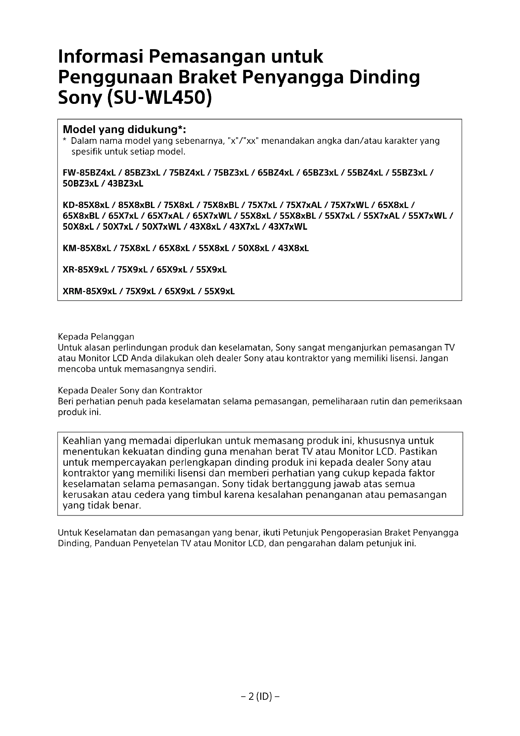 - Dalam nama model yang sebenarnya, "x"/"xx" menandakan angka dan/atau karakter yang spesifik untuk setiap model. FW-85BZ4xL / 85BZ3xL / 75BZ4xL / 75BZ3xL / 65BZ4xL / 65BZ3xL / 55BZ4xL / 55BZ3xL / 50BZ3xL / 43BZ3xL KD-85X8xL / 85X8xBL / 75X8xL / 75X8xBL / 75X7xL / 75X7xAL / 75X7xWL / 65X8xL / 65X8xBL/ 65X7xL / 65X7xAL / 65X7xWL / 55X8xL / 55X8xBL / 55X7xL / 55X7xAL / 55X7xWL / 50X8xL / 50X7xL / 50X7xWL / 43X8xL / 43X7xL / 43X7xWL KM-85X8xL / 75X8xL / 65X8xL / 55X8xL / 50X8xL / 43X8xL XR-85X9xL / 75X9xL / 65X9xL / 55X9xL XRM-85X9xL / 75X9xL / 65X9xL / 55X9xL Kepada Pelanggan Untuk alasan perlindungan produk dan keselamatan, Sony sangat menganjurkan pemasangan TV atau Monitor LCD Anda dilakukan oleh dealer Sony atau kontraktor yang memiliki lisensi. Jangan mencoba untuk memasangnya sendiri. Kepada Dealer Sony dan Kontraktor Beri perhatian penuh pada keselamatan selama pemasangan, pemeliharaan rutin dan pemeriksaan produk ini. Keahlian yang memadai diperlukan untuk memasang produk ini, khususnya untuk menentukan kekuatan dinding guna menahan berat TV atau Monitor LCD. Pastikan untuk mempercayakan perlengkapan dinding produk ini kepada dealer Sony atau kontraktor yang memiliki lisensi dan memberi perhatian yang cukup kepada faktor keselamatan selama pemasangan. Sony tidak bertanggung jawab atas semua kerusakan atau cedera yang timbul karena kesalahan penanganan atau pemasangan yang tidak benar. Untuk Keselamatan dan pemasangan yang benar, ikuti Petunjuk Pengoperasian Braket Penyangga Dinding, Panduan Penyetelan TV atau Monitor LCD, dan pengarahan dalam petunjuk ini.− 3 (ID) −
