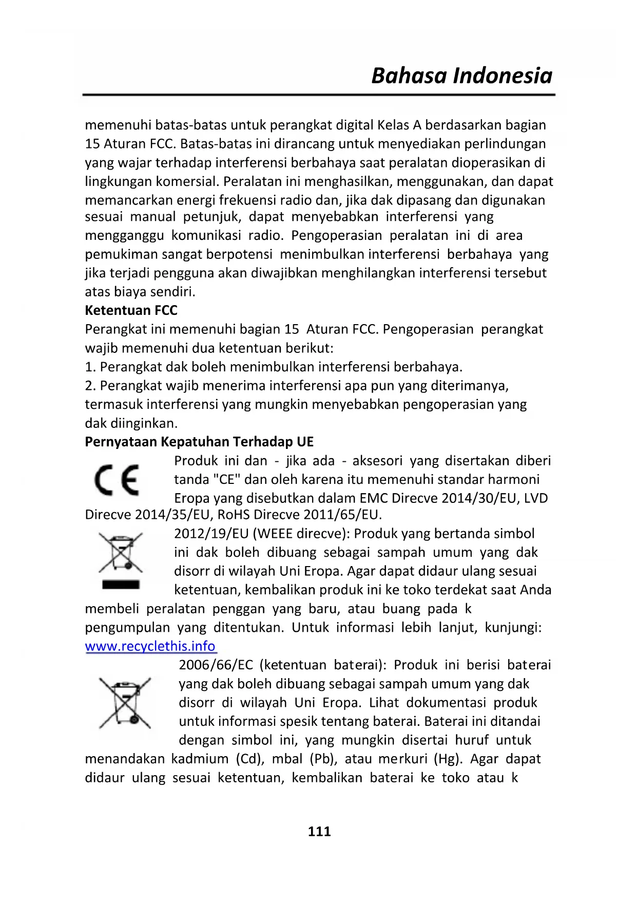 termasuk interferensi yang mungkin menyebabkan pengoperasian yang tidak diinginkan. Pernyataan Kepatuhan Terhadap UE Produk ini dan - jika ada - aksesori yang disertakan diberi tanda "CE" dan oleh karena itu memenuhi standar harmoni Eropa yang disebutkan dalam EMC Directive 2014/30/EU, LVD Directive 2014/35/EU, RoHS Directive 2011/65/EU. 2012/19/EU (WEEE directive): Produk yang bertanda simbol ini tidak boleh dibuang sebagai sampah umum yang tidak disortir di wilayah Uni Eropa. Agar dapat didaur ulang sesuai ketentuan, kembalikan produk ini ke toko terdekat saat Anda membeli peralatan pengganti yang baru, atau buang pada titik pengumpulan yang ditentukan. Untuk informasi lebih lanjut, kunjungi: www.recyclethis.info 2006/66/EC (ketentuan baterai): Produk ini berisi baterai yang tidak boleh dibuang sebagai sampah umum yang tidak disortir di wilayah Uni Eropa. Lihat dokumentasi produk untuk informasi spesifik tentang baterai. Baterai ini ditandai dengan simbol ini, yang mungkin disertai huruf untuk menandakan kadmium (Cd), timbal (Pb), atau merkuri (Hg). Agar dapat didaur ulang sesuai ketentuan, kembalikan baterai ke toko atau titikBahasa Indonesia
