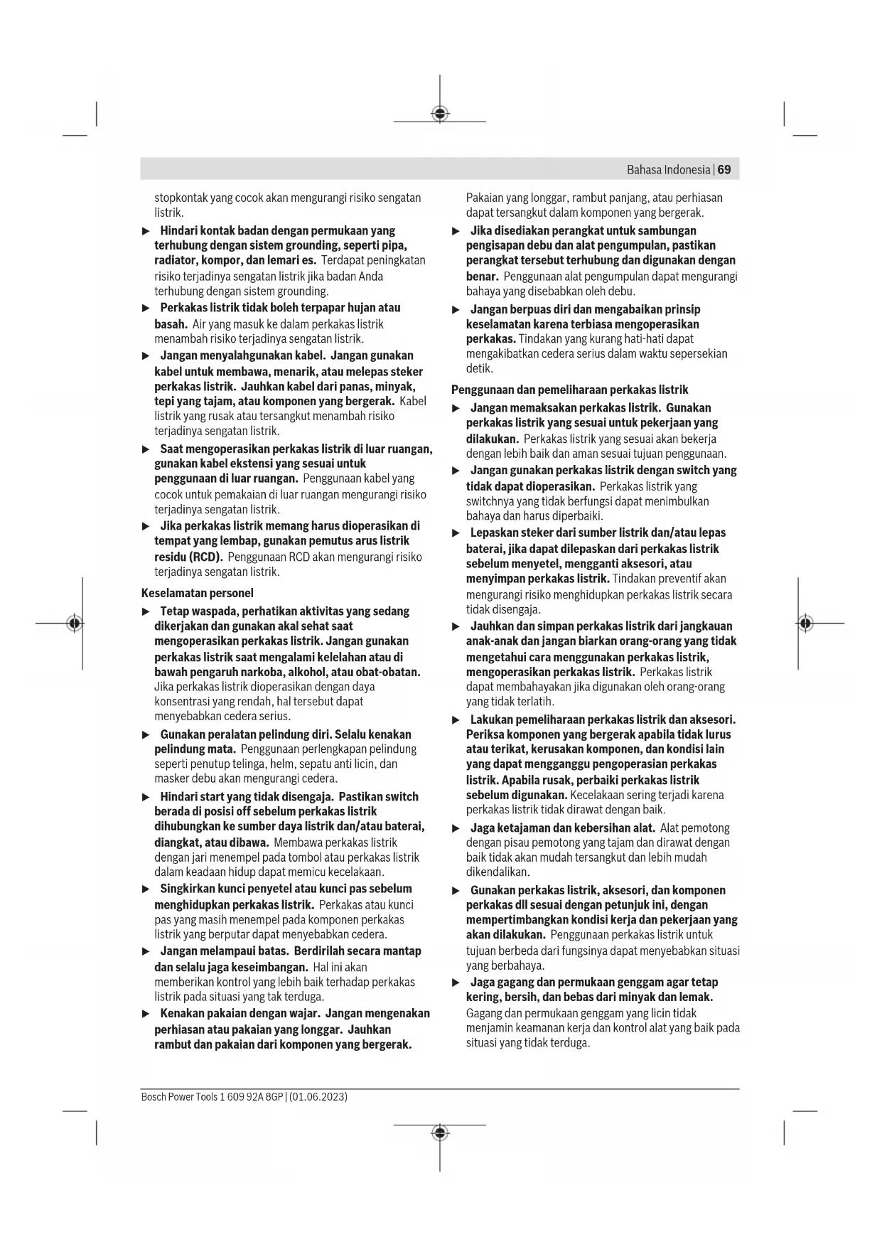 แบตเตอรี่แพ็ค/แบตเตอรี่: ลิเธียม ไอออน: กรุณาปฏิบัติตามคำแนะนำในบทการขนส่ง (ดู "การขนส่ง", หน้า68) Bahasa Indonesia Petunjuk Keselamatan Petunjuk keselamatan umum untuk perkakas listrik PERINGATAN Baca semua peringatan, petunjuk, ilustrasi, dan spesifikasi keselamatan yang diberikan bersama perkakas listrik ini. Kesalahan dalam menjalankan petunjuk di bawah ini dapat mengakibatkan sengatan listrik, kebakaran, dan/atau cedera serius. Simpanlah semua peringatan dan petunjuk untuk penggunaan di masa mendatang. Istilah "perkakas listrik" dalam peringatan mengacu pada perkakas listrik yang dioperasikan dengan listrik (menggunakan kabel) atau perkakas listrik yang dioperasikan dengan baterai (tanpa kabel). Keamanan tempat kerja u Jaga kebersihan dan pencahayaan area kerja. Area yang berantakan atau gelap dapat memicu kecelakaan. u Jangan mengoperasikan perkakas listrik di lingkungan yang dapat memicu ledakan, seperti adanya cairan, gas, atau debu yang mudah terbakar. Perkakas listrik dapat memancarkan bunga api yang kemudian mengakibatkan debu atau uap terbakar. u Jauhkan dari jangkauan anak-anak dan pengamat saat mengoperasikan perkakas listrik. Gangguan dapat menyebabkan hilangnya kendali. Keamanan listrik u Steker perkakas listrik harus sesuai dengan stopkontak. Jangan pernah memodifikasi steker. Jangan menggunakan steker adaptor bersama dengan perkakas listrik yang terhubung dengan sistem grounding. Steker yang tidak dimodifikasi dan 1 609 92A 8GP | (01.06.2023) Bosch Power ToolsBahasa Indonesia | 69 stopkontak yang cocok akan mengurangi risiko sengatan listrik. u Hindari kontak badan dengan permukaan yang terhubung dengan sistem grounding, seperti pipa, radiator, kompor, dan lemari es. Terdapat peningkatan risiko terjadinya sengatan listrik jika badan Anda terhubung dengan sistem grounding. u Perkakas listrik tidak boleh terpapar hujan atau basah. Air yang masuk ke dalam perkakas listrik menambah risiko terjadinya sengatan listrik. u Jangan menyalahgunakan kabel. Jangan gunakan kabel untuk membawa, menarik, atau melepas steker perkakas listrik. Jauhkan kabel dari panas, minyak, tepi yang tajam, atau komponen yang bergerak. Kabel listrik yang rusak atau tersangkut menambah risiko terjadinya sengatan listrik. u Saat mengoperasikan perkakas listrik di luar ruangan, gunakan kabel ekstensi yang sesuai untuk penggunaan di luar ruangan. Penggunaan kabel yang cocok untuk pemakaian di luar ruangan mengurangi risiko terjadinya sengatan listrik. u Jika perkakas listrik memang harus dioperasikan di tempat yang lembap, gunakan pemutus arus listrik residu (RCD). Penggunaan RCD akan mengurangi risiko terjadinya sengatan listrik. Keselamatan personel u Tetap waspada, perhatikan aktivitas yang sedang dikerjakan dan gunakan akal sehat saat mengoperasikan perkakas listrik. Jangan gunakan perkakas listrik saat mengalami kelelahan atau di bawah pengaruh narkoba, alkohol, atau obat-obatan. Jika perkakas listrik dioperasikan dengan daya konsentrasi yang rendah, hal tersebut dapat menyebabkan cedera serius. u Gunakan peralatan pelindung diri. Selalu kenakan pelindung mata. Penggunaan perlengkapan pelindung seperti penutup telinga, helm, sepatu anti licin, dan masker debu akan mengurangi cedera. u Hindari start yang tidak disengaja. Pastikan switch berada di posisi off sebelum perkakas listrik dihubungkan ke sumber daya listrik dan/atau baterai, diangkat, atau dibawa. Membawa perkakas listrik dengan jari menempel pada tombol atau perkakas listrik dalam keadaan hidup dapat memicu kecelakaan. u Singkirkan kunci penyetel atau kunci pas sebelum menghidupkan perkakas listrik. Perkakas atau kunci pas yang masih menempel pada komponen perkakas listrik yang berputar dapat menyebabkan cedera. u Jangan melampaui batas. Berdirilah secara mantap dan selalu jaga keseimbangan. Hal ini akan memberikan kontrol yang lebih baik terhadap perkakas listrik pada situasi yang tak terduga. u Kenakan pakaian dengan wajar. Jangan mengenakan perhiasan atau pakaian yang longgar. Jauhkan rambut dan pakaian dari komponen yang bergerak. Pakaian yang longgar, rambut panjang, atau perhiasan dapat tersangkut dalam komponen yang bergerak. u Jika disediakan perangkat untuk sambungan pengisapan debu dan alat pengumpulan, pastikan perangkat tersebut terhubung dan digunakan dengan benar. Penggunaan alat pengumpulan dapat mengurangi bahaya yang disebabkan oleh debu. u Jangan berpuas diri dan mengabaikan prinsip keselamatan karena terbiasa mengoperasikan perkakas. Tindakan yang kurang hati-hati dapat mengakibatkan cedera serius dalam waktu sepersekian detik. Penggunaan dan pemeliharaan perkakas listrik u Jangan memaksakan perkakas listrik. Gunakan perkakas listrik yang sesuai untuk pekerjaan yang dilakukan. Perkakas listrik yang sesuai akan bekerja dengan lebih baik dan aman sesuai tujuan penggunaan. u Jangan gunakan perkakas listrik dengan switch yang tidak dapat dioperasikan. Perkakas listrik yang switchnya yang tidak berfungsi dapat menimbulkan bahaya dan harus diperbaiki. u Lepaskan steker dari sumber listrik dan/atau lepas baterai, jika dapat dilepaskan dari perkakas listrik sebelum menyetel, mengganti aksesori, atau menyimpan perkakas listrik. Tindakan preventif akan mengurangi risiko menghidupkan perkakas listrik secara tidak disengaja. u Jauhkan dan simpan perkakas listrik dari jangkauan anak-anak dan jangan biarkan orang-orang yang tidak mengetahui cara menggunakan perkakas listrik, mengoperasikan perkakas listrik. Perkakas listrik dapat membahayakan jika digunakan oleh orang-orang yang tidak terlatih. u Lakukan pemeliharaan perkakas listrik dan aksesori. Periksa komponen yang bergerak apabila tidak lurus atau terikat, kerusakan komponen, dan kondisi lain yang dapat mengganggu pengoperasian perkakas listrik. Apabila rusak, perbaiki perkakas listrik sebelum digunakan. Kecelakaan serin