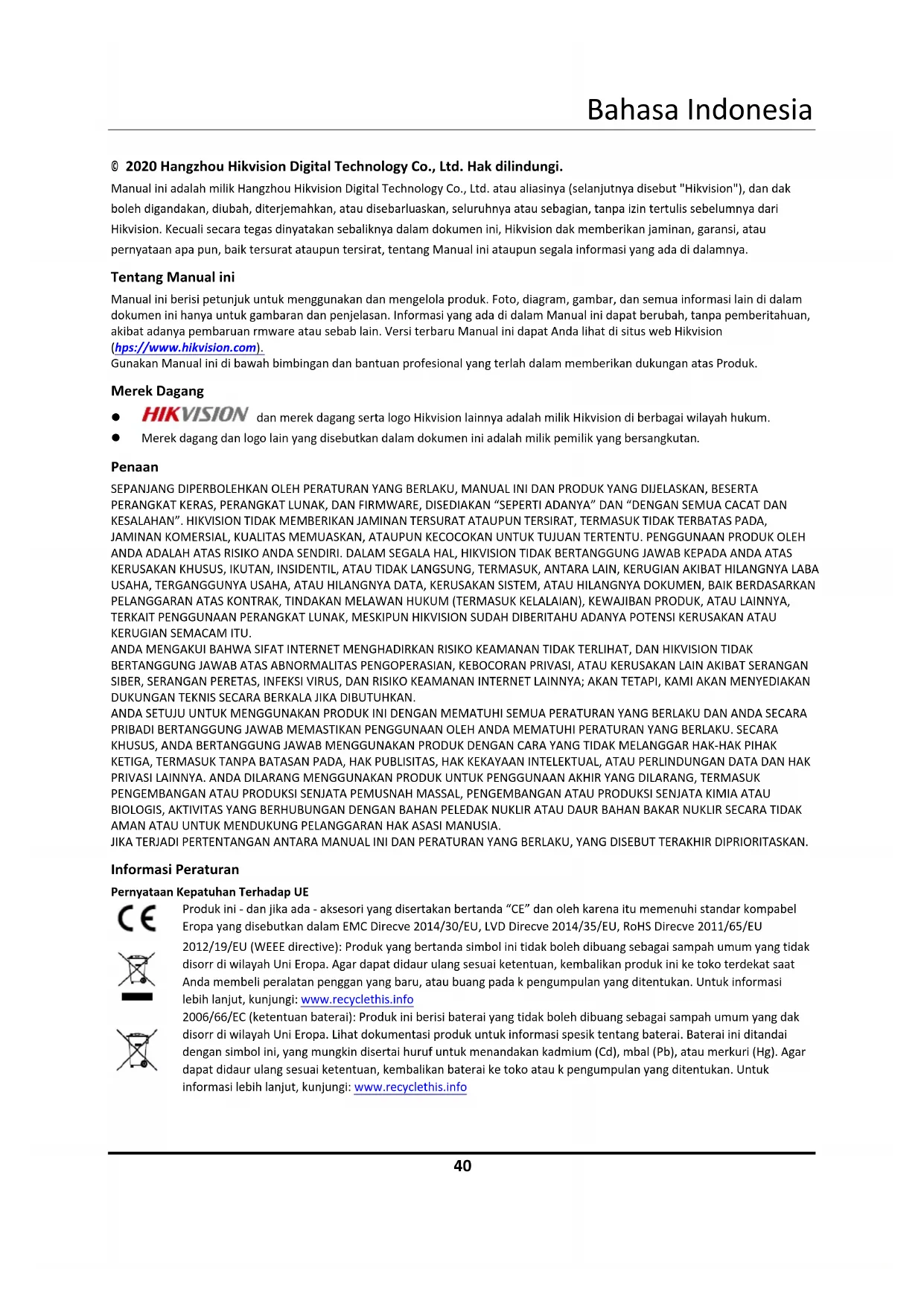 2006/66/EC (ketentuan baterai): Produk ini berisi baterai yang tidak boleh dibuang sebagai sampah umum yang tidak disortir di wilayah Uni Eropa. Lihat dokumentasi produk untuk informasi spesifik tentang baterai. Baterai ini ditandai dengan simbol ini, yang mungkin disertai huruf untuk menandakan kadmium (Cd), timbal (Pb), atau merkuri (Hg). Agar dapat didaur ulang sesuai ketentuan, kembalikan baterai ke toko atau titik pengumpulan yang ditentukan. Untuk informasi lebih lanjut, kunjungi: www.recyclethis.infoBahasa Indonesia