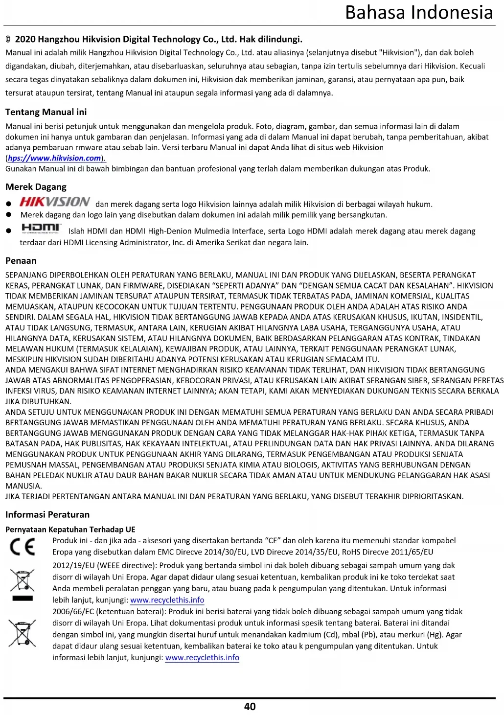 2006/66/EC (ketentuan baterai): Produk ini berisi baterai yang tidak boleh dibuang sebagai sampah umum yang tidak disortir di wilayah Uni Eropa. Lihat dokumentasi produk untuk informasi spesifik tentang baterai. Baterai ini ditandai dengan simbol ini, yang mungkin disertai huruf untuk menandakan kadmium (Cd), timbal (Pb), atau merkuri (Hg). Agar dapat didaur ulang sesuai ketentuan, kembalikan baterai ke toko atau titik pengumpulan yang ditentukan. Untuk informasi lebih lanjut, kunjungi: www.recyclethis.infoBahasa Indonesia
