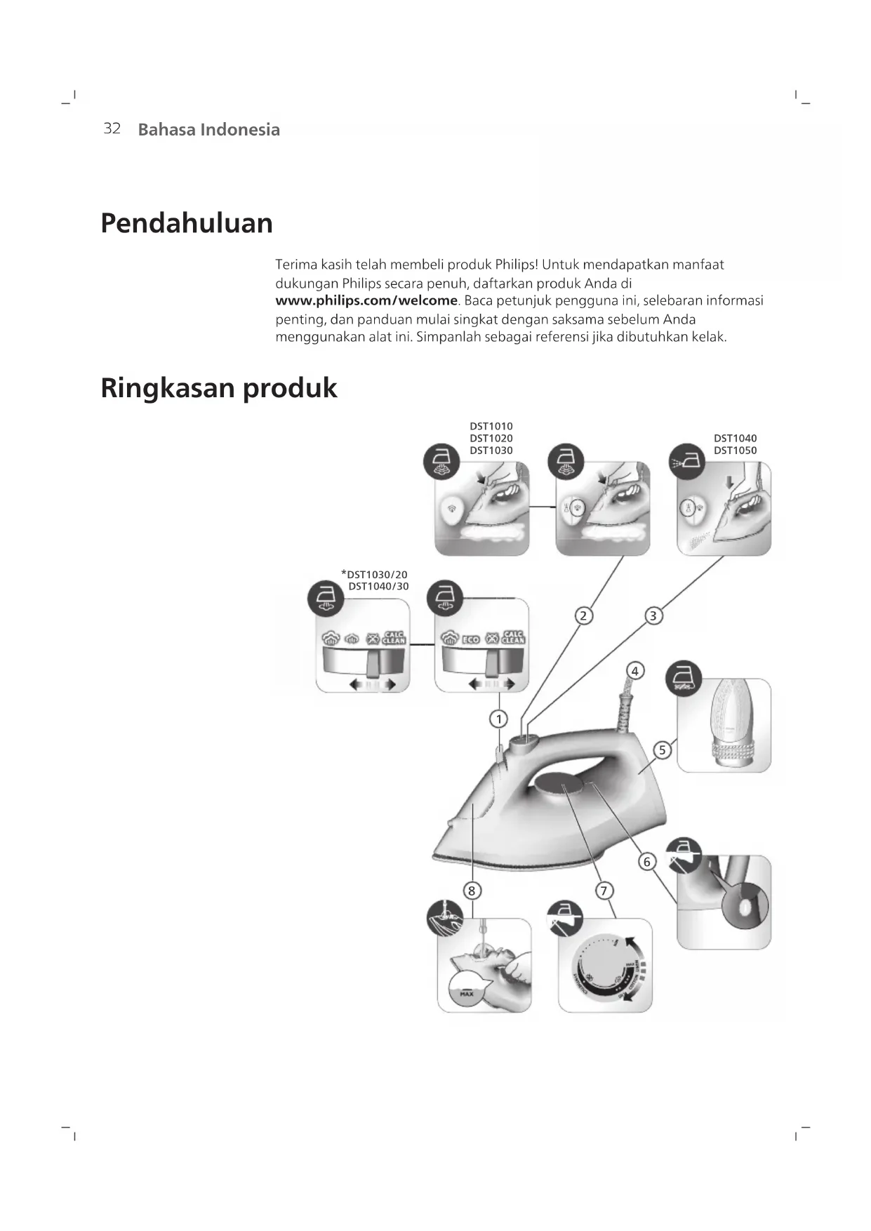 1 Sebaiknya bersihkan kerak pada setrika setiap kali selesai menggunakan setrika untuk memperpanjang masa pakainya, atau ketika terdapat noda berwarna cokelat atau air. 2 Pastikan steker setrika sudah dicabut dari stopkontak dan setrika diatur ke mode tanpa uap (penyetrikaan kering) .42 Bahasa Indonesia 3 Isi tangki air hingga mencapai tanda MAKS. 4 Atur kenop suhu ke MAKS. 5 Colokkan steker setrika ke stopkontak dan pastikan setrika teraliri listrik. 6 Lampu indikator akan menyala yang menandakan setrika sedang dipanaskan. 7 Tunggu hingga lampu indikator padam.43 Bahasa Indonesia 8 Cabut steker setrika dari stopkontak. 9 Pegang setrika di atas wastafel pada posisi horizontal dan goyangkan. Uap, air panas, dan partikel kerak akan keluar dari tapak setrika. Terus goyangkan setrika hingga tangki air benar-benar kosong. 10 Colokkan steker setrika ke stopkontak dan biarkan setrika memanas hingga tapaknya kering. Proses ini membutuhkan waktu sekitar 2 menit. Air mungkin akan menciprat keluar dari lubang uap. Hal ini normal untuk membuang air yang berlebih. 11 Biarkan setrika mendingin dan gulung kabel di sekeliling kaki setrika. Penyimpanan 1 Geser pemilih uap untuk memilih mode tanpa uap (penyetrikaan kering) .44 Bahasa Indonesia 2 Cabut steker setrika dari stopkontak. 3 Biarkan setrika mendingin. 4 Keluarkan sisa air dari dalam tangki air. 5 Gulung kabel listrik di sekeliling bodi setrika.45 Bahasa Indonesia PHILIPS Setrika Uap DST1030; 220V, 400W, 50-60Hz DST1040; 220V, 800W, 50-60Hz Negara Pembuat: Cina Diimport oleh: PT Versuni Homelife Indonesia Gedung Cibis Nine Lantai 10 Jl. T.b. Simatupang No.2 RT.001 RW. 005, Kel, Cilandak Timur, Kec. Pasar Minggu Jakatar Selatan 12560, Indonesia. Reg No: IMKG.989.05.2025Bahasa Melayu