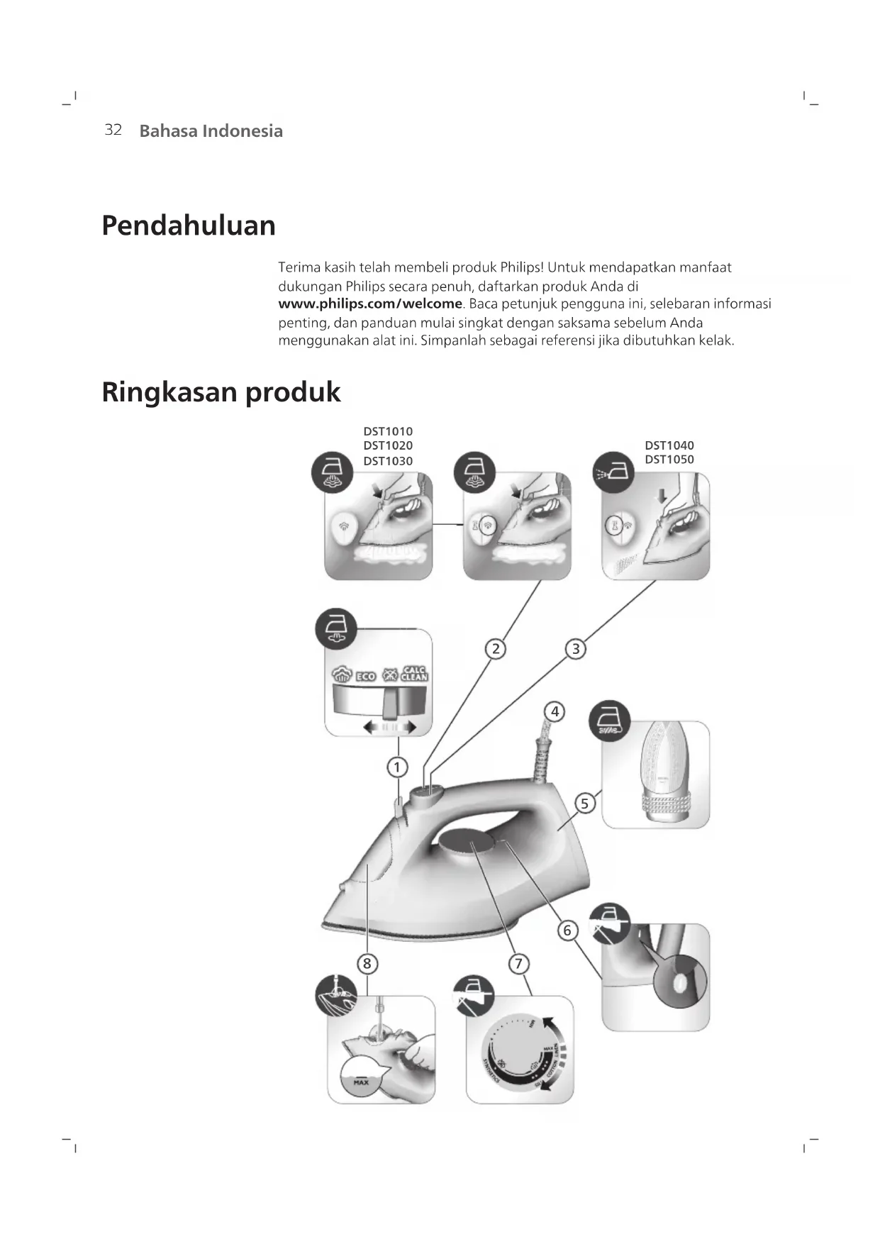 1 Sebaiknya bersihkan kerak pada setrika setiap kali selesai menggunakan setrika untuk memperpanjang masa pakainya, atau ketika terdapat noda berwarna cokelat atau air. 2 Pastikan steker setrika sudah dicabut dari stopkontak dan setrika diatur ke mode tanpa uap (penyetrikaan kering) .42 Bahasa Indonesia 3 Isi tangki air hingga mencapai tanda MAKS. 4 Atur kenop suhu ke MAKS. 5 Colokkan steker setrika ke stopkontak dan pastikan setrika teraliri listrik. 6 Lampu indikator akan menyala yang menandakan setrika sedang dipanaskan. 7 Tunggu hingga lampu indikator padam.43 Bahasa Indonesia 8 Cabut steker setrika dari stopkontak. 9 Pegang setrika di atas wastafel pada posisi horizontal dan goyangkan. Uap, air panas, dan partikel kerak akan keluar dari tapak setrika. Terus goyangkan setrika hingga tangki air benar-benar kosong. 10 Colokkan steker setrika ke stopkontak dan biarkan setrika memanas hingga tapaknya kering. Proses ini membutuhkan waktu sekitar 2 menit. Air mungkin akan menciprat keluar dari lubang uap. Hal ini normal untuk membuang air yang berlebih. 11 Biarkan setrika mendingin dan gulung kabel di sekeliling kaki setrika. Penyimpanan 1 Geser pemilih uap untuk memilih mode tanpa uap (penyetrikaan kering) .44 Bahasa Indonesia 2 Cabut steker setrika dari stopkontak. 3 Biarkan setrika mendingin. 4 Keluarkan sisa air dari dalam tangki air. 5 Gulung kabel listrik di sekeliling bodi setrika.45 Bahasa Indonesia PHILIPS Setrika Uap DST1030; 220V, 400W, 50-60Hz DST1040; 220V, 800W, 50-60Hz Negara Pembuat: Cina Diimport oleh: PT Versuni Homelife Indonesia Gedung Cibis Nine Lantai 10 Jl. T.b. Simatupang No.2 RT.001 RW. 005, Kel, Cilandak Timur, Kec. Pasar Minggu Jakatar Selatan 12560, Indonesia. Reg No: IMKG.989.05.2025Bahasa Melayu