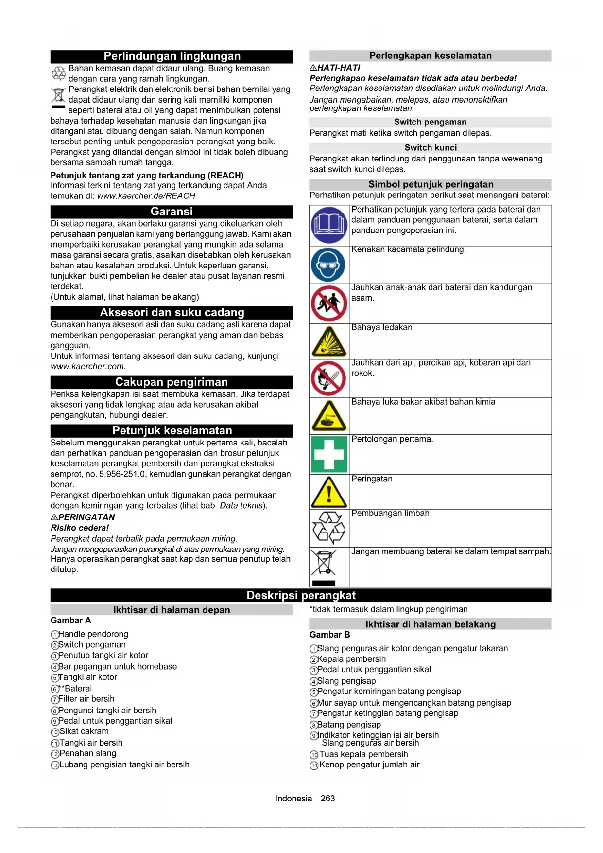 - Pernyataan kesesuaian Uni Eropa Indonesia 263 Perlindungan lingkungan Bahan kemasan dapat didaur ulang. Buang kemasan dengan cara yang ramah lingkungan. Perangkat elektrik dan elektronik berisi bahan bernilai yang dapat didaur ulang dan sering kali memiliki komponen seperti baterai atau oli yang dapat menimbulkan potensi bahaya terhadap kesehatan manusia dan lingkungan jika ditangani atau dibuang dengan salah. Namun komponen tersebut penting untuk pengoperasian perangkat yang baik. Perangkat yang ditandai dengan simbol ini tidak boleh dibuang bersama sampah rumah tangga. Petunjuk tentang zat yang terkandung (REACH) Informasi terkini tentang zat yang terkandung dapat Anda temukan di: www.kaercher.de/REACH Garansi Di setiap negara, akan berlaku garansi yang dikeluarkan oleh perusahaan penjualan kami yang bertanggung jawab. Kami akan memperbaiki kerusakan perangkat yang mungkin ada selama masa garansi secara gratis, asalkan disebabkan oleh kerusakan bahan atau kesalahan produksi. Untuk keperluan garansi, tunjukkan bukti pembelian ke dealer atau pusat layanan resmi terdekat. (Untuk alamat, lihat halaman belakang) Aksesori dan suku cadang Gunakan hanya aksesori asli dan suku cadang asli karena dapat memberikan pengoperasian perangkat yang aman dan bebas gangguan. Untuk informasi tentang aksesori dan suku cadang, kunjungi www.kaercher.com. Cakupan pengiriman Periksa kelengkapan isi saat membuka kemasan. Jika terdapat aksesori yang tidak lengkap atau ada kerusakan akibat pengangkutan, hubungi dealer. Petunjuk keselamatan Sebelum menggunakan perangkat untuk pertama kali, bacalah dan perhatikan panduan pengoperasian dan brosur petunjuk keselamatan perangkat pembersih dan perangkat ekstraksi semprot, no. 5.956-251.0, kemudian gunakan perangkat dengan benar. Perangkat diperbolehkan untuk digunakan pada permukaan dengan kemiringan yang terbatas (lihat bab Data teknis). 몇 PERINGATAN Risiko cedera! Perangkat dapat terbalik pada permukaan miring. Jangan mengoperasikan perangkat di atas permukaan yang miring. Hanya operasikan perangkat saat kap dan semua penutup telah ditutup. Perlengkapan keselamatan 몇 HATI-HATI Perlengkapan keselamatan tidak ada atau berbeda! Perlengkapan keselamatan disediakan untuk melindungi Anda. Jangan mengabaikan, melepas, atau menonaktifkan perlengkapan keselamatan. Switch pengaman Perangkat mati ketika switch pengaman dilepas. Switch kunci Perangkat akan terlindung dari penggunaan tanpa wewenang saat switch kunci dilepas. Simbol petunjuk peringatan Perhatikan petunjuk peringatan berikut saat menangani baterai: Deskripsi perangkat Ikhtisar di halaman depan Gambar A 1 Handle pendorong 2 Switch pengaman 3 Penutup tangki air kotor 4 Bar pegangan untuk homebase 5 Tangki air kotor 6 **Baterai 7 Filter air bersih 8 Pengunci tangki air bersih 9 Pedal untuk penggantian sikat 10 Sikat cakram 11 Tangki air bersih 12 Penahan slang 13 Lubang pengisian tangki air bersih *tidak termasuk dalam lingkup pengiriman Ikhtisar di halaman belakang Gambar B 1 Slang penguras air kotor dengan pengatur takaran 2 Kepala pembersih 3 Pedal untuk penggantian sikat 4 Slang pengisap 5 Pengatur kemiringan batang pengisap 6 Mur sayap untuk mengencangkan batang pengisap 7 Pengatur ketinggian batang pengisap 8 Batang pengisap 9 Indikator ketinggian isi air bersih Slang penguras air bersih 10 Tuas kepala pembersih 11 Kenop pengatur jumlah air Perhatikan petunjuk yang tertera pada baterai dan dalam panduan penggunaan baterai, serta dalam panduan pengoperasian ini. Kenakan kacamata pelindung. Jauhkan anak-anak dari baterai dan kandungan asam. Bahaya ledakan Jauhkan dari api, percikan api, kobaran api dan rokok. Bahaya luka bakar akibat bahan kimia Pertolongan pertama. Peringatan Pembuangan limbah Jangan membuang baterai ke dalam tempat sampah.264 Indonesia 12 Tuas batang pengisap 13 Steker baterai 14 Switch kunci 15 Display 16 Selektor putar kecepatan pengoperasian 17 Switch arah pengoperasian Ikhtisar kepala R Gambar D 1 Kepala R 2 Roda bumper 3 Bilah distribusi air 4 Tepi samping 5 Laci penyapu Ikhtisar tangki air kotor Gambar E 1 Filter kotoran kasar 2 Filter bulu halus 3 Pelampung Pelat tipe Gambar C 1 Pelat tipe Kode warna ● Elemen pengoperasian untuk proses pembersihan berwarna kuning. ● Elemen pengoperasian untuk perawatan dan servis berwarna abu-abu muda. Simbol pada perangkat *opsional Pemasangan Bongkar muat p. 271