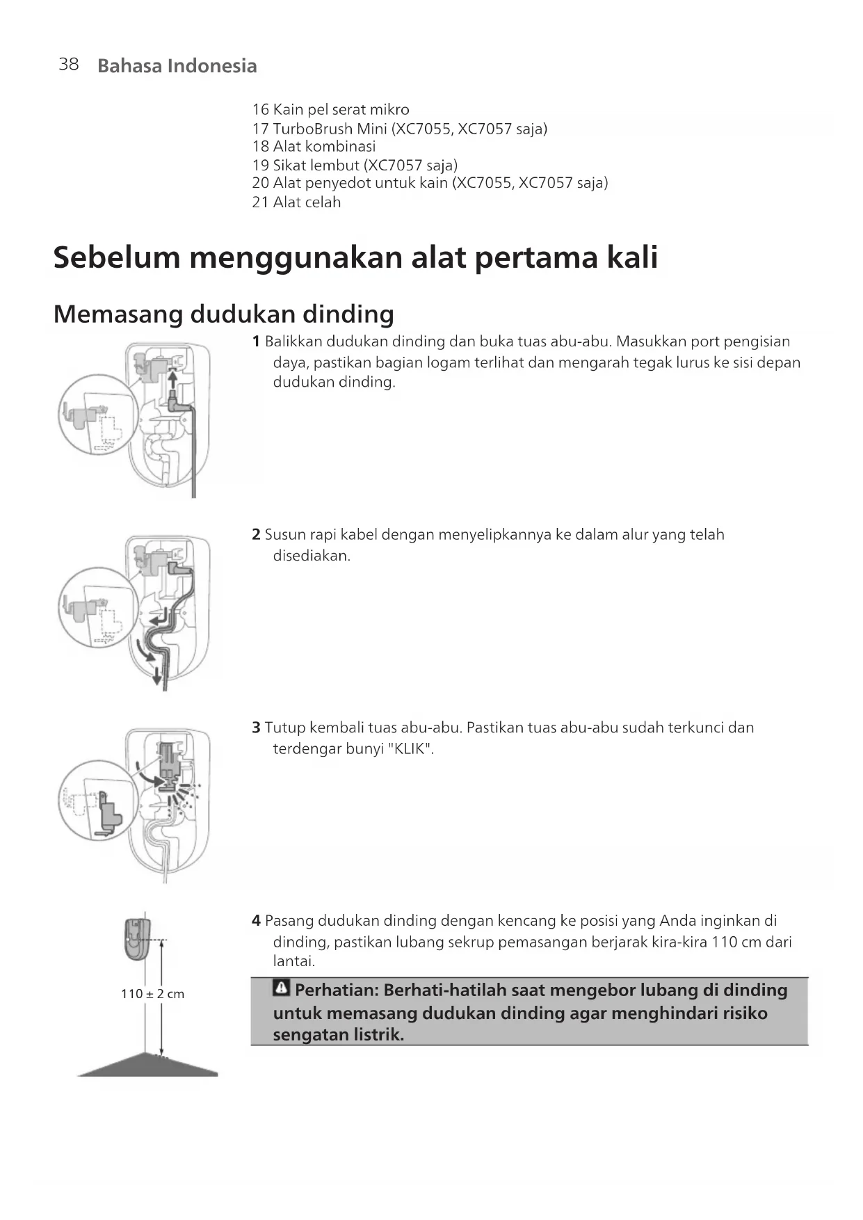 hrs 5 Kering anginkan filter busa yang sudah dicuci selama 24 jam sebelum memasangnya kembali ke dalam wadah filter. 6 Untuk pemeliharaan menyeluruh, bersihkan wadah debu dan siklon di bawah air mengalir atau di dalam air sabun hangat. 7 Lap wadah debu yang sudah dibersihkan dan semua bagiannya hingga kering.55 Bahasa Indonesia Perhatian: Pastikan semua komponen sudah benar-benar kering sebelum dirangkai kembali. Catatan: semua komponennya tidak dapat dibersihkan dengan mesin pencuci piring.