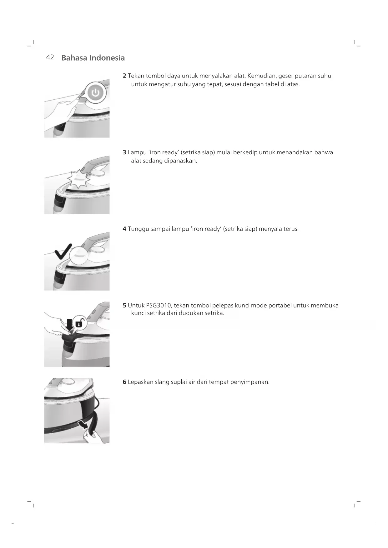 1 Tekan tuas di gagang tangki air dan lepaskan tangki air dari dudukannya. 2 Isi tangki air hingga tanda MAX. 3 Tekan tangki air ke dalam alat hingga terkunci di tempatnya (terdengar bunyi ‘klik’).41 Bahasa Indonesia Seri PSG2000 1 Buka pintu pengisian tangki air.2 Isi tangki air hingga tanda MAX, lalu tutup pintunya (terdengar bunyi ‘klik’). Menggunakan alat Anda Setelan suhu Setelan suhu Setelan uap otomatis Jenis kain Sintetis (misalnya asetat, akrilik,nilon, viskos, poliamida, polyester)Sutera hingga MAX Katun, linenECO ECO Semua kecuali untuk kain sintetis Menyetrika 1 Masukkan steker listrik pada stopkontak dinding yang telah dibumikan.42 Bahasa Indonesia 2 Tekan tombol daya untuk menyalakan alat. Kemudian, geser putaran suhu untuk mengatur suhu yang tepat, sesuai dengan tabel di atas. 3 Lampu ‘iron ready’ (setrika siap) mulai berkedip untuk menandakan bahwa alat sedang dipanaskan. 4 Tunggu sampai lampu ‘iron ready’ (setrika siap) menyala terus. 5 Untuk PSG3010, tekan tombol pelepas kunci mode portabel untuk membuka kunci setrika dari dudukan setrika. 6 Lepaskan slang suplai air dari tempat penyimpanan.43 Bahasa Indonesia 7 Tekan lama pemicu uap untuk mulai menyetrika. Catatan: Mungkin akan ada air yang menciprat setiap kali setrika mulai digunakan. Tekan pemicu uap selama 10 detik sebelum menyetrika untuk mencegah noda air pada pakaian. Catatan: Ketika mulai menyetrika, dan khususnya saat pertama kali menggunakan pemicu uap, uap bisa saja baru mulai keluar setelah 30 detik. Catatan: Pompa akan diaktifkan setiap kali Anda menekan pemicu uap. Akan terdengar lirih bunyi berderik. Jika tidak ada air di dalam tangki air, bunyi pompa akan makin keras. Peringatan: Jangan sekali-kali mengarahkan uap ke orang. Menyetrika dalam posisi berdiri Anda dapat menggunakan setrika uap dalam posisi berdiri untuk menghilangkan kerutan dari pakaian yang digantung. 1 Pegang setrika dalam posisi berdiri dan tekan pemicu uap. Kemudian, kenakan sedikit tapak setrika pada kain dan gerakkan setrik ke atas dan ke bawah. Peringatan: Setrika mengeluarkan uap panas. Jangan sekali-kali mencoba menghilangkan kerutan di pakaian yang sedang dikenakan. Jangan mengarahkan uap di dekat tangan Anda atau tangan orang lain.44 Bahasa Indonesia Semburan uap 1 Fungsi semburan uap hanya tersedia dari 3 titik hingga suhu MAKS.