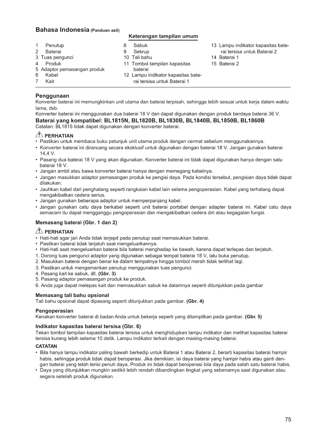 1 Penutup 2 Baterai 3 Tuas pengunci 4 Produk 5 Adaptor pemasangan produk 6 Kabel 7 Kait 8 Sabuk 9 Sekrup 10 Tali bahu 11 Tombol tampilan kapasitas baterai 12 Lampu indikator kapasitas bate- rai tersisa untuk Baterai 1 13 Lampu indikator kapasitas bate- rai tersisa untuk Baterai 2 14 Baterai 1 15 Baterai 2 Bahasa Indonesia (Panduan asli) Keterangan tampilan umum Penggunaan Konverter baterai ini memungkinkan unit utama dan baterai terpisah, sehingga lebih sesuai untuk kerja dalam waktu lama, dsb. Konverter baterai ini menggunakan dua baterai 18 V dan dapat digunakan dengan produk berdaya baterai 36 V. Baterai yang kompatibel: BL1815N, BL1820B, BL1830B, BL1840B, BL1850B, BL1860B Catatan: BL1815 tidak dapat digunakan dengan konverter baterai. PERHATIAN