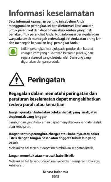 Peringatan Kegagalan dalam mematuhi peringatan dan peraturan keselamatan dapat mengakibatkan cedera parah atau kematian Jangan gunakan kabel atau colokan listrik yang rusak, atau stopkontak yang longgar Sambungan yang tidak aman dapat menyebabkan sengatan listrik atau kebakaran. Jangan sentuh perangkat, charger atau kabelnya, atau soket listrik dengan tangan basah atau anggota tubuh lain yang basah Melakukan hal tersebut dapat menimbulkan sengatan listrik. Jangan menekuk atau merusak kabel listrik Melakukan hal tersebut dapat menyebabkan sengatan listrik atau kebakaran. Bahasa Indonesia