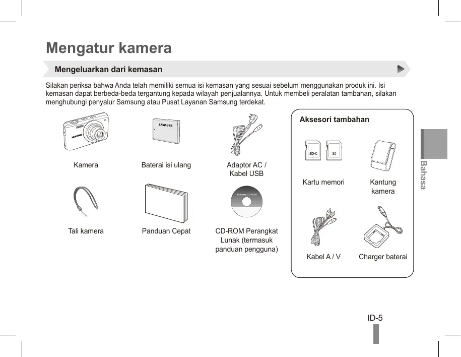 Silakan periksa bahwa Anda telah memilki semua isi kemasan yang sesuai sebelum menggunakan produk ini. si kemasan dapat berbeda-beda tergantung kepada wilayah penjualannya. Untuk membeli peralatan tambahan, silakan menghubungi penyalur Samsung atau Pusat Layanan Samsung terdekat.