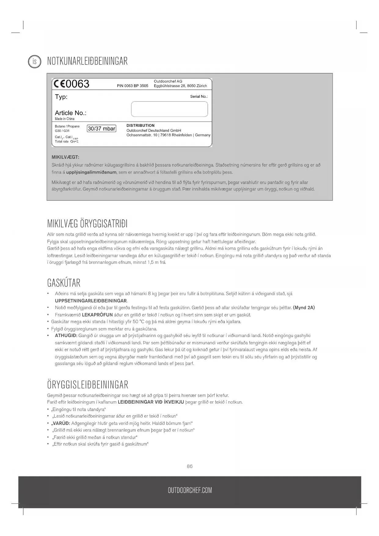 Ef um ábyrgðartilvik er að ræða skaltu hafa samband eins fljótt og auðið er við okkur eða viðurkenndan söluaðila (lista yfir söluaðila er að finna á www.outdoorchef.com) og tilgreina eftir því sem hægt er vöruna/hluta vörunnar, sölukvittun, raðnúmer og vörunúmer (koma bæði fram á upplýsingalímmiða á grillinu; sjá fyrsta kaflann í notkunarleiðbeiningunum), ásamt heimilisfangi þínu. Þú mátt gjarnan láta mynd fylgja með lýsingunni á gallanum. Skilaðu vörunni til söluaðilans eða okkar svo við getum prófað vöruna og kannað hvort ábyrgðin gildi. Í réttmætum ábyrgðartilvikum munum við endurgreiða nauðsynlegan flutnings- og sendingarkostnað, annars munum við senda vöruna til baka á þinn kostnað. Eftirfarandi fyrirtæki er fulltrúi fyrir skráða vörumerkið OUTDOORCHEF Outdoorchef AG | Eggbühlstrasse 28 | Postfach | 8050 Zürich-Schweiz | www.outdoorchef.comOUTDOORCHEF.COM