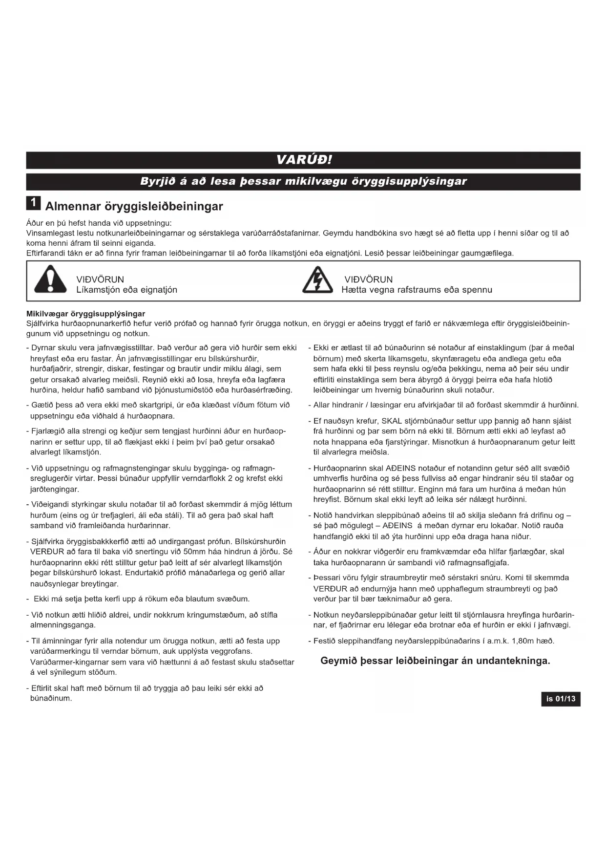 - 37 Samræmisyfirlýsing is 01/13 Almennar öryggisleiðbeiningar Áður en þú hefst handa við uppsetningu: Vinsamlegast lestu notkunarleiðbeiningarnar og sérstaklega varúðarráðstafanirnar. Geymdu handbókina svo hægt sé að fletta upp í henni síðar og til að koma henni áfram til seinni eiganda. Eftirfarandi tákn er að finna fyrir framan leiðbeiningarnar til að forða líkamstjóni eða eignatjóni. Lesið þessar leiðbeiningar gaumgæfilega. Mikilvægar öryggisupplýsingar Sjálfvirka hurðaopnunarkerfið hefur verið prófað og hannað fyrir örugga notkun, en öryggi er aðeins tryggt ef farið er nákvæmlega eftir öryggisleiðbeinin- gunum við uppsetningu og notkun. p. 13