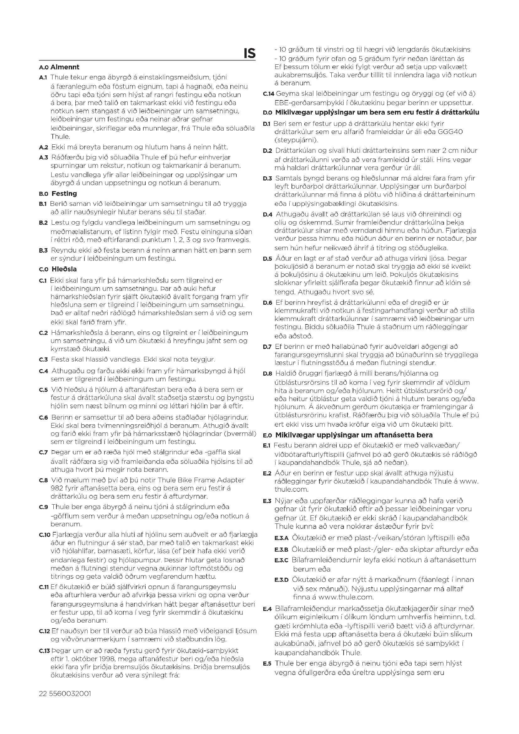 A.0 Almennt A.1 Thule tekur enga ábyrgð á einstaklingsmeiðslum, tjóni áfæranlegum eða föstum eignum, tapi á hagnaði, eða neinu öðru tapi eða tjóni sem hlýst af rangri festingu eða notkun ábera, þar með talið en takmarkast ekki við festingu eða notkun sem stangast á við leiðbeiningar um samsetningu, leiðbeiningar um festingu eða neinar aðrar gefnar leiðbeiningar, skriflegar eða munnlegar, frá Thule eða söluaðila Thule. A.2 Ekki má breyta beranum og hlutum hans á neinn hátt. A.3 Ráðfærðu þig við söluaðila Thule ef þú hefur einhverjar spurningar um rekstur, notkun og takmarkanir á beranum. Lestu vandlega yfir allar leiðbeiningar og upplýsingar um ábyrgð á undan uppsetningu og notkun á beranum. B.0 Festing B.1 Berið saman við leiðbeiningar um samsetningu til að tryggja að allir nauðsynlegir hlutar berans séu til staðar. B.2 Lestu og fylgdu vandlega leiðbeiningum um samsetningu og meðmælalistanum, ef listinn fylgir með. Festu eininguna síðan íréttri röð, með eftirfarandi punktum 1, 2, 3 og svo framvegis. B.3 Reyndu ekki að festa berann á neinn annan hátt en þann sem er sýndur í leiðbeiningum um festingu. C.0 Hleðsla C.1 Ekki skal fara yfir þá hámarkshleðslu sem tilgreind er í leiðbeiningum um samsetningu. Þar að auki hefur hámarkshleðslan fyrir sjálft ökutækið ávallt forgang fram yfir hleðsluna sem er tilgreind í leiðbeiningum um samsetningu. Það er alltaf neðri ráðlögð hámarkshleðslan sem á við og sem ekki skal farið fram yfir. C.2 Hámarkshleðsla á berann, eins og tilgreint er í leiðbeiningum um samsetningu, á við um ökutæki á hreyfingu jafnt sem og kyrrstæð ökutæki. C.3 Festa skal hlassið vandlega. Ekki skal nota teygjur. C.4 Athugaðu og farðu ekki ekki fram yfir hámarksþyngd á hjól sem er tilgreind í leiðbeiningum um festingu. C.5 Við hleðslu á hjólum á aftanáfestan bera eða á bera sem er festur á dráttarkúluna skal ávallt staðsetja stærstu og þyngstu hjólin sem næst bílnum og minni og léttari hjólin þar á eftir. C.6 Berinn er samsettur til að bera aðeins staðlaðar hjólagrindur. Ekki skal bera tvímenningsreiðhjól á beranum. Athugið ávallt og farið ekki fram yfir þá hámarksstærð hjólagrindar (þvermál) sem er tilgreind í leiðbeiningum um festingu. C.7 Þegar um er að ræða hjól með stálgrindur eða -gaa skal ávallt ráðfæra sig við framleiðanda eða söluaðila hjólsins til að athuga hvort þú megir nota berann. C.8 Við mælum með því að þú notir Thule Bike Frame Adapter 982fyrir aftanásetta bera, eins og bera sem eru festir á dráttarkúlu og bera sem eru festir á afturdyrnar. C.9 Thule ber enga ábyrgð á neinu tjóni á stálgrindum eða -göum sem verður á meðan uppsetningu og/eða notkun á beranum. C.10 Fjarlægja verður alla hluti af hjólinu sem auðvelt er að fjarlægja áður en flutningur á sér stað, þar með talið en takmarkast ekki við hjólahlífar, barnasæti, körfur, lása (ef þeir hafa ekki verið endanlega festir) og hjólapumpur. Þessir hlutar geta losnað meðan á flutningi stendur vegna aukinnar loftmótstöðu og titrings og geta valdið öðrum vegfarendum hættu. C.11 Ef ökutækið er búið sjálfvirkri opnun á farangursgeymslu eða afturhlera verður að afvirkja þessa virkni og opna verður farangursgeymsluna á handvirkan hátt þegar aftanásettur beri er festur upp, til að koma í veg fyrir skemmdir á ökutækinu og/eða beranum. C.12 Ef nauðsyn ber til verður að búa hlassið með viðeigandi ljósum og viðvörunarmerkjum í samræmi við staðbundin lög. C.13 Þegar um er að ræða fyrstu gerð fyrir ökutæki-samþykkt eftir 1. október 1998, mega aftanáfestur beri og/eða hleðsla ekki fara yfir þriðja bremsuljós ökutækisins. Þriðja bremsuljós ökutækisins verður að vera sýnilegt frá: - 10 gráðum til vinstri og til hægri við lengdarás ökutækisins - 10 gráðum fyrir ofan og 5 gráðum fyrir neðan láréttan ás Ef þessum tölum er ekki fylgt verður að setja upp valkvætt aukabremsuljós. Taka verður tilllit til innlendra laga við notkun áberanum. C.14 Geyma skal leiðbeiningar um festingu og öryggi og (ef við á) EBE-gerðarsamþykki í ökutækinu þegar berinn er uppsettur. D.0 Mikilvægar upplýsingar um bera sem eru festir á dráttarkúlu D.1 Beri sem er festur upp á dráttarkúlu hentar ekki fyrir dráttarkúlur sem eru alfarið framleiddar úr áli eða GGG40 (steypujárni). D.2 Dráttarkúlan og sívali hluti dráttarteinsins sem nær 2 cm niður af dráttarkúlunni verða að vera framleidd úr stáli. Hins vegar má haldari dráttarkúlunnar vera gerður úr áli. D.3 Samtals þyngd berans og hleðslunnar má aldrei fara fram yfir leyft burðarþol dráttarkúlunnar. Upplýsingar um burðarþol dráttarkúlunnar má finna á plötu við hliðina á dráttarteininum eða íupplýsingabæklingi ökutækisins. D.4 Athugaðu ávallt að dráttarkúlan sé laus við óhreinindi og olíu og óskemmd. Sumir framleiðendur dráttarkúlna þekja dráttarkúlur sínar með verndandi himnu eða húðun. Fjarlægja verður þessa himnu eða húðun áður en berinn er notaður, þar sem hún hefur neikvæð áhrif á titring og stöðugleika. D.5 Áður en lagt er af stað verður að athuga virkni ljósa. Þegar þokuljósið á beranum er notað skal tryggja að ekki sé kveikt áþokuljósinu á ökutækinu um leið. Þokuljós ökutækisins slokknar yfirleitt sjálfkrafa þegar ökutækið finnur að klóin sé tengd. Athugaðu hvort svo sé. D.6 Ef berinn hreyfist á dráttarkúlunni eða ef dregið er úr klemmukrafti við notkun á festingarhandfangi verður að stilla klemmukraft dráttarkúlunnar í samræmi við leiðbeiningar um festingu. Biddu söluaðila Thule á staðnum um ráðleggingar eða aðstoð. D.7 Ef berinn er með hallabúnað fyrir auðveldari aðgengi að farangursgeymslunni sk