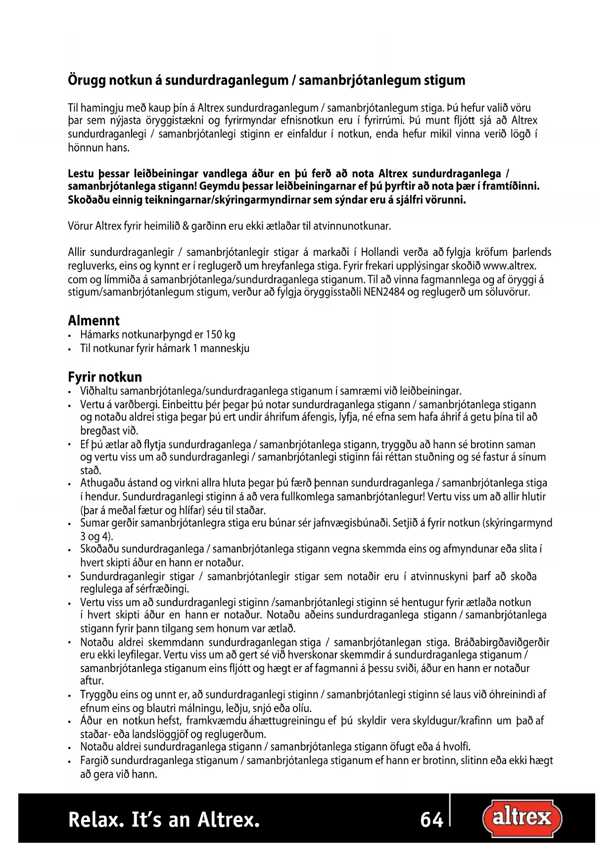 5.Örugg notkun á sundurdraganlegum / samanbrjótanlegum stigum Til hamingju með kaup þín á Altrex sundurdraganlegum / samanbrjótanlegum stiga. Þú hefur valið vöru þar sem nýjasta öryggistækni og fyrirmyndar efnisnotkun eru í fyrirrúmi. Þú munt fljótt sjá að Altrex sundurdraganlegi / samanbrjótanlegi stiginn er einfaldur í notkun, enda hefur mikil vinna verið lögð í hönnun hans. Lestu þessar leiðbeiningar vandlega áður en þú ferð að nota Altrex sundurdraganlega / samanbrjótanlega stigann! Geymdu þessar leiðbeiningarnar ef þú þyrftir að nota þær í framtíðinni. Skoðaðu einnig teikningarnar/skýringarmyndirnar sem sýndar eru á sjálfri vörunni. Vörur Altrex fyrir heimilið & garðinn eru ekki ætlaðar til atvinnunotkunar. Allir sundurdraganlegir / samanbrjótanlegir stigar á markaði í Hollandi verða að fylgja kröfum þarlends regluverks, eins og kynnt er í reglugerð um hreyfanlega stiga. Fyrir frekari upplýsingar skoðið www.altrex. com og límmiða á samanbrjótanlega/sundurdraganlega stiganum. Til að vinna fagmannlega og af öryggi á stigum/samanbrjótanlegum stigum, verður að fylgja öryggisstaðli NEN2484 og reglugerð um söluvörur. Almennt Hámarks notkunarþyngd er 150 kg Til notkunar fyrir hámark 1 manneskju Fyrir notkun Viðhaltu samanbrjótanlega/sundurdraganlega stiganum í samræmi við leiðbeiningar. Vertu á varðbergi. Einbeittu þér þegar þú notar sundurdraganlega stigann / samanbrjótanlega stigann og notaðu aldrei stiga þegar þú ert undir áhrifum áfengis, lyfja, né efna sem hafa áhrif á getu þína til að bregðast við. Ef þú ætlar að flytja sundurdraganlega / samanbrjótanlega stigann, tryggðu að hann sé brotinn saman og vertu viss um að sundurdraganlegi / samanbrjótanlegi stiginn fái réttan stuðning og sé fastur á sínum stað. Athugaðu ástand og virkni allra hluta þegar þú færð þennan sundurdraganlega / samanbrjótanlega stiga í hendur. Sundurdraganlegi stiginn á að vera fullkomlega samanbrjótanlegur! Vertu viss um að allir hlutir (þar á meðal fætur og hlífar) séu til staðar. Sumar gerðir samanbrjótanlegra stiga eru búnar sér jafnvægisbúnaði. Setjið á fyrir notkun (skýringarmynd 3 og 4). Skoðaðu sundurdraganlega / samanbrjótanlega stigann vegna skemmda eins og afmyndunar eða slita í hvert skipti áður en hann er notaður. Sundurdraganlegir stigar / samanbrjótanlegir stigar sem notaðir eru í atvinnuskyni þarf að skoða reglulega af sérfræðingi. Vertu viss um að sundurdraganlegi stiginn /samanbrjótanlegi stiginn sé hentugur fyrir ætlaða notkun í hvert skipti áður en hann er notaður. Notaðu aðeins sundurdraganlega stigann / samanbrjótanlega stigann fyrir þann tilgang sem honum var ætlað. Notaðu aldrei skemmdann sundurdraganlegan stiga / samanbrjótanlegan stiga. Bráðabirgðaviðgerðir eru ekki leyfilegar. Vertu viss um að gert sé við hverskonar skemmdir á sundurdraganlega stiganum / samanbrjótanlega stiganum eins fljótt og hægt er af fagmanni á þessu sviði, áður en hann er notaður aftur. Tryggðu eins og unnt er, að sundurdraganlegi stiginn / samanbrjótanlegi stiginn sé laus við óhreinindi af efnum eins og blautri málningu, leðju, snjó eða olíu. Áður en notkun hefst, framkvæmdu áhættugreiningu ef þú skyldir vera skyldugur/krafinn um það af staðar- eða landslöggjöf og reglugerðum. Notaðu aldrei sundurdraganlega stigann / samanbrjótanlega stigann öfugt eða á hvolfi. Fargið sundurdraganlega stiganum / samanbrjótanlega stiganum ef hann er brotinn, slitinn eða ekki hægt að gera við hann.