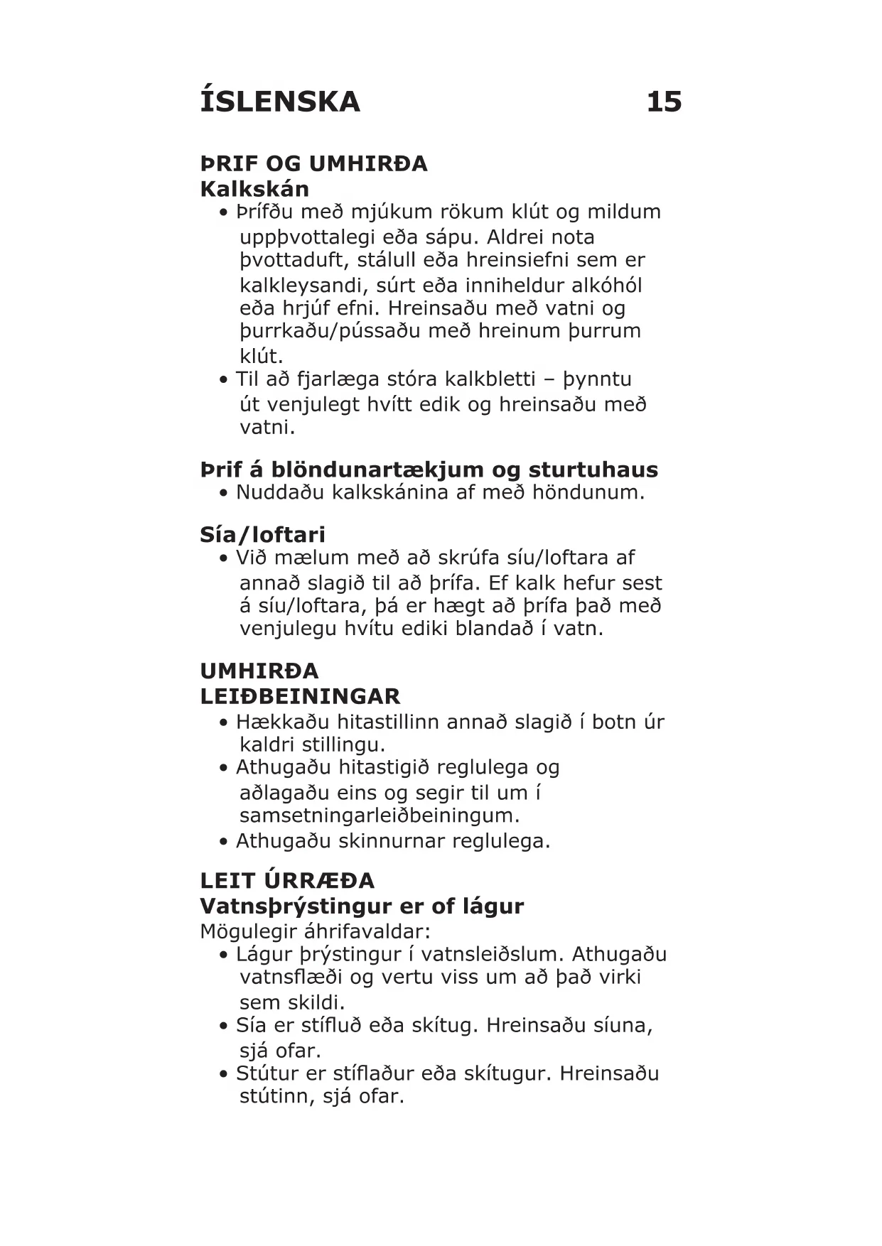 - Stútur er stíaður eða skítugur. Hreinsaðu stútinn, sjá ofar. ÍSLENSKA16 Hitastig vatns er lægra/hærra en forstillingin Mögulegar orsakir: