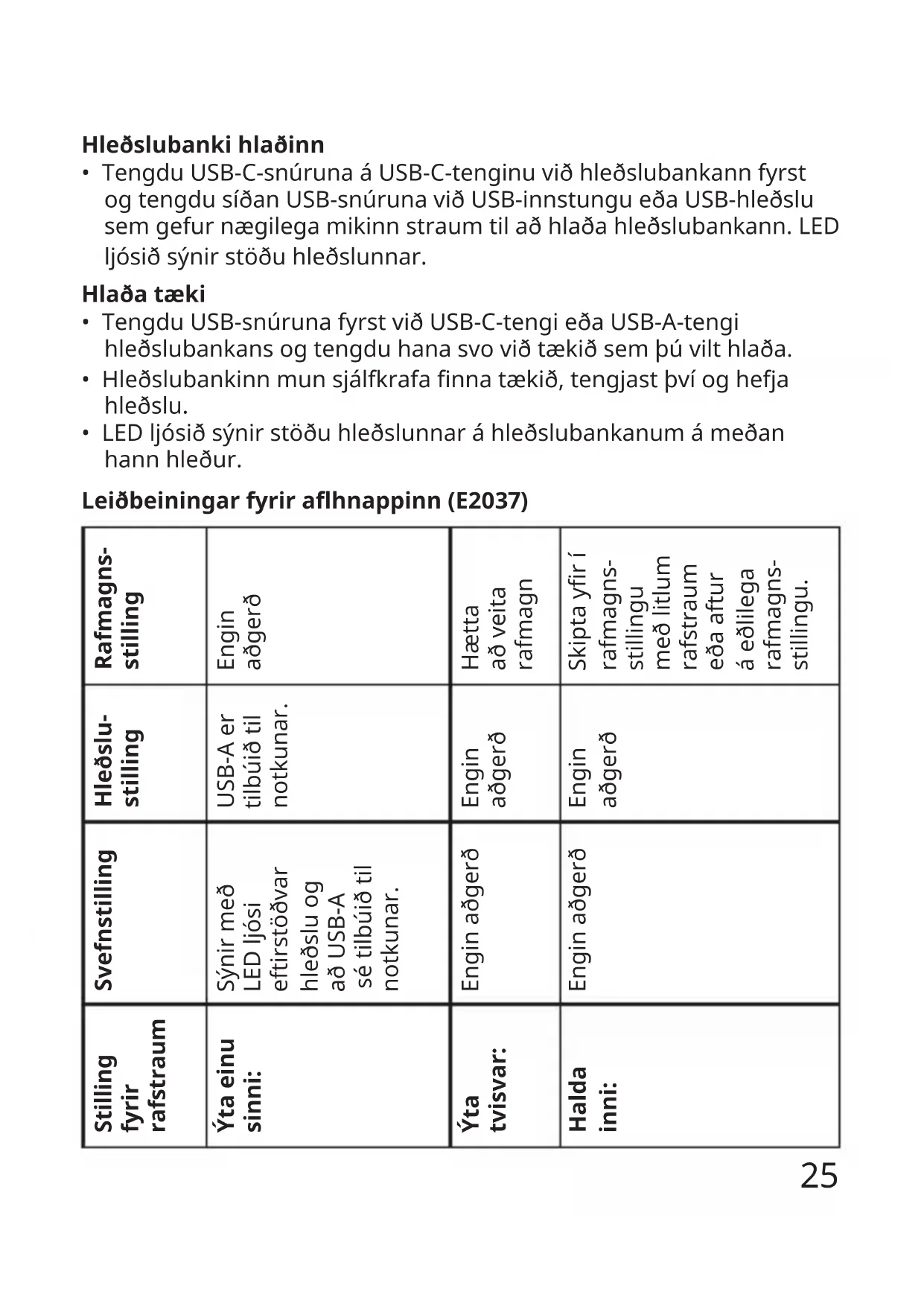 - LED ljósið sýnir stöðu hleðslunnar á hleðslubankanum á meðan hann hleður. Leiðbeiningarfyrirahnappinn(E2037) Rafmagns- stilling Engin aðgerð Hætta að veita rafmagn Skipta yr í rafmagns- stillingu með litlum rafstraum eða aftur á eðlilega rafmagns- stillingu. Hleðslu- stilling USB-A er tilbúið til notkunar. Engin aðgerð Engin aðgerð Svefnstilling Sýnir með LED ljósi eftirstöðvar hleðslu og að USB-A sé tilbúið til notkunar. Engin aðgerð Engin aðgerð Stilling fyrir rafstraum Ýta einu sinni: Ýta tvisvar: Halda inni:26 Athuga stöðu rafhlöðu