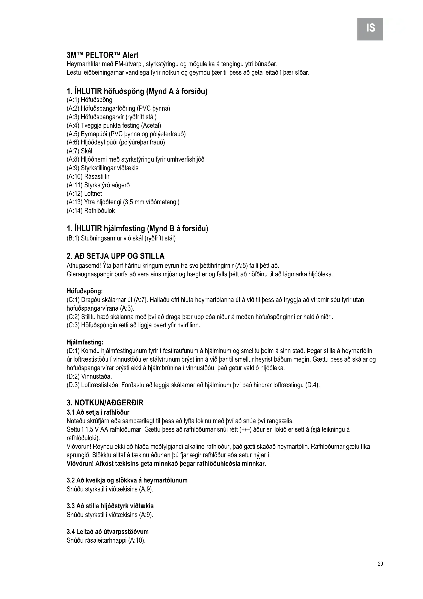 - Setja heyrnarhlífarnar upp og stilla þær, hreinsa og halda við í samræmi við leiðbeiningar í notendahandbókinni. Skoða þarf reglubundið hvort heyrnarhlífarnar þarfnist þjónustueftirlits. Viðvörun! Sé ekki farið eftir leiðbeiningunum, gæti það haft mjög neikvæð áhrif á vernd þá sem þau veita.