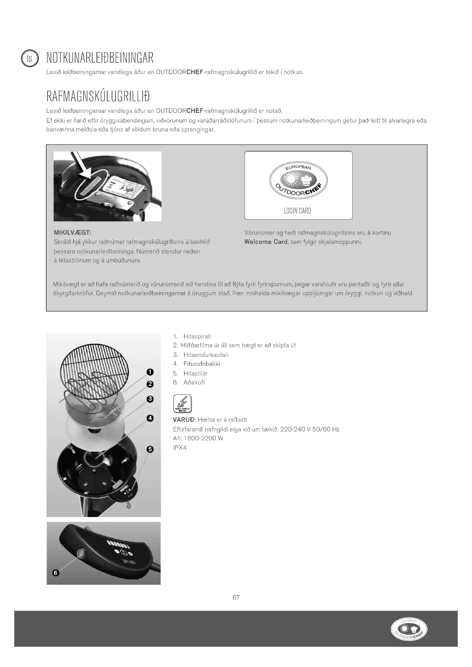 VARÚÐ: Hætta er á raflosti Eftirfarandi nafngildi eiga við um tækið: 220-240 V 50/60 Hz Afl: 1800-2200 W IPX4 Mikilvægt er að hafa raðnúmerið og vörunúmerið við hendina til að flýta fyrir fyrirspurnum, þegar varahlutir eru pantaðir og fyrir allar ábyrgðarkröfur. Geymið notkunarleiðbeiningarnar á öruggum stað. Þær innihalda mikilvægar upplýsingar um öryggi, notkun og viðhald. LOGIN CARD MIKILVÆGT: Skráið hjá ykkur raðnúmer rafmagnskúlugrillsins á bakhlið þessara notkunarleiðbeininga. Númerið stendur neðan áhitastillinum og á umbúðunum. Vörunúmer og heiti rafmagnskúlugrillsins eru á kortinu WelcomeCard, sem fylgir skjalamöppunni.
