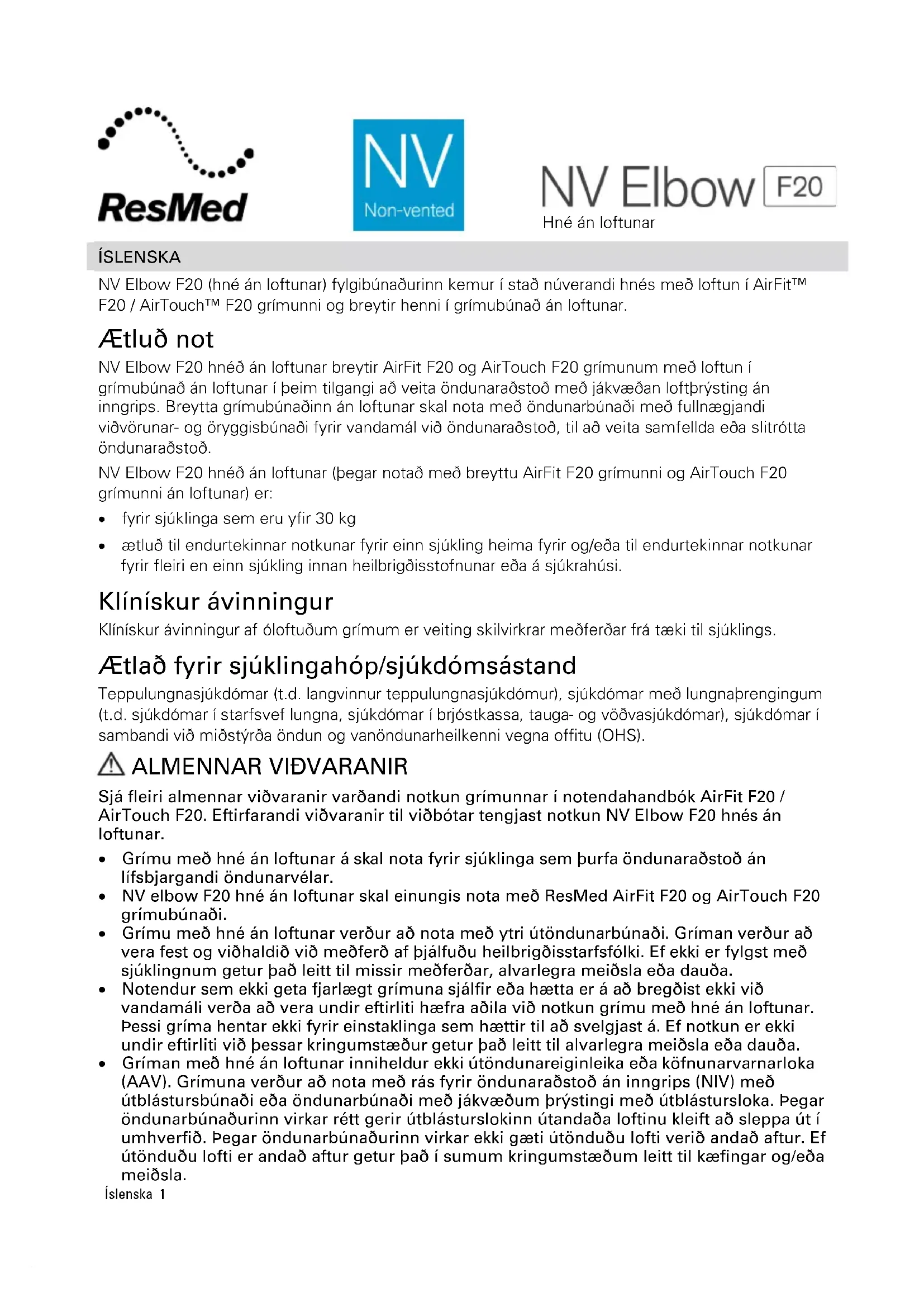 - NV elbow F20 hné án loftunar skal einungis nota með ResMed AirFit F20 og AirTouch F20 grímubúnaði.