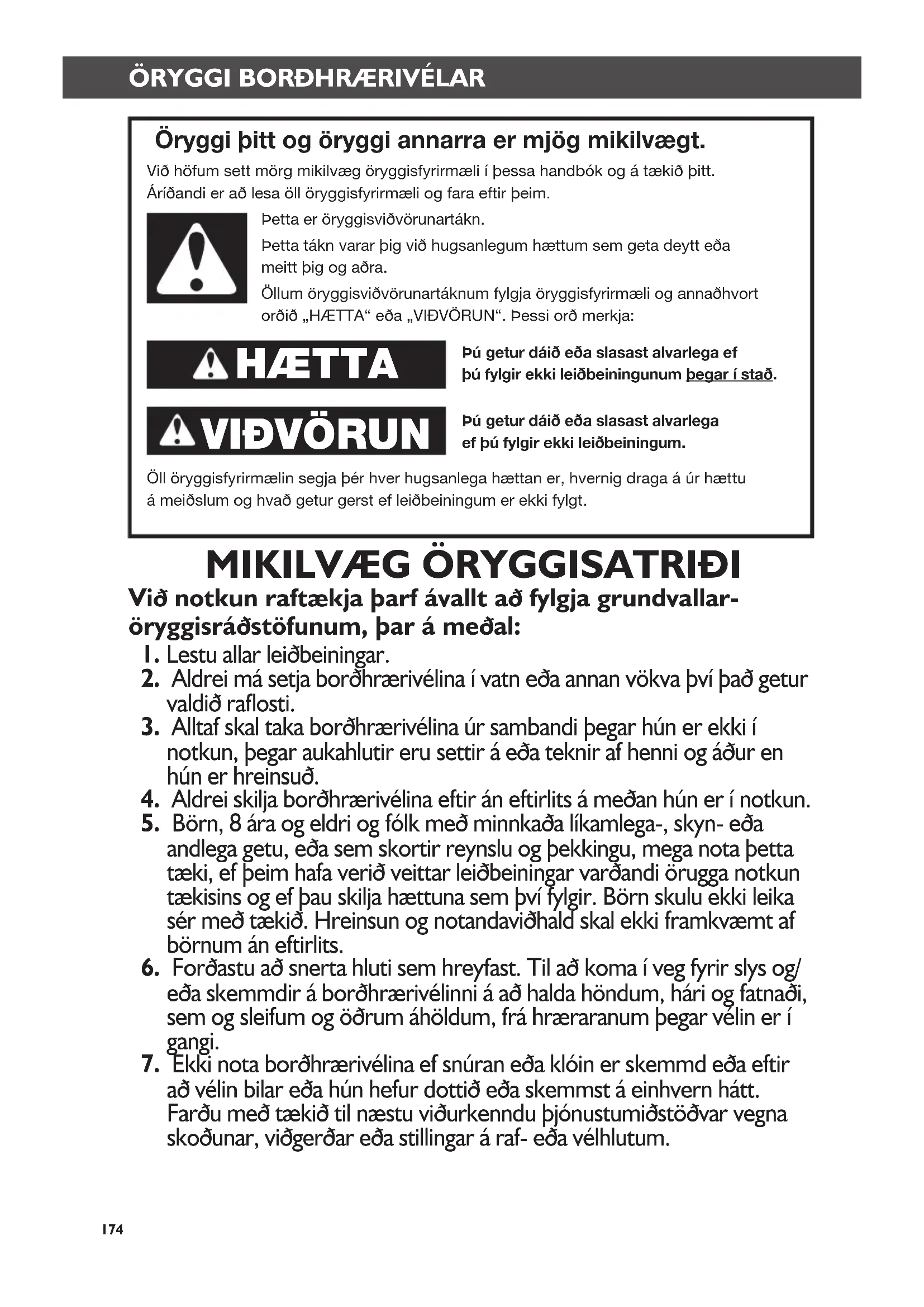 Öryggi þitt og öryggi annarra er mjög mikilvægt. Við höfum sett mörg mikilvæg öryggisfyrirmæli í þessa handbók og á tækið þitt. Áríðandi er að lesa öll öryggisfyrirmæli og fara eftir þeim. Þetta er öryggisviðvörunartákn. Þetta tákn varar þig við hugsanlegum hættum sem geta deytt eða meitt þig og aðra. Öllum öryggisviðvörunartáknum fylgja öryggisfyrirmæli og annaðhvort orðið „HÆTTA“ eða „VIÐVÖRUN“. Þessi orð merkja: Þú getur dáið eða slasast alvarlega ef þú fylgir ekki leiðbeiningunum þegar í stað. Þú getur dáið eða slasast alvarlega ef þú fylgir ekki leiðbeiningum. Öll öryggisfyrirmælin segja þér hver hugsanlega hættan er, hvernig draga á úr hættu á meiðslum og hvað getur gerst ef leiðbeiningum er ekki fylgt. HÆTTA