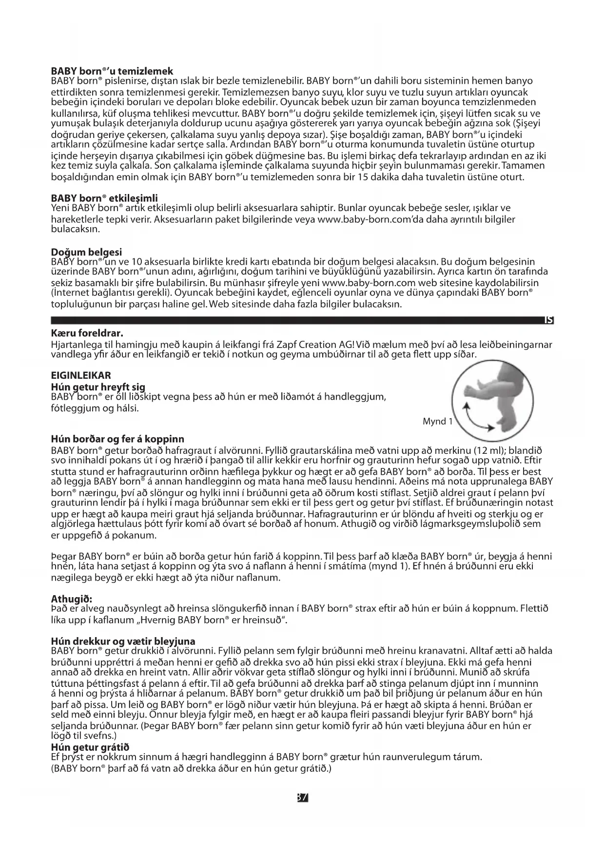 Kæru foreldrar. Hjartanlega til hamingju með kaupin á leikfangi frá Zapf Creation AG! Við mælum með því að lesa leiðbeiningarnar vandlega yr áður en leikfangið er tekið í notkun og geyma umbúðirnar til að geta ett upp síðar. EIGINLEIKAR Hún getur hreyft sig BABY born® er öll liðskipt vegna þess að hún er með liðamót á handleggjum, fótleggjum og hálsi. Hún borðar og fer á koppinn BABY born® getur borðað hafragraut í alvörunni. Fyllið grautarskálina með vatni upp að merkinu (12 ml); blandið svo innihaldi pokans út í og hrærið í þangað til allir kekkir eru horfnir og grauturinn hefur sogað upp vatnið. Eftir stutta stund er hafragrauturinn orðinn hælega þykkur og hægt er að gefa BABY born® að borða. Til þess er best að leggja BABY born® á annan handlegginn og mata hana með lausu hendinni. Aðeins má nota upprunalega BABY born® næringu, því að slöngur og hylki inni í brúðunni geta að öðrum kosti stíast. Setjið aldrei graut í pelann því grauturinn lendir þá í hylki í maga brúðunnar sem ekki er til þess gert og getur því stíast. Ef brúðunæringin notast upp er hægt að kaupa meiri graut hjá seljanda brúðunnar. Hafragrauturinn er úr blöndu af hveiti og sterkju og er algjörlega hættulaus þótt fyrir komi að óvart sé borðað af honum. Athugið og virðið lágmarksgeymsluþolið sem er uppgeð á pokanum. Þegar BABY born® er búin að borða getur hún farið á koppinn. Til þess þarf að klæða BABY born® úr, beygja á henni hnén, láta hana setjast á koppinn og ýta svo á naann á henni í smátíma (mynd 1). Ef hnén á brúðunni eru ekki nægilega beygð er ekki hægt að ýta niður naanum. Athugið: Það er alveg nauðsynlegt að hreinsa slöngukerð innan í BABY born® strax eftir að hún er búin á koppnum. Flettið líka upp í kaanum „Hvernig BABY born® er hreinsuð“. Hún drekkur og vætir bleyjuna BABY born® getur drukkið í alvörunni. Fyllið pelann sem fylgir brúðunni með hreinu kranavatni. Alltaf ætti að halda brúðunni uppréttri á meðan henni er geð að drekka svo að hún pissi ekki strax í bleyjuna. Ekki má gefa henni annað að drekka en hreint vatn. Allir aðrir vökvar geta stíað slöngur og hylki inni í brúðunni. Munið að skrúfa túttuna þéttingsfast á pelann á eftir. Til að gefa brúðunni að drekka þarf að stinga pelanum djúpt inn í munninn á henni og þrýsta á hliðarnar á pelanum. BABY born® getur drukkið um það bil þriðjung úr pelanum áður en hún þarf að pissa. Um leið og BABY born® er lögð niður vætir hún bleyjuna. Þá er hægt að skipta á henni. Brúðan er seld með einni bleyju. Önnur bleyja fylgir með, en hægt er að kaupa eiri passandi bleyjur fyrir BABY born® hjá seljanda brúðunnar. (Þegar BABY born® fær pelann sinn getur komið fyrir að hún væti bleyjuna áður en hún er lögð til svefns.) Hún getur grátið Ef þrýst er nokkrum sinnum á hægri handlegginn á BABY born® grætur hún raunverulegum tárum. (BABY born® þarf að fá vatn að drekka áður en hún getur grátið.) Mynd 138 Það má baða hana Hægt er að baða BABY born® í baðkerinu eða fara með hana í sundlaugina. Þó ætti ekki að kaæra hana í vatninu. Aldrei á að láta Baby born vera lengi óvarða í beinu sólarljósi (hámark 1 klst.). Áður en BABY born® er böðuð þarf að ganga úr skugga um að ventillinn á bakinu á henni sé lokaður (skoran á snúanlega lokinu á að vera lóðrétt). Til að baða hana má eingöngu nota kalt eða volgt vatn og venjuleg baðefni fyrir börn. BABY born® ætti ekki að vera lengur en 3 tíma í baðvatni né heldur í klórblönduðu eða söltu vatni, því þá er ekki hægt að útiloka kemísk áhrif eða upplitun á efni brúðunnar. Eftir baðið á að hreinsa BABY born® með hreinu kranavatni. Ef vatn kemst inn í BABY born® í baðinu má þurrka hana aftur á eftirfarandi hátt: Opnið ventilinn á bakinu á BABY born® með því að snúa lokinu gætilega rangsælis með skrúárni eða smápeningi og síðan toga í það út. Það er ekki hægt að taka lokið alveg af! Vatninu má ná út með því að hrista brúðuna gætilega fram og aftur (látið bakið snúa niður). Endurtakið þetta nokkrum sinnum. Ef þarf má þurrka brúðuna í 2-3 klukkustundir með ventilinn opinn til að losna við allan raka. Eftir þurrkun á að snúa lokinu aftur réttsælis. Athugið: