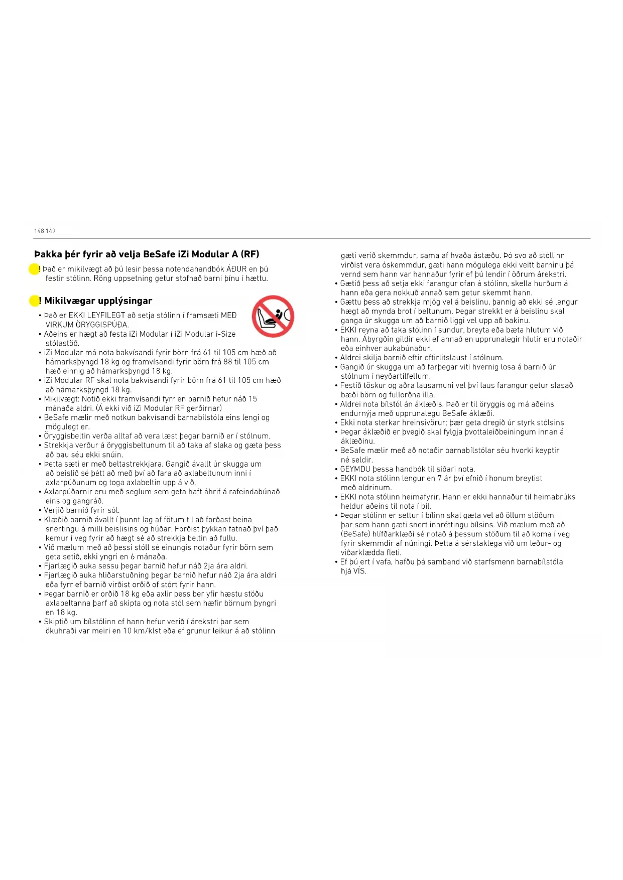 - Skiptið um bílstólinn ef hann hefur verið í árekstri þar sem ökuhraði var meiri en 10 km/klst eða ef grunur leikur á að stólinn Þakka þér fyrir að velja BeSafe iZi Modular A (RF) ! Það er mikilvægt að þú lesir þessa notendahandbók ÁÐUR en þú festir stólinn. Röng uppsetning getur stofnað barni þínu í hættu. gæti verið skemmdur, sama af hvaða ástæðu. Þó svo að stóllinn virðist vera óskemmdur, gæti hann mögulega ekki veitt barninu þá vernd sem hann var hannaður fyrir ef þú lendir í öðrum árekstri.