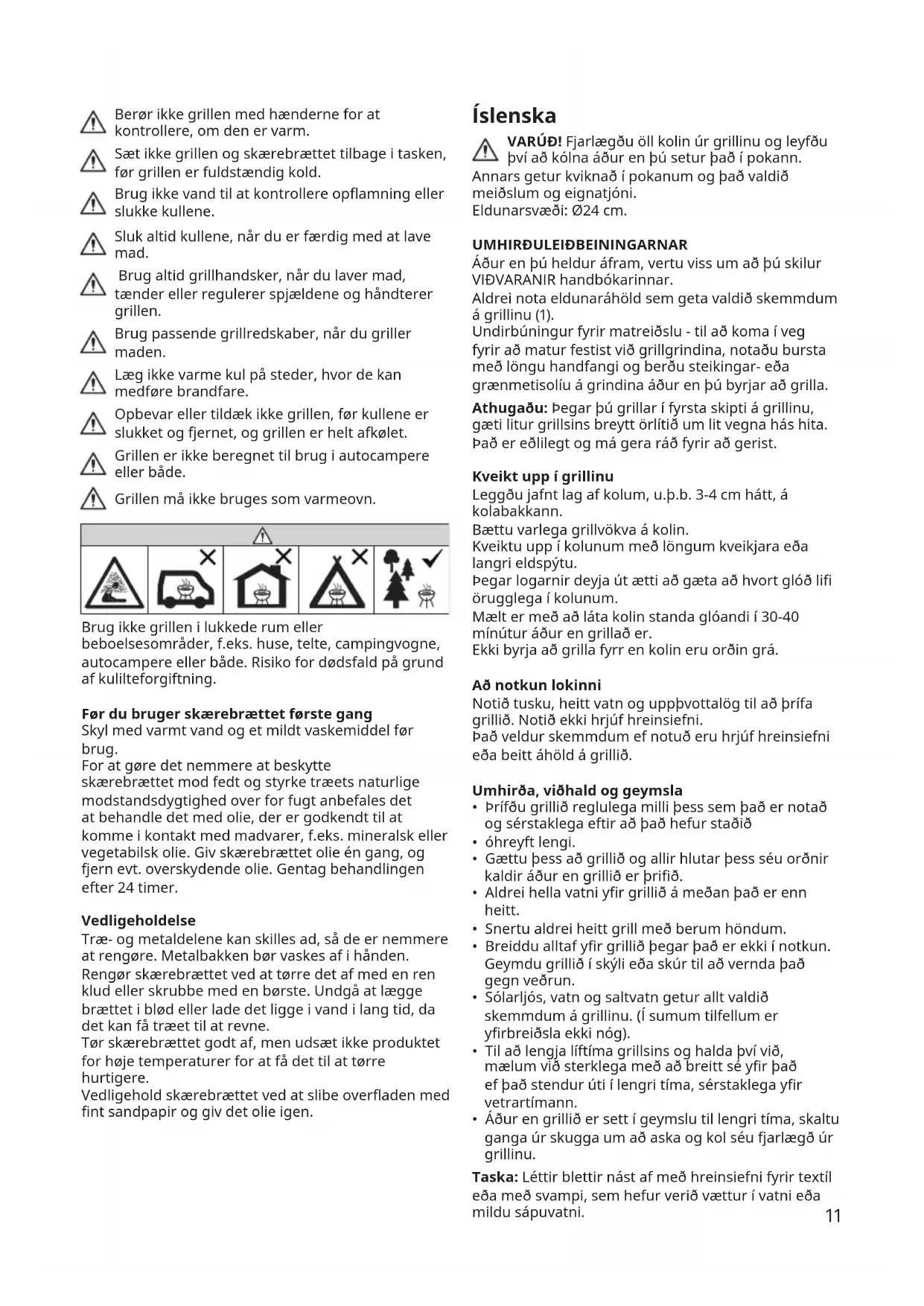 - Áður en grillið er sett í geymslu til lengri tíma, skaltu ganga úr skugga um að aska og kol séu fjarlægð úr grillinu. Taska:Léttir blettir nást af með hreinsiefni fyrir textíl eða með svampi, sem hefur verið vættur í vatni eða mildu sápuvatni.12 Notaðu ávallt vírgrindina eins og sýnt er í leiðbeiningunum þegar grillað er. Ekki nota vatn til að slökkva loga eða kæla niður notuð kol. Láttu kolin alltaf brenna upp eða slökkvið í glæðum að notkun lokinni. Notaðu alltaf grillhanska þegar kveikt er upp, grillað og loftræsting stillt. Notaðu viðeigandi grilláhöld við eldamennskuna. Ekki má losa heit kol á stöðum þar sem þau geta skapað eldhættu. Settu grillið ekki í geymslu eða undir ábreiðu fyrr en slokknað hefur í kolunum og þau hafa verið fjarlægð og grillið er orðið kalt. Þetta grill hentar ekki til notkunar í ferðabílum eða á bátum. Grillið ætti aldrei að nota sem hitara. Notaðu grillið aldrei á lokuðum eða þröngum svæðum eða á íbúðarhæfum svæðum eins og húsum, tjöldum, hjólhýsum, húsbílum, bátum. Hætta á kolsýringseitrun. Áðurenskurðarbrettiðernotaðífyrstaskipti Skolaðu með heitu vatni og mildu þvottaefni fyrir notkun. Það er auðveldara að halda vörum úr við hreinum og án tubletta ef þær eru meðhöndlaðar með olíu fyrir fyrstu notkun. Það bætir líka rakaþol viðarins. Notaðu olíu sem má komast í snertingu við mat, eins og jurtaolíu. Berðu eina umferð af olíu á vöruna og þurrkaðu alla umframolíu af. Endurtakið 24 klukkustundum síðar. Umhirðaskurðarbrettisins Hægt er að aðskilja málmhlutana frá viðarhlutunum til að auðvelda þrif. Málmbakkann þarf að þvo í höndunum. Þrífðu skurðarbrettið með hreinum klút eða skrúbbaðu það með bursta. Láttu skurðarbrettið ekki liggja í bleyti og ekki skilja það eftir í vatni í lengir tíma. Það getur valdið því að viðurinn klofnar. Þurrkaðu brettið vandlega en ekki hita það til að ýta fyrir. Til að meðhöndla brettið er hægt að pússa það með meðalgrófum sandpappír og olíubera það. VARÚÐ Ef þeim viðvörunum sem taldar eru upp hér í leiðbeiningunum er ekki fylgt eftir, getur það leitt til alvarlegra líkamsáverka eða banaslysa, eða valdið eignaspjöllum vegna elds eða sprengingar. Öryggistákn ( ) gefa til kynna mikilvægar öryggisupplýsingar. Vöruna MÁ AÐEINS NOTA UTANDYRA. Notist ALDREI í lokuðu rými eins og bílskýli, bílskúr, lokuðum palli, garðskýli eða undir hvers konar yrbyggingu. Yrfylltu grillið ekki af kolum og láttu kolin ekki snerta ytri skel grillsins. Grillið ætti að vera sett saman á öruggan hátt fyrir notkun Snertu aldrei heita hluta grillsins með berum höndum. Ekki nota innandyra! Notkun innandyra getur orðið til þess að eitraðar lofttegundir safnist upp og valdi líkamstjóni eða jafnvel bana. Notaðu aðeins utandyra á vel loftræstu svæði. Ekki nota inni í bílskúrum, byggingum eða í öðru lokuðu rými. Ekki setja kolagrillið og skurðarbrettið aftur í pokann fyrr en grillið hefur kólnað alveg. ATHUGAÐU! Þetta grill má aldrei nota undir eldmri yrbyggingu. VARÚÐ! Grillið verður mjög heitt. Ekki að færa það til meðan það er í notkun. VARÚÐ! Haltu börnum og gæludýrum í öruggri fjarlægð. Hvers kyns breytingar á grillinu geta reynst hættulegar. Aldrei skilja grillið eftir eftirlitslaust þegar það er í notkun. Fylgdu ávallt leiðbeiningum um þrif og umhirðu og sinnið viðhaldi reglulega. Þegar grillinu er komið fyrir þarf að gæta þess að það sé í að minnsta kosti eins metra fjarlægð frá eldmum efnum eða byggingum. Ekki bæta grillvökva, eða kolum sem vætt hafa verið með grillvökva, á heit kol. Fjarlægðu ekki ösku fyrr en öll kol hafa brunnið upp og grillið er orðið kalt. Varastu að vera í fatnaði með löngum og víðum ermum þegar grillað er. Ekki nota grillið í miklum vindi. Ekki snerta grillið til að athuga hvort það sé orðið heitt.13 ADVARSEL Å unnlate å lese denne bruksanvisningen eller å ikke følge sikkerhetsadvarslene i den, kan resultere i alvorlige skader eller død, brann eller eksplosjon som gir skade på eiendom. Sikkerhetssymboler ( ) indikerer viktig sikkerhetsinformasjon. Dette produktet er KUN BEREGNET FOR UTENDØRS BRUK. Bruk det ALDRI i et avgrenset område, som en åpen carport, garasje, veranda, terrasse med persienner, eller under noen som helst overbygning. Ikke fyll grillenristen helt opp med kull og sørg for at kull ikke kommer i kontakt med grillens vegger. Denne grillen må kun brukes på en at, jevn ikke-brennbar overate. Håndter aldri varme deler med ubeskyttede hender. Skal ikke brukes innendørs. Dersom den brukes innendørs, kan det bygge seg opp giftige avgasser som kan forårsake skade eller død. Brukes kun utendørs i et godt ventilert område. Skal ikke brukes i garasje, bygning, overdekt passasje eller noe annet innelukket område. Bruk alltid stativet som vist i monteringsanvisningen når du lager mat. MERK! Denne grillen skal ikke brukes under noen form for brennbar konstruksjon. ADVARSEL! Denne grillen vil bli svært varm, ikke forsøk å ytte den under bruk. ADVARSEL! Hold barn og husdyr unna. Enhver endring av denne grillen kan være farlig. Ikke la denne grillen være uten tilsyn under bruk. Følg alltid vedlikeholdsinstruksjonene – og vedlikehold grillen regelmessig. Når du gjør grillen klar, sørg for at den har minst 1 meter avstand til brennbare gjenstander eller strukturer. Ikke tilsett tennvæske eller grill tilsatt tennvæske til varm eller glødende kull. Ikke fjern asken før kullet har brent helt ut, og grillen er fullstendig avkjølt. Ikke bruk klær med lange eller løse ermer når du griller. Ikke bruk grillen i sterk vind. Ikke ta på grillen for å sjekke om den er varm. Ikke legg grillen og skjærefjøla tilbake i pose
