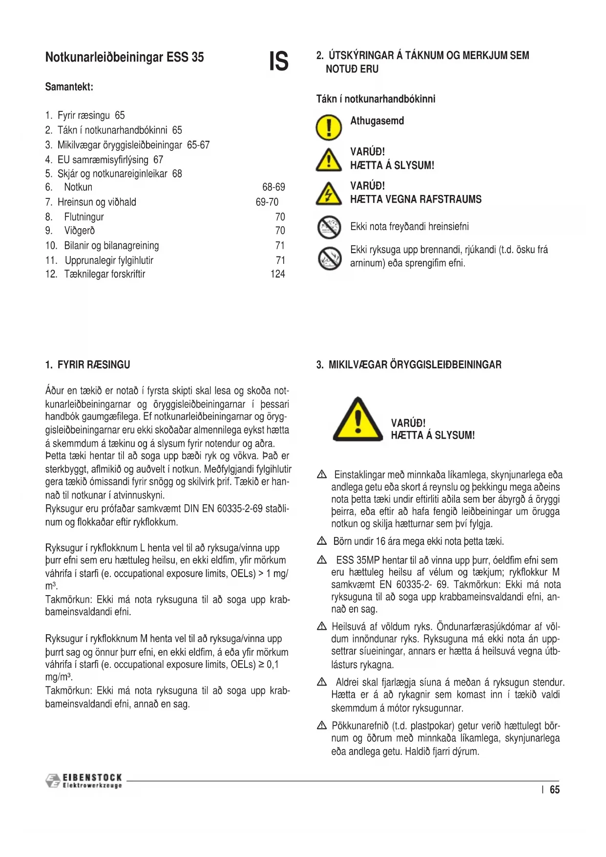 Áður en tækið er notað í fyrsta skipti skal lesa og skoða not- kunarleiðbeiningarnar og öryggisleiðbeiningarnar í þessari handbók gaumgælega. Ef notkunarleiðbeiningarnar og öryg- gisleiðbeiningarnar eru ekki skoðaðar almennilega eykst hætta á skemmdum á tækinu og á slysum fyrir notendur og aðra. Þetta tæki hentar til að soga upp bæði ryk og vökva. Það er sterkbyggt, amikið og auðvelt í notkun. Meðfylgjandi fylgihlutir gera tækið ómissandi fyrir snögg og skilvirk þrif. Tækið er han- nað til notkunar í atvinnuskyni. Ryksugur eru prófaðar samkvæmt DIN EN 60335-2-69 staðli- num og okkaðar eftir rykokkum. Ryksugur í rykokknum L henta vel til að ryksuga/vinna upp þurr efni sem eru hættuleg heilsu, en ekki eldm, yr mörkum váhrifa í star (e. occupational exposure limits, OELs) > 1 mg/ m³. Takmörkun: Ekki má nota ryksuguna til að soga upp krab- bameinsvaldandi efni. Ryksugur í rykokknum M henta vel til að ryksuga/vinna upp þurrt sag og önnur þurr efni, en ekki eldm, á eða yr mörkum váhrifa í star (e. occupational exposure limits, OELs) ≥ 0,1 mg/m³. Takmörkun: Ekki má nota ryksuguna til að soga upp krab- bameinsvaldandi efni, annað en sag. Notkunarleiðbeiningar ESS 35 Samantekt:
