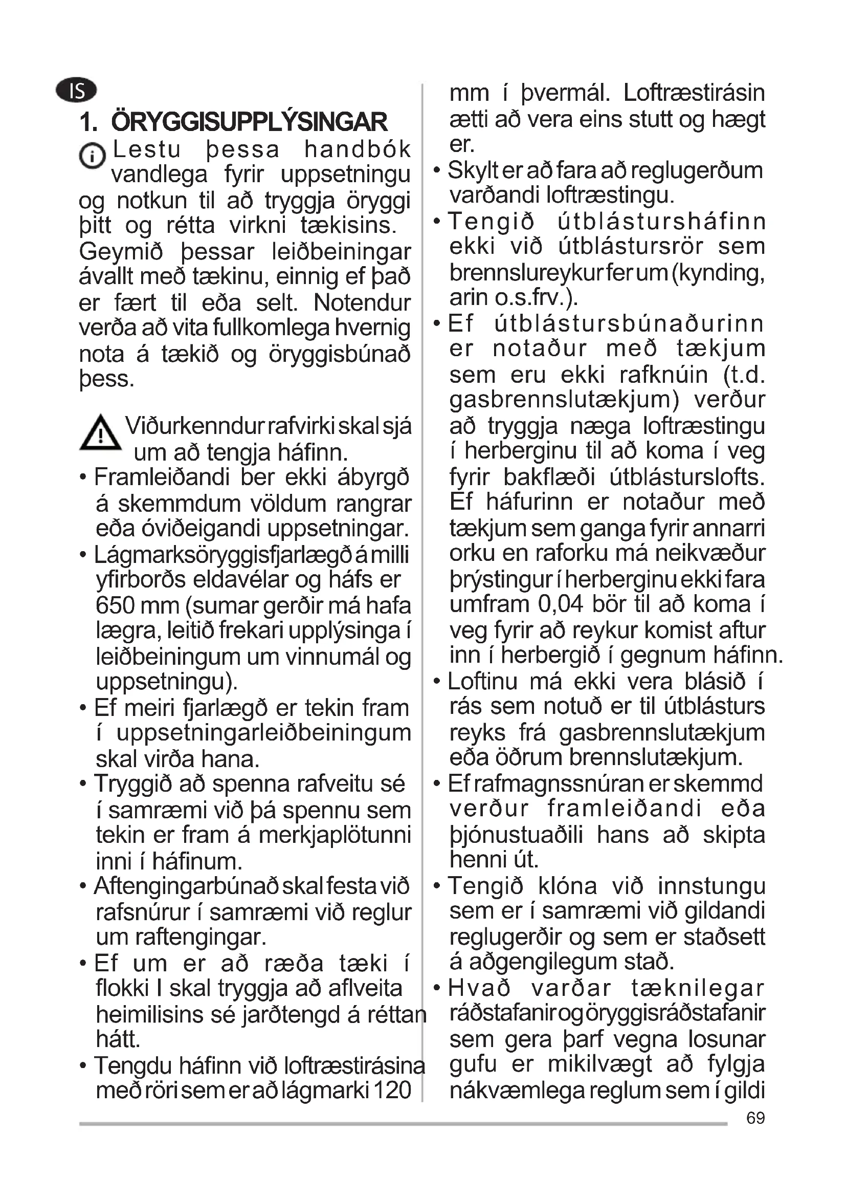 - Loftinu má ekki vera blásið í rás sem notuð er til útblásturs reyks frá gasbrennslutækjum eða öðrum brennslutækjum.