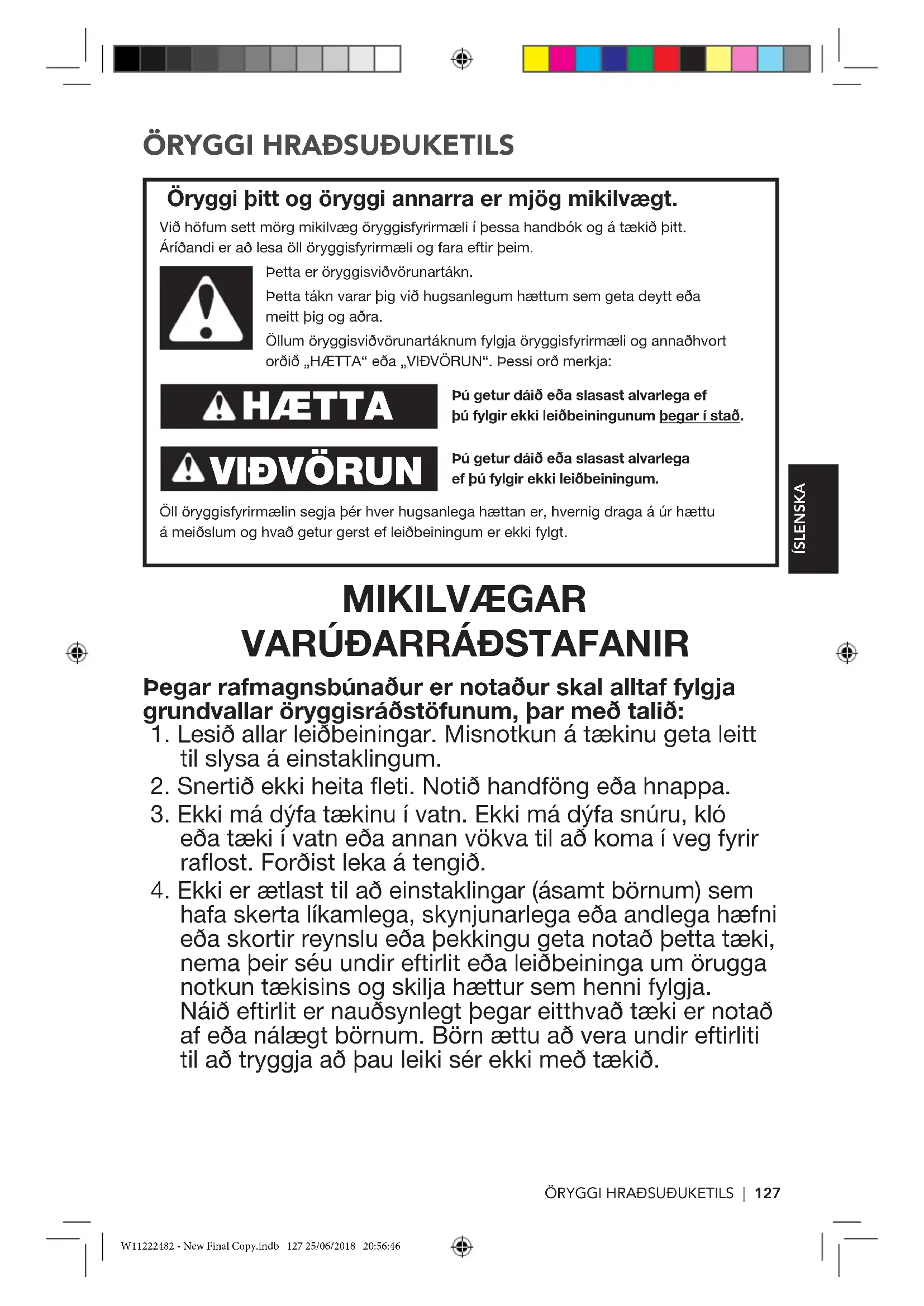 W11222482 - New Final Copy.indb 130 25/06/2018 20:56:46ÖRYGGI HRAÐSUÐUKETILS | 131 ÍSLENSKA RAFMAGNSKRÖFUR Hætta á raosti Stingið inn í jarðtengda innstungu. Ekki fjarlægja jarðtenginguna. Ekki nota millistykki. Ekki nota framlengingarsnúru. Misbrestur á að fylgja þessum leiðbeiningum getur leitt til dauða, eldsvoða eða raosts.