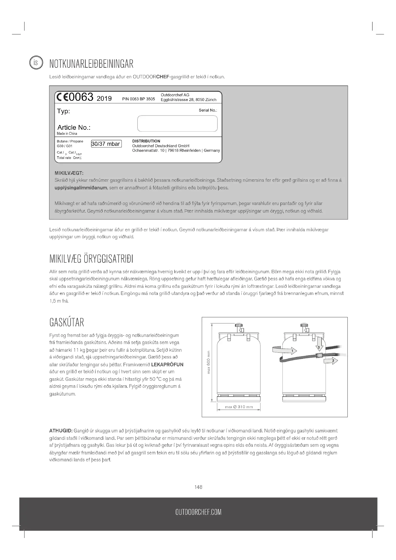 NOTKUNARLEIÐBEININGAR 148 Lesið leiðbeiningarnar vandlega áður en OUTDOORCHEF gasgrillið er tekið í notkun.OUTDOORCHEF.COM