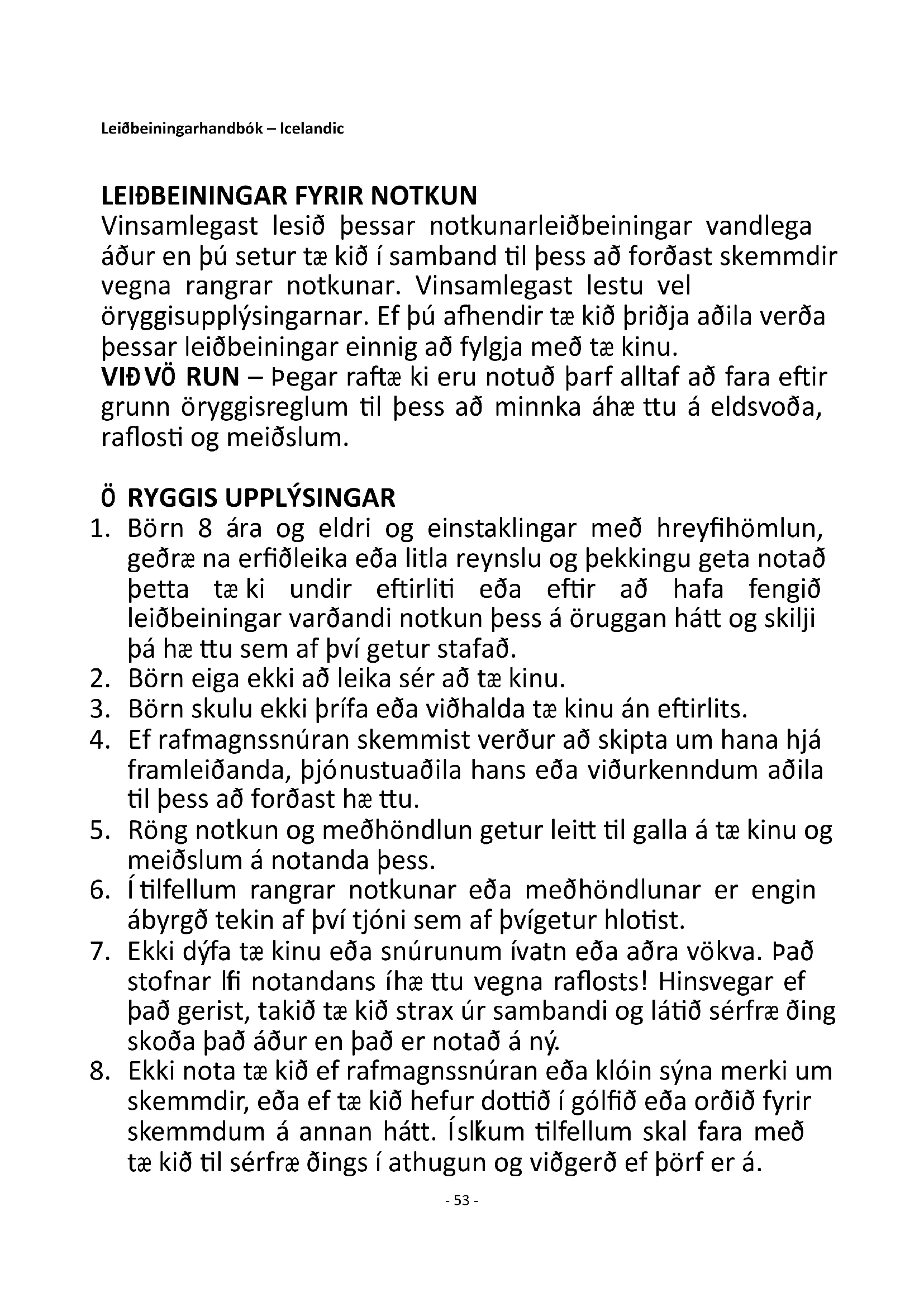 Vinsamlegast lesið þessar notkunarleiðbeiningar vandlega áður en þú setur tæ kið í samband til þess að forðast skemmdir vegna rangrar notkunar. Vinsamlegast lestu vel öryggisupplýsingarnar. Ef þú afhendir tæ kið þriðja aðila verða þessar leiðbeiningar einnig að fylgja með tæ kinu. VIÐVÖ RUN – Þegar raftæ ki eru notuð þarf alltaf að fara eftir grunn öryggisreglum til þess að minnka áhæ ttu á eldsvoða, raflosti og meiðslum.