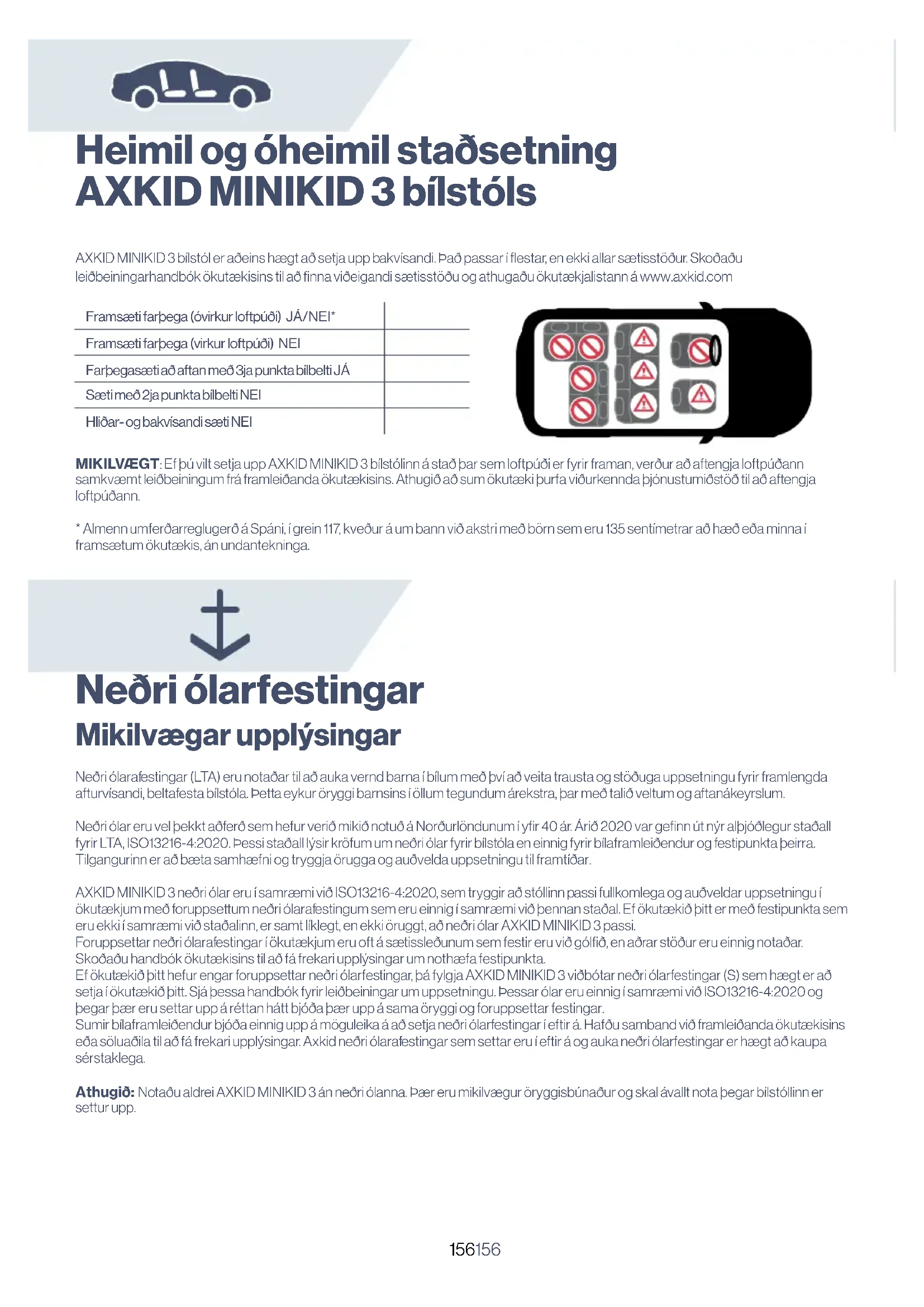 - Almenn umferðarreglugerð á Spáni, í grein 117, kveður á um bann við akstri með börn sem eru 135 sentímetrar að hæð eða minna í framsætum ökutækis, án undantekninga. Neðri ólarfestingar Mikilvægar upplýsingar Neðri ólarafestingar (LTA) eru notaðar til að auka vernd barna í bílum með því að veita trausta og stöðuga uppsetningu fyrir framlengda afturvísandi, beltafesta bílstóla. Þetta eykur öryggi barnsins í öllum tegundum árekstra, þar með talið veltum og aftanákeyrslum. Neðri ólar eru vel þekkt aðferð sem hefur verið mikið notuð á Norðurlöndunum í yfir 40 ár. Árið 2020 var gefinn út nýr alþjóðlegur staðall fyrir LTA, ISO13216-4:2020. Þessi staðall lýsir kröfum um neðri ólar fyrir bílstóla en einnig fyrir bílaframleiðendur og festipunkta þeirra. Tilgangurinn er að bæta samhæfni og tryggja örugga og auðvelda uppsetningu til framtíðar. AXKID MINIKID 3 neðri ólar eru í samræmi við ISO13216-4:2020, sem tryggir að stóllinn passi fullkomlega og auðveldar uppsetningu í ökutækjum með foruppsettum neðri ólarafestingum sem eru einnig í samræmi við þennan staðal. Ef ökutækið þitt er með festipunkta sem eru ekki í samræmi við staðalinn, er samt líklegt, en ekki öruggt, að neðri ólar AXKID MINIKID 3 passi. Foruppsettar neðri ólarafestingar í ökutækjum eru oft á sætissleðunum sem festir eru við gólfið, en aðrar stöður eru einnig notaðar. Skoðaðu handbók ökutækisins til að fá frekari upplýsingar um nothæfa festipunkta. Ef ökutækið þitt hefur engar foruppsettar neðri ólarfestingar, þá fylgja AXKID MINIKID 3 viðbótar neðri ólarfestingar (S) sem hægt er að setja í ökutækið þitt. Sjá þessa handbók fyrir leiðbeiningar um uppsetningu. Þessar ólar eru einnig í samræmi við ISO13216-4:2020 og þegar þær eru settar upp á réttan hátt bjóða þær upp á sama öryggi og foruppsettar festingar. Sumir bílaframleiðendur bjóða einnig upp á möguleika á að setja neðri ólarfestingar í eftir á. Hafðu samband við framleiðanda ökutækisins eða söluaðila til að fá frekari upplýsingar. Axkid neðri ólarafestingar sem settar eru í eftir á og auka neðri ólarfestingar er hægt að kaupa sérstaklega. Athugið: Notaðu aldrei AXKID MINIKID 3 án neðri ólanna. Þær eru mikilvægur öryggisbúnaður og skal ávallt nota þegar bílstóllinn er settur upp.157157
