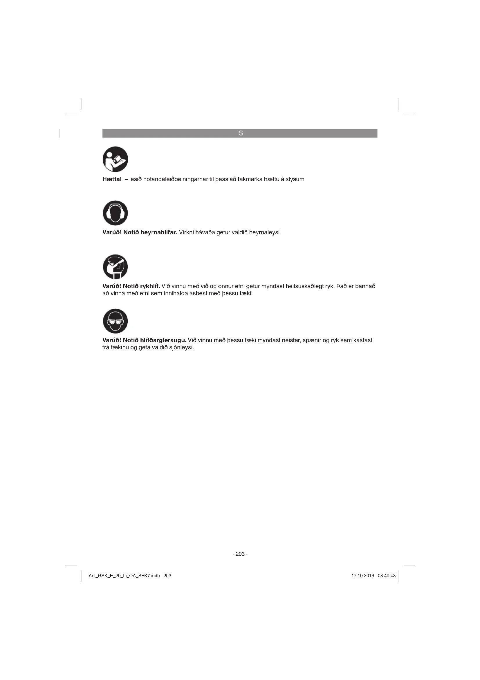 Hætta! – lesið notandaleiðbeiningarnar til þess að takmarka hættu á slysum Varúð! Notið heyrnahlífar. Virkni hávaða getur valdið heyrnaleysi. Varúð! Notið hlífðargleraugu. Við vinnu með þessu tæki myndast neistar, spænir og ryk sem kastast frá tækinu og geta valdið sjónleysi. Varúð! Notið rykhlíf. Við vinnu með við og önnur efni getur myndast heilsuskaðlegt ryk. Það er bannað að vinna með efni sem innihalda asbest með þessu tæki! Anl_GSK_E_20_Li_OA_SPK7.indb 203Anl_GSK_E_20_Li_OA_SPK7.indb 203 17.10.2016 08:40:4317.10.2016 08:40:43IS